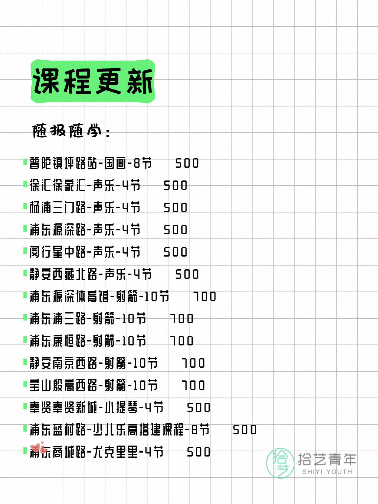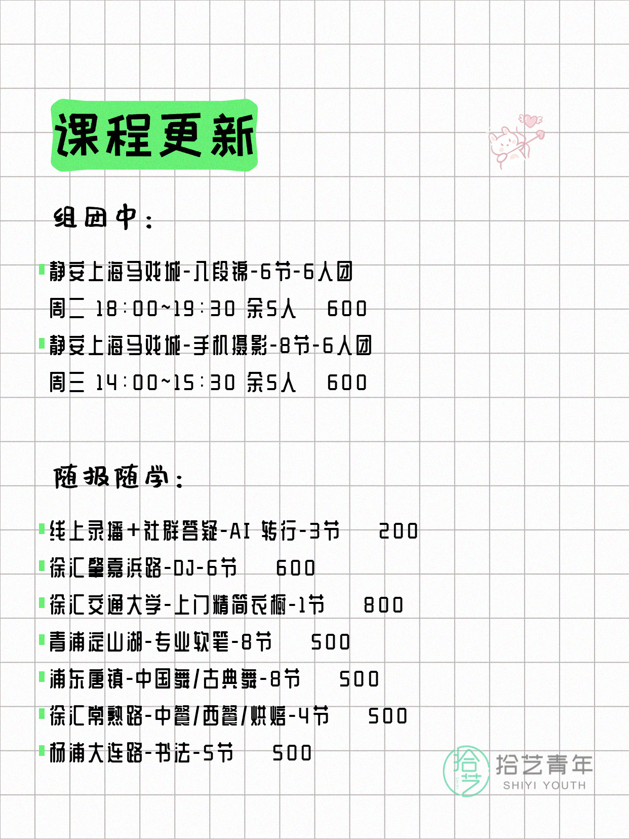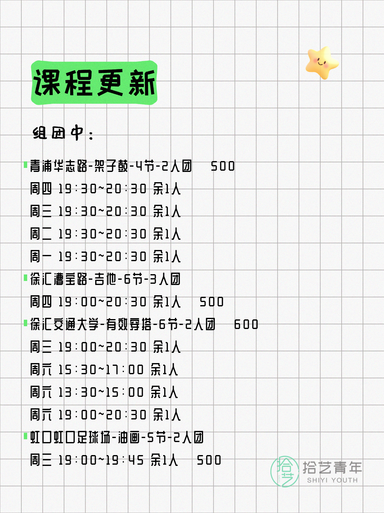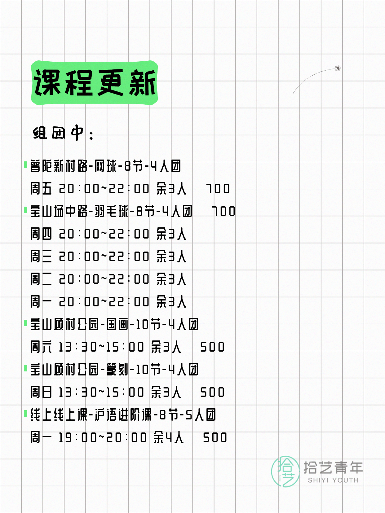 资讯>综合>正文4月17日上海夜校课程合集拾艺青年2026-04-171 / 17📊 本期课程概况• 总课程数:453门• 组团中课程:92门• 覆盖区域:15个区详见图片,欢迎报名咨询。💡 提示:以上课程信息来自拾艺青年小程序,课程可能随报名动态变化,具体以小程序实时信息为准。👉 微信小程序链接:#小程序://拾艺青年/WmfwH22mnQUxZwb