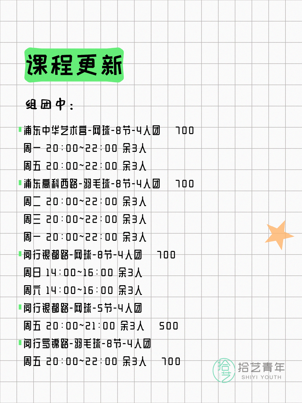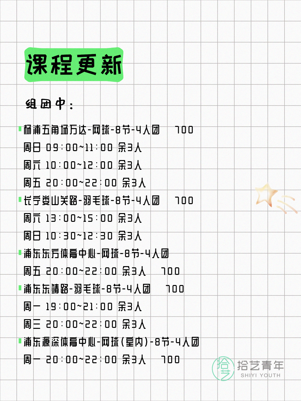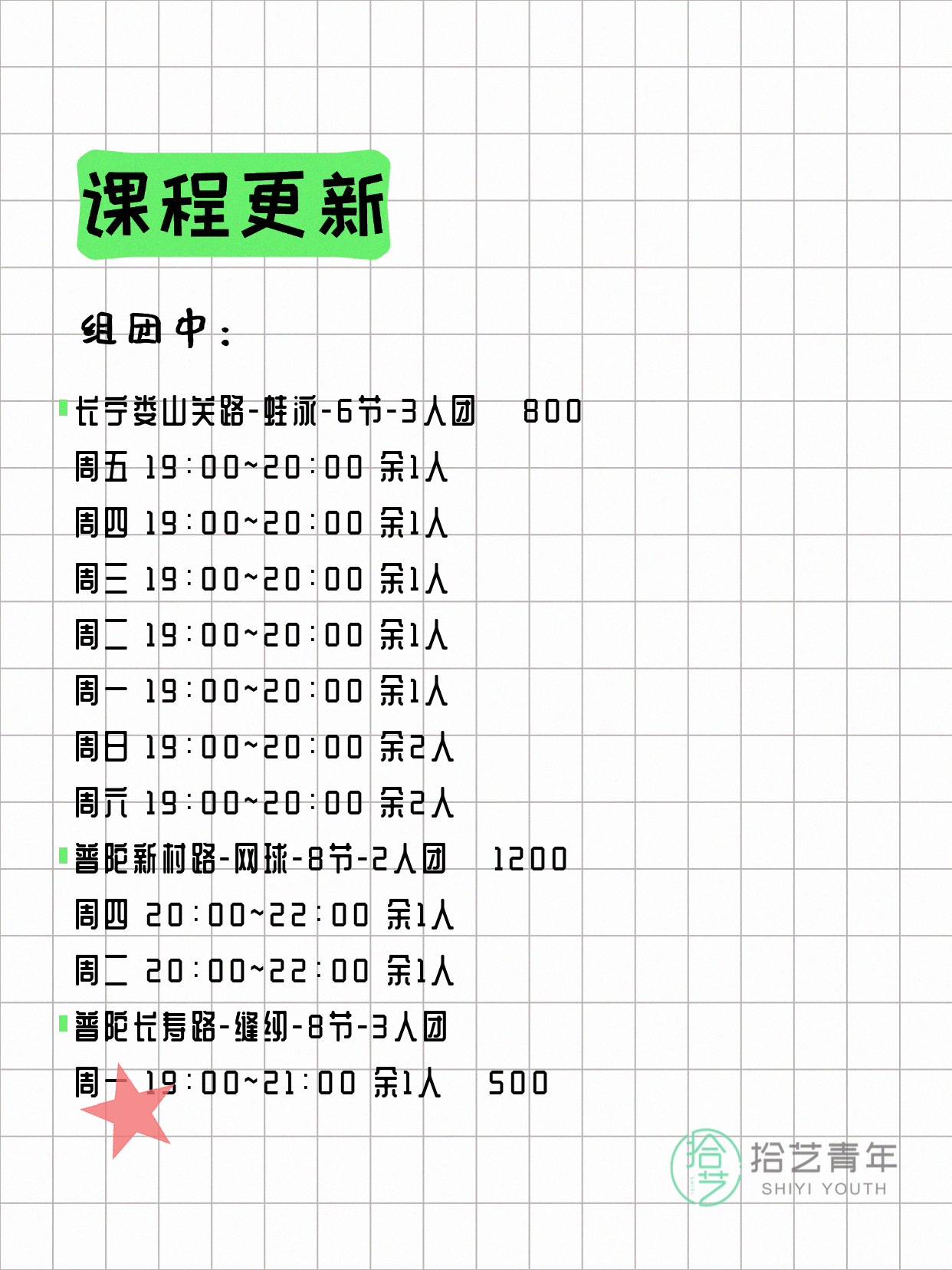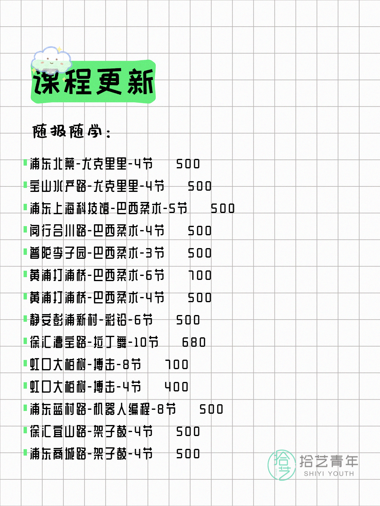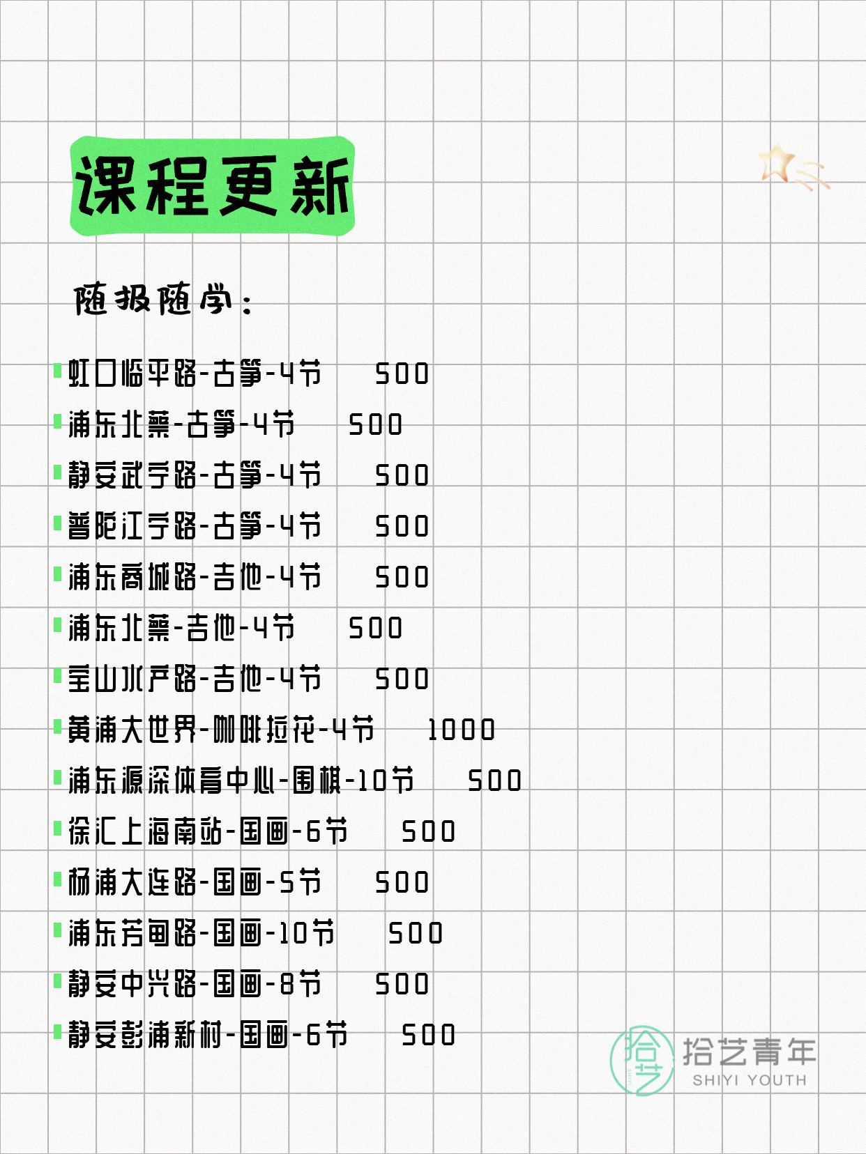 资讯>综合>正文4月17日上海夜校课程合集拾艺青年2026-04-171 / 17📊 本期课程概况• 总课程数:453门• 组团中课程:92门• 覆盖区域:15个区详见图片,欢迎报名咨询。💡 提示:以上课程信息来自拾艺青年小程序,课程可能随报名动态变化,具体以小程序实时信息为准。👉 微信小程序链接:#小程序://拾艺青年/WmfwH22mnQUxZwb