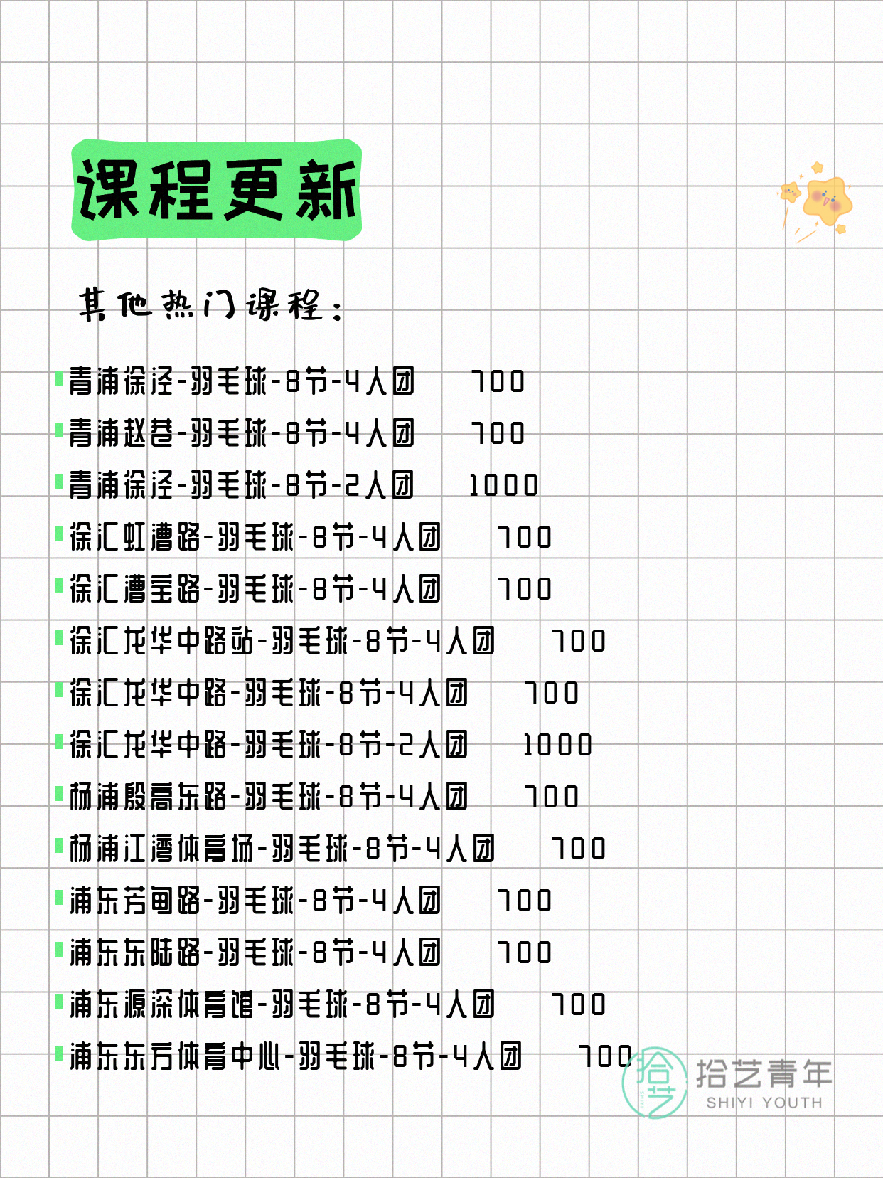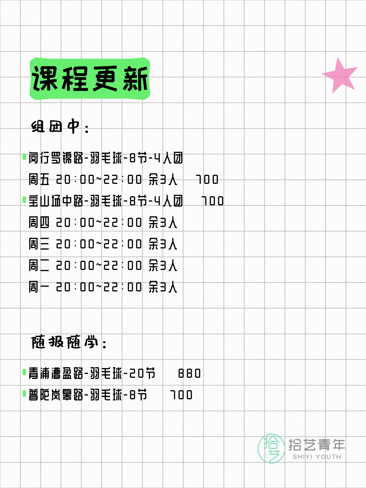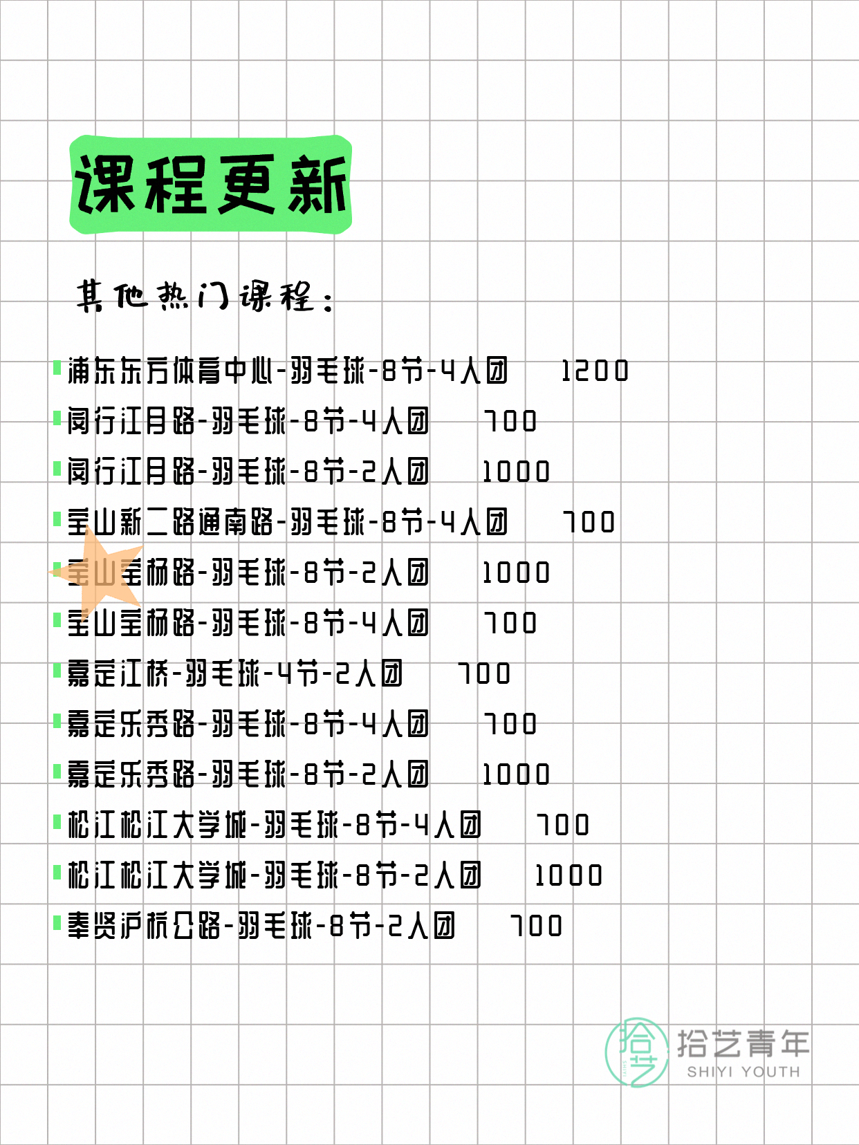 ⭐ 羽毛球-宝山宝杨路-8节-4人团 💰700