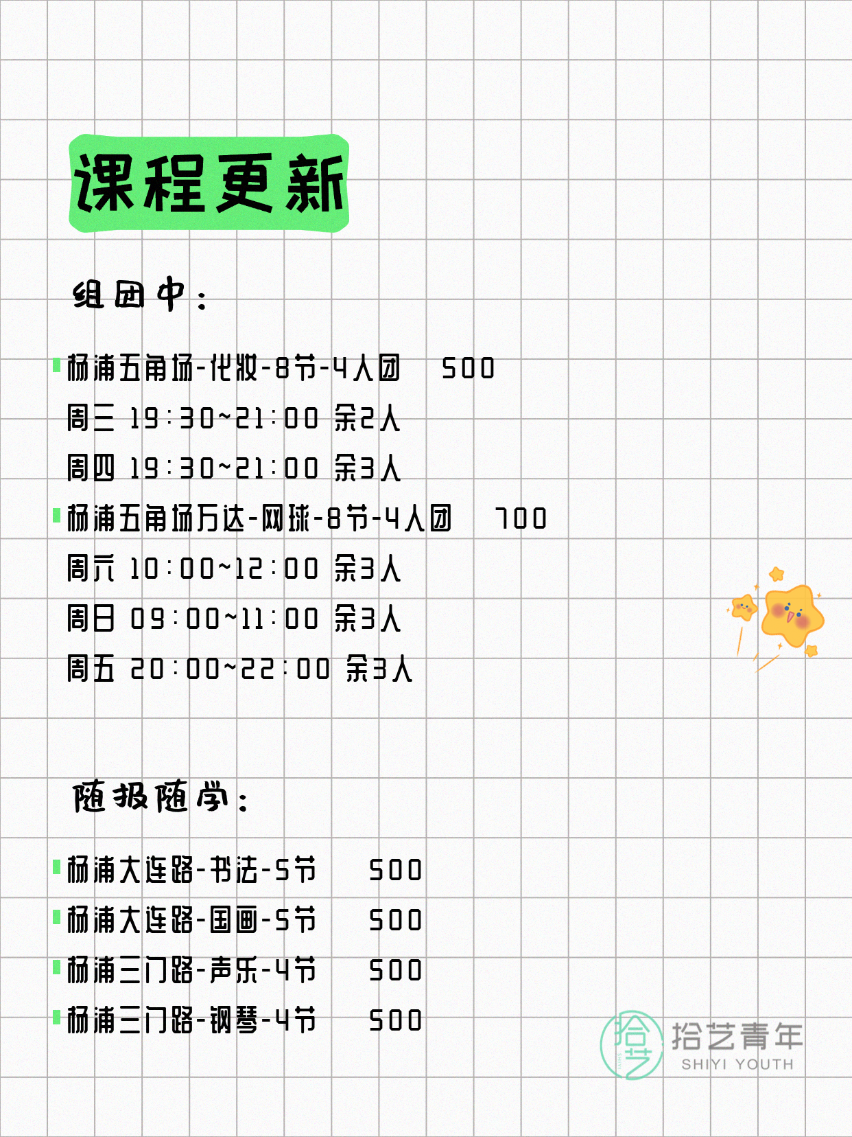 💡 提示:以上课程信息来自拾艺青年小程序,课程可能随报名动态变化,具体以小程序实时信息为准。