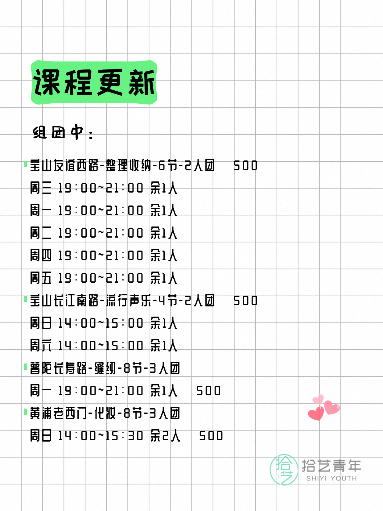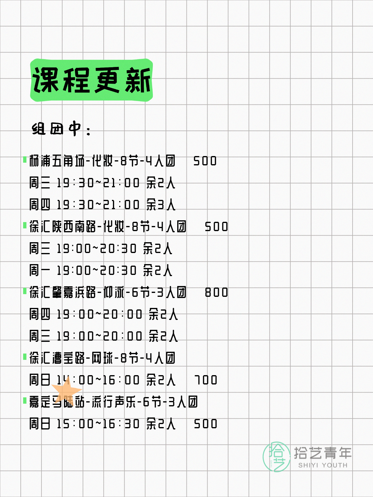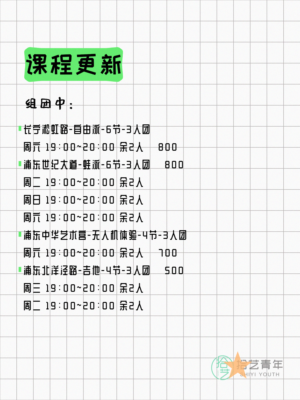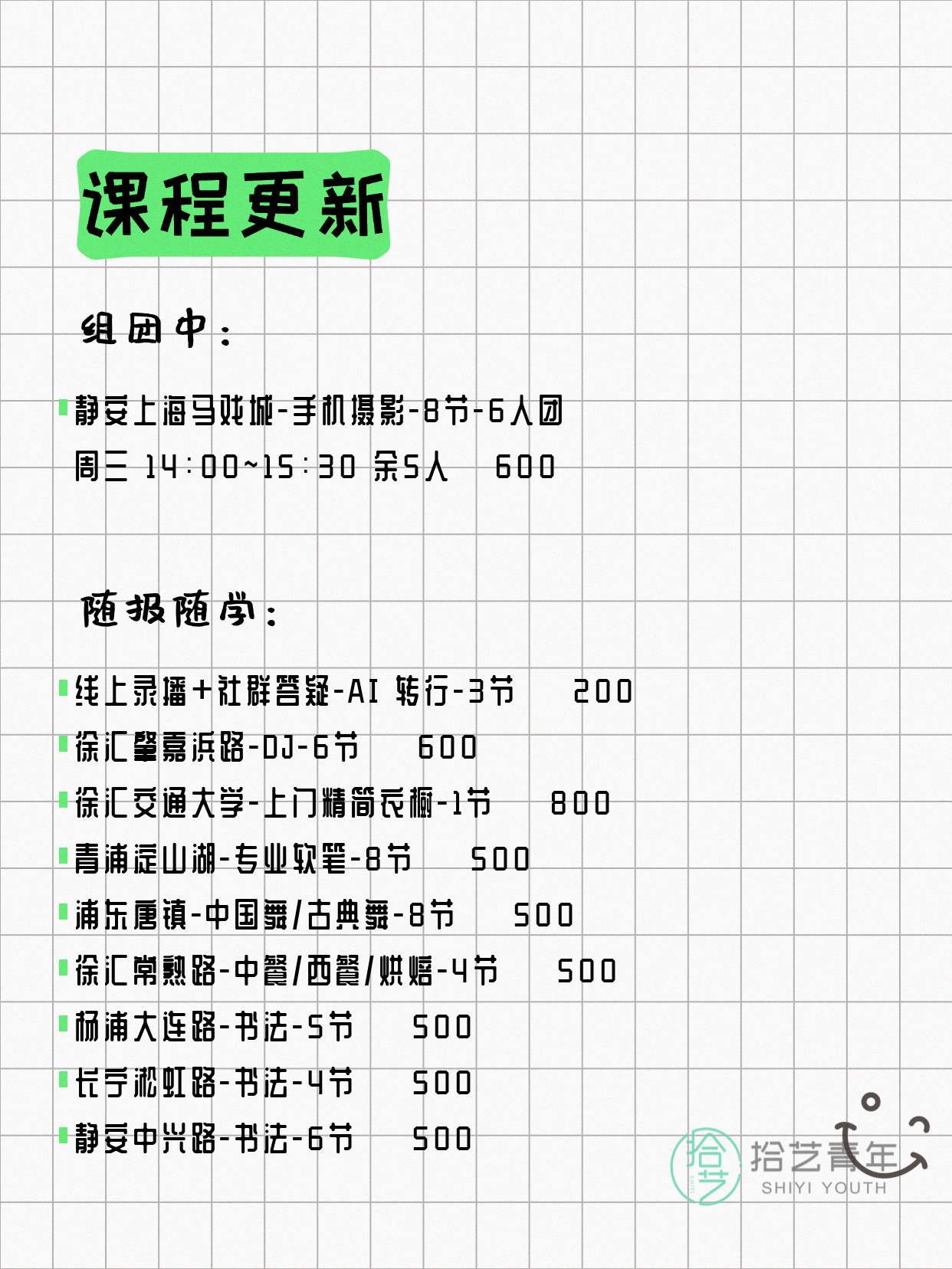 资讯>综合>正文4月18日上海夜校课程合集拾艺青年2026-04-181 / 17📊 本期课程概况• 总课程数:454门• 组团中课程:93门• 覆盖区域:15个区详见图片,欢迎报名咨询。💡 提示:以上课程信息来自拾艺青年小程序,课程可能随报名动态变化,具体以小程序实时信息为准。👉 微信小程序链接:#小程序://拾艺青年/WmfwH22mnQUxZwb