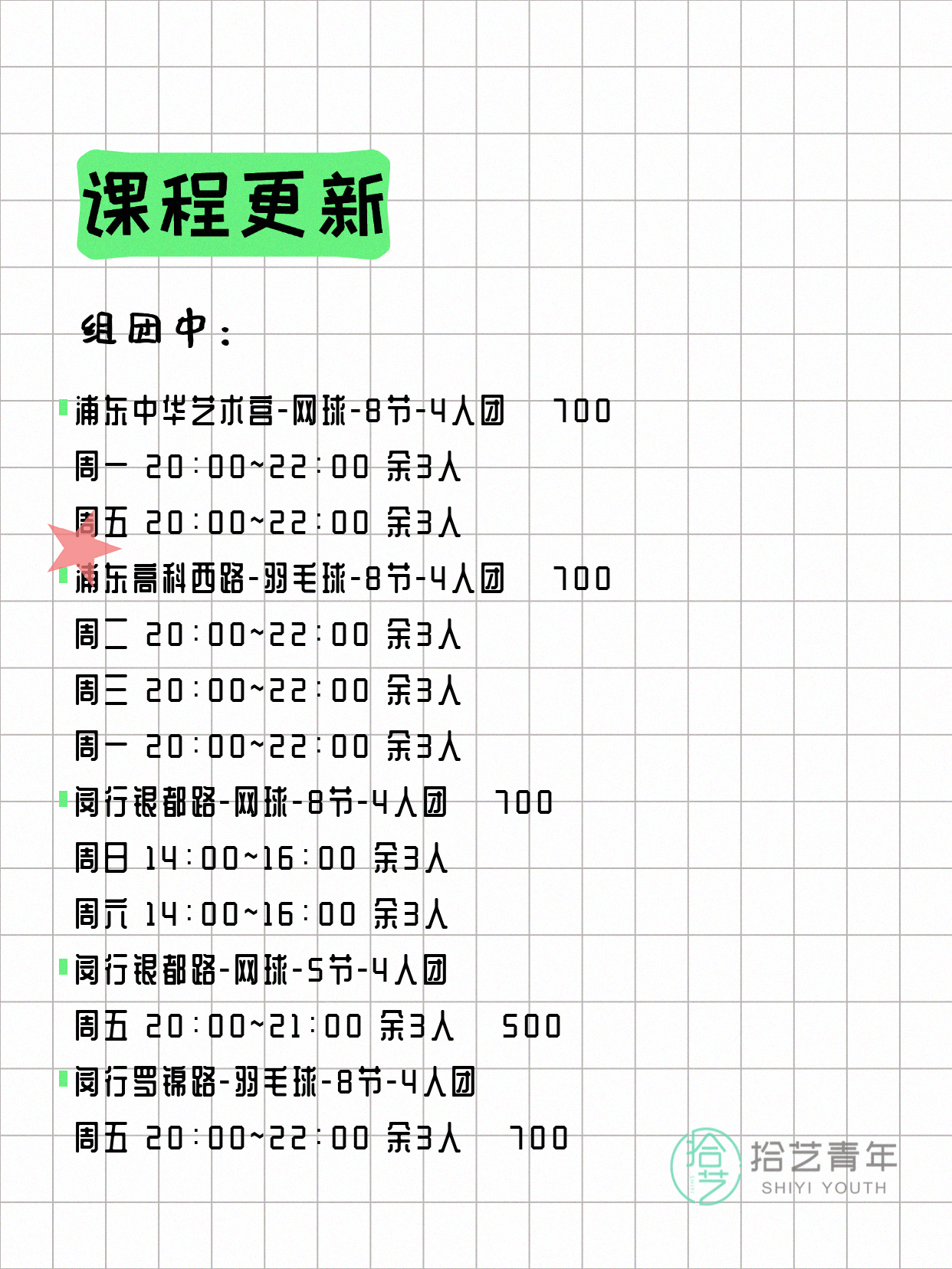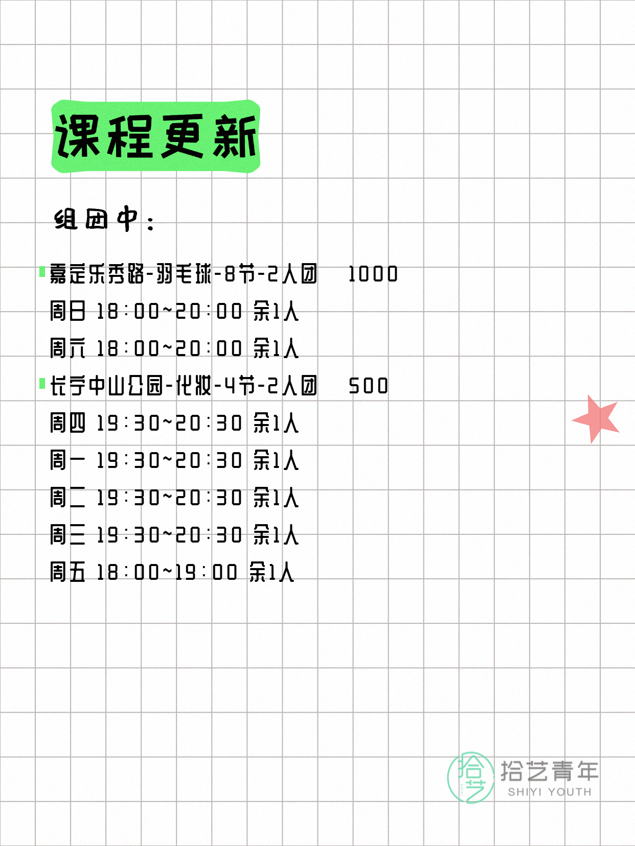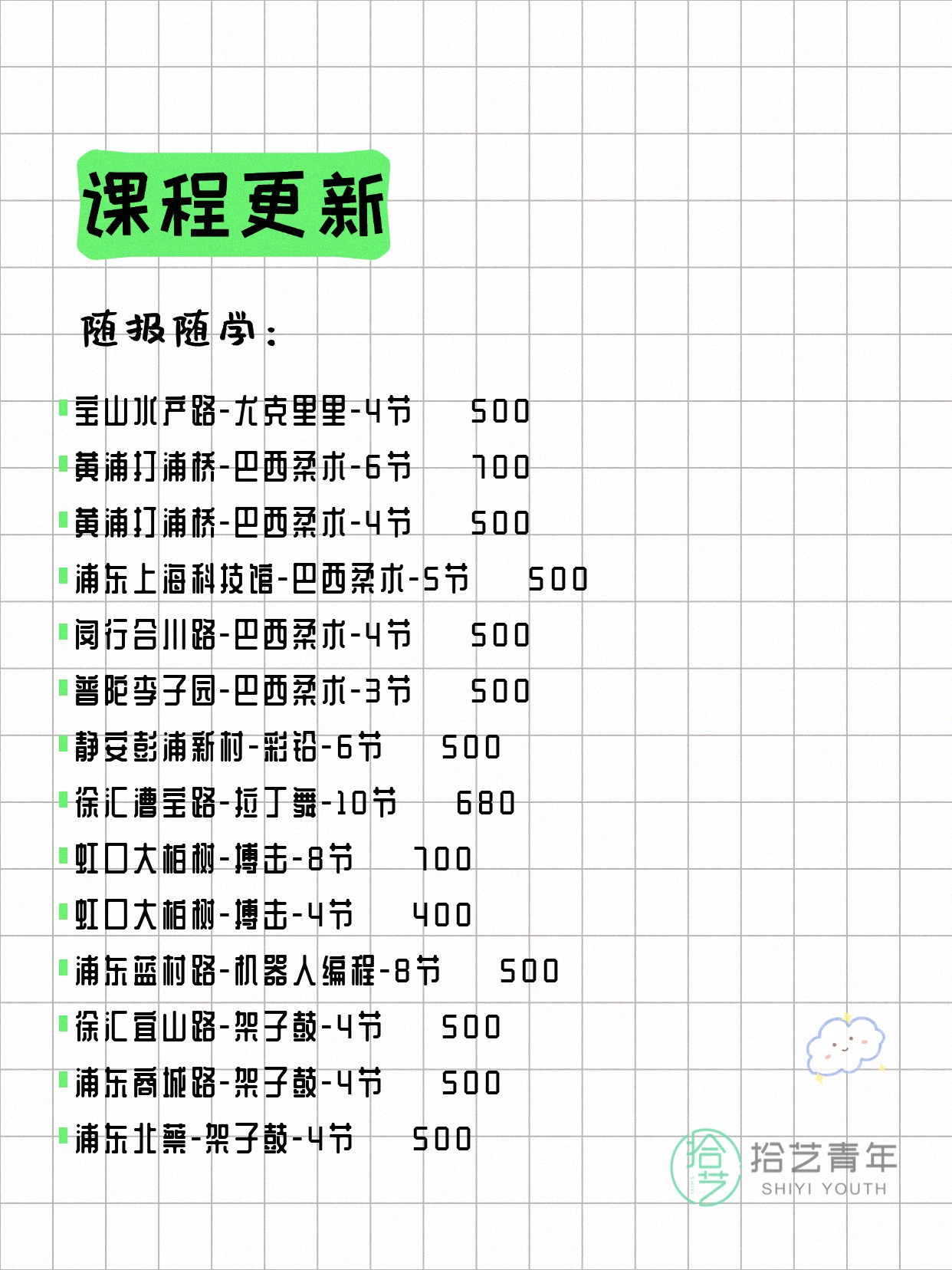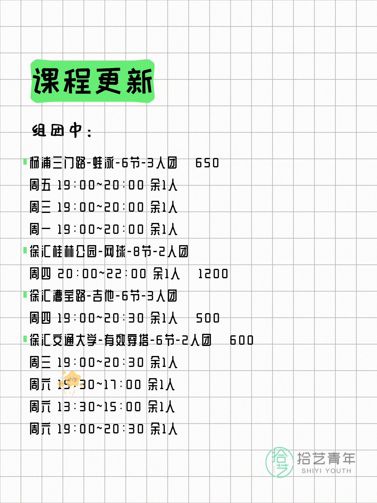 资讯>综合>正文4月18日上海夜校课程合集拾艺青年2026-04-181 / 17📊 本期课程概况• 总课程数:454门• 组团中课程:93门• 覆盖区域:15个区详见图片,欢迎报名咨询。💡 提示:以上课程信息来自拾艺青年小程序,课程可能随报名动态变化,具体以小程序实时信息为准。👉 微信小程序链接:#小程序://拾艺青年/WmfwH22mnQUxZwb