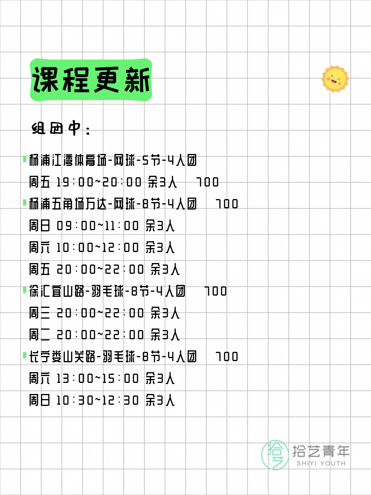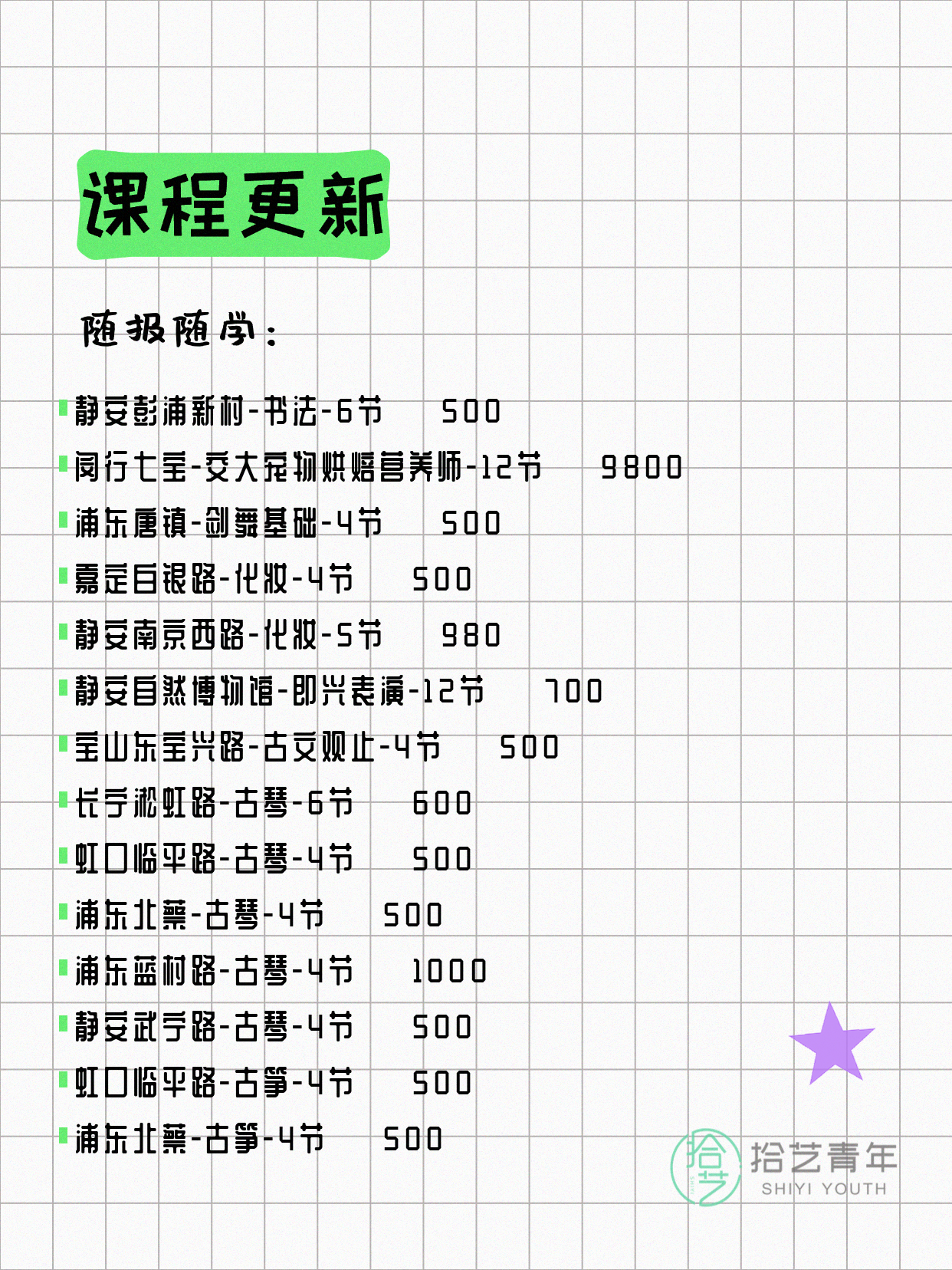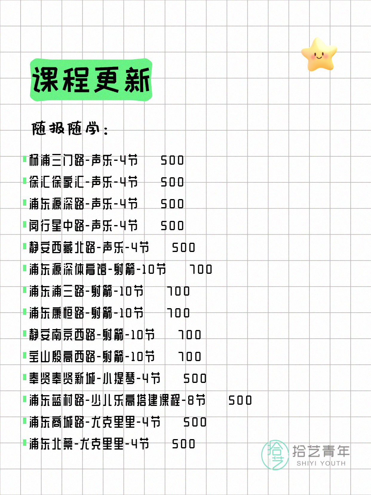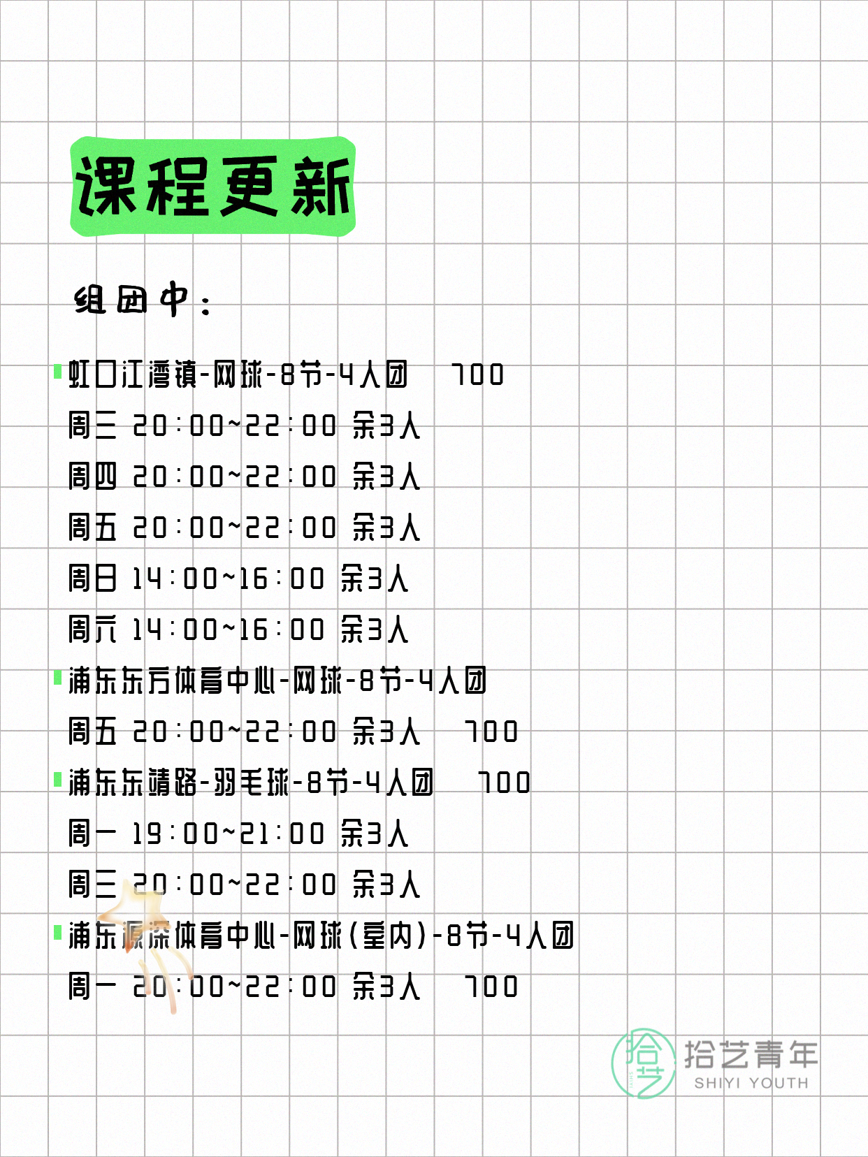 资讯>综合>正文4月18日上海夜校课程合集拾艺青年2026-04-181 / 17📊 本期课程概况• 总课程数:454门• 组团中课程:93门• 覆盖区域:15个区详见图片,欢迎报名咨询。💡 提示:以上课程信息来自拾艺青年小程序,课程可能随报名动态变化,具体以小程序实时信息为准。👉 微信小程序链接:#小程序://拾艺青年/WmfwH22mnQUxZwb
