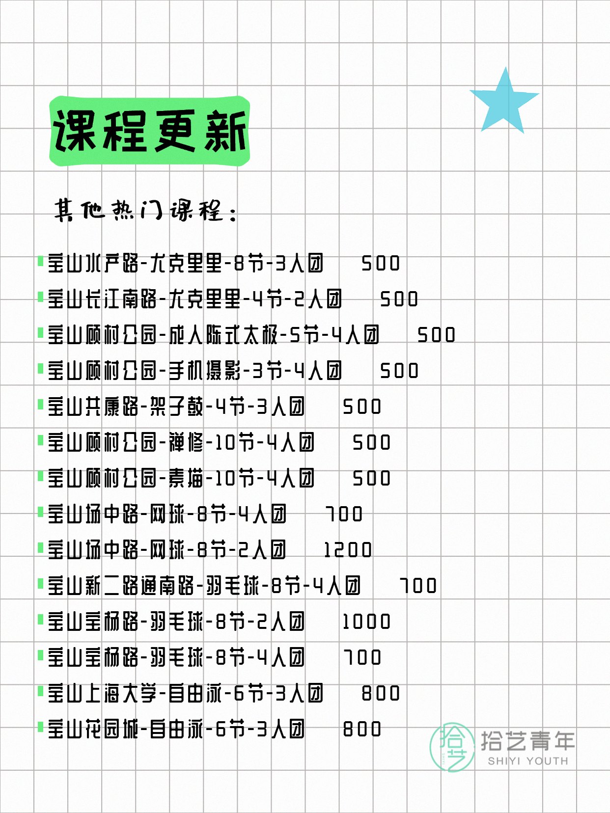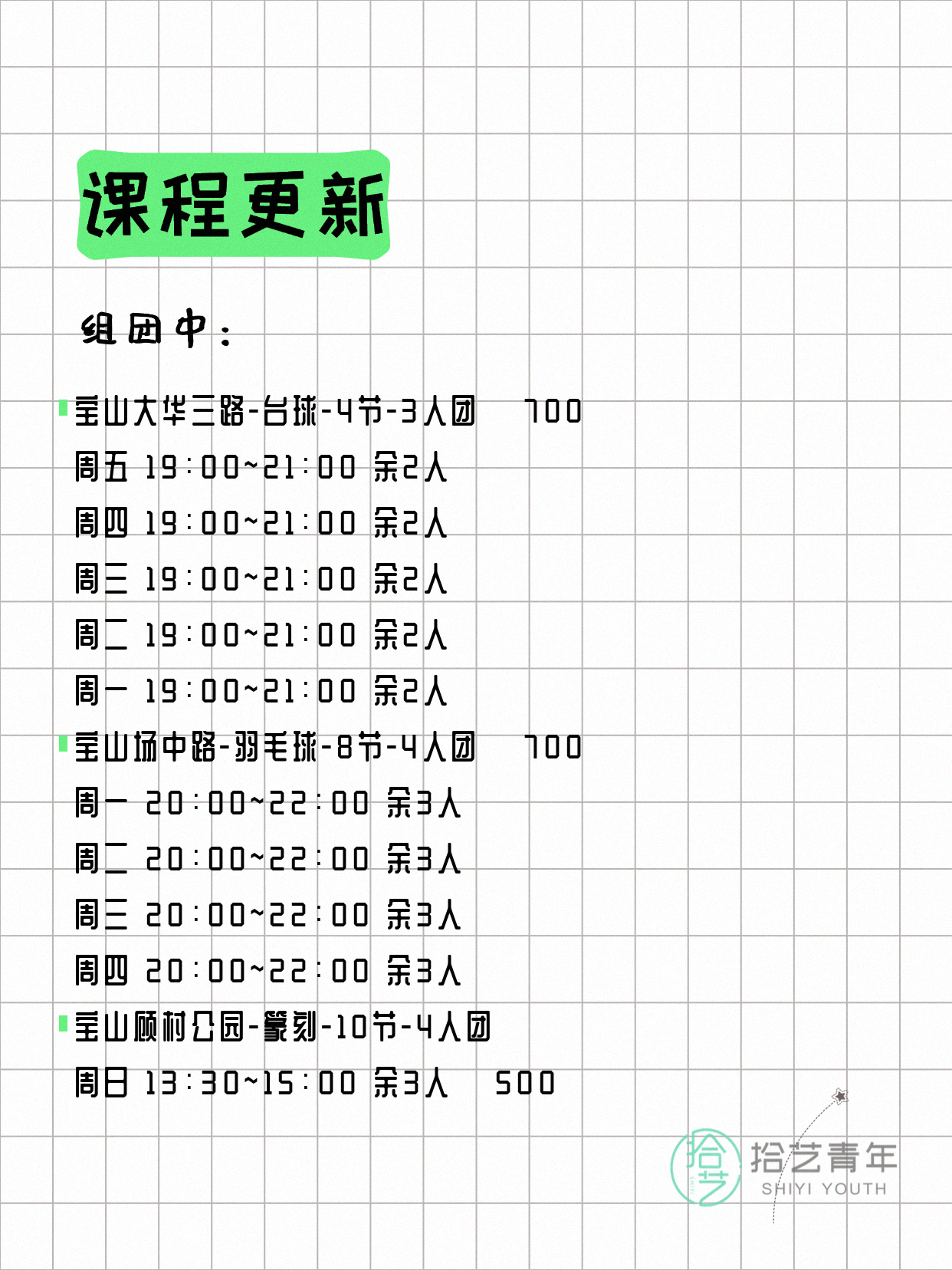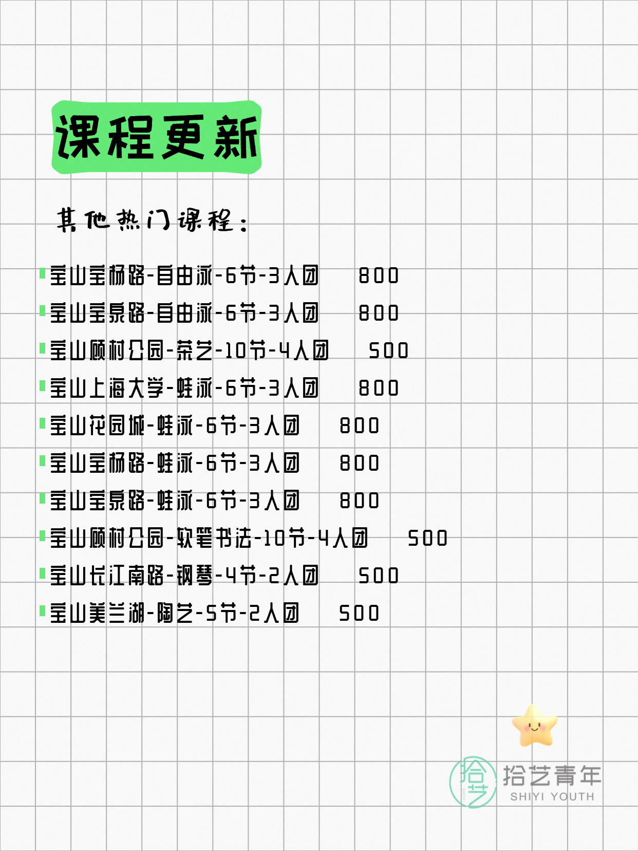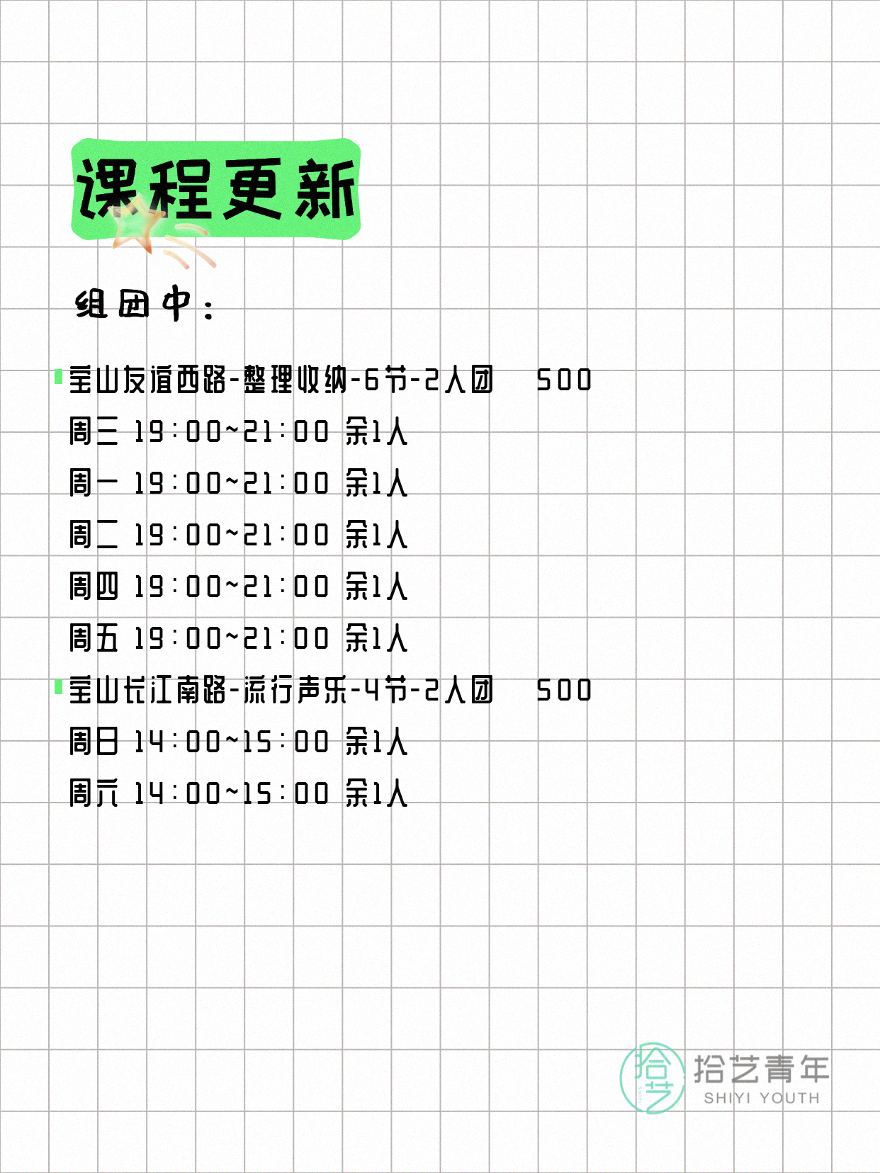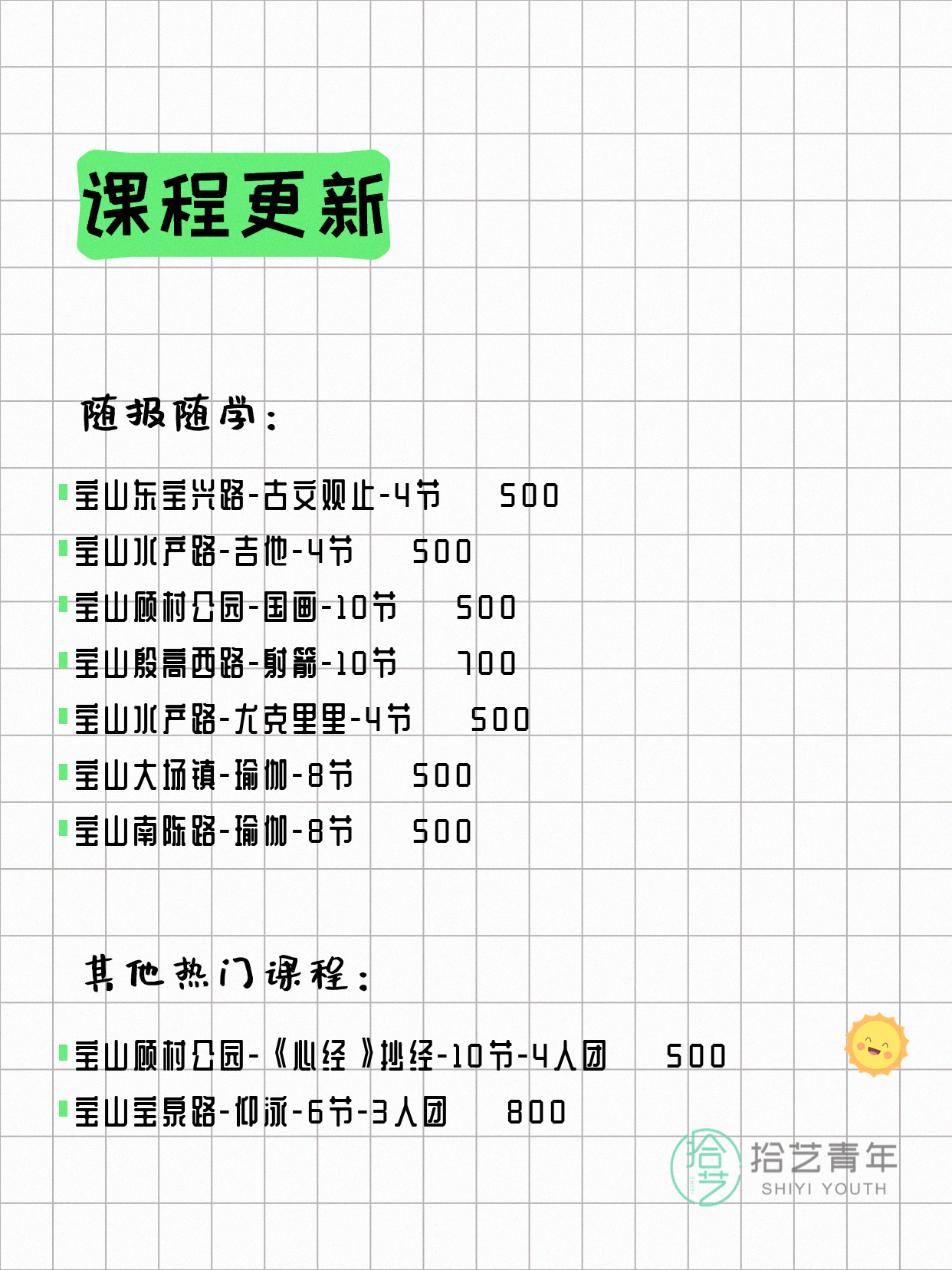💡 提示:以上课程信息来自拾艺青年小程序,课程可能随报名动态变化,具体以小程序实时信息为准。