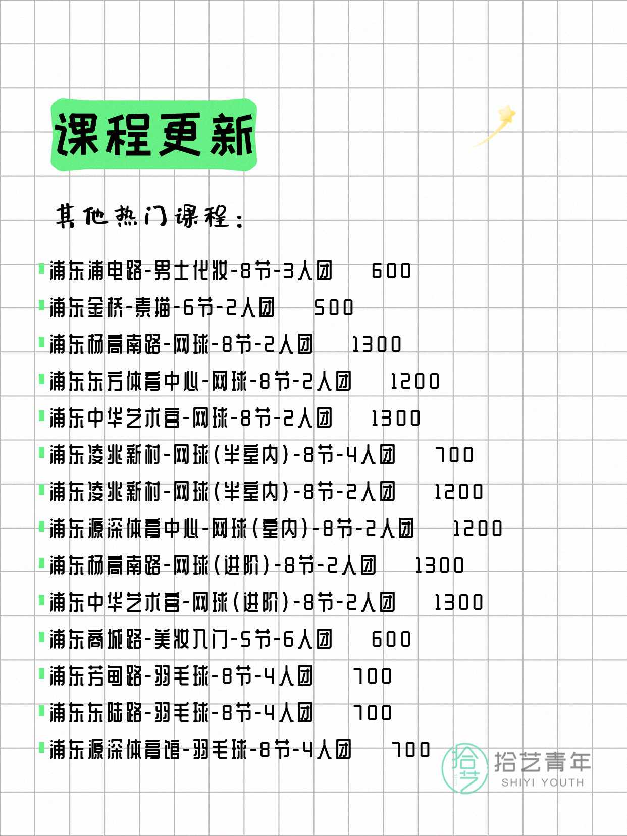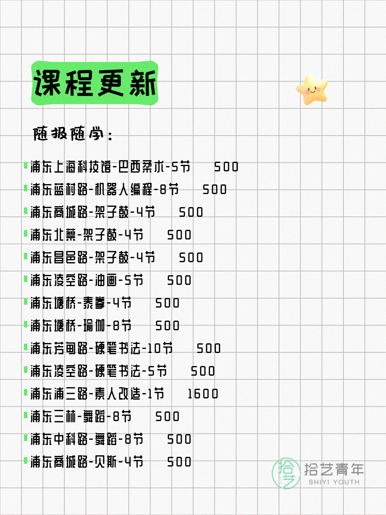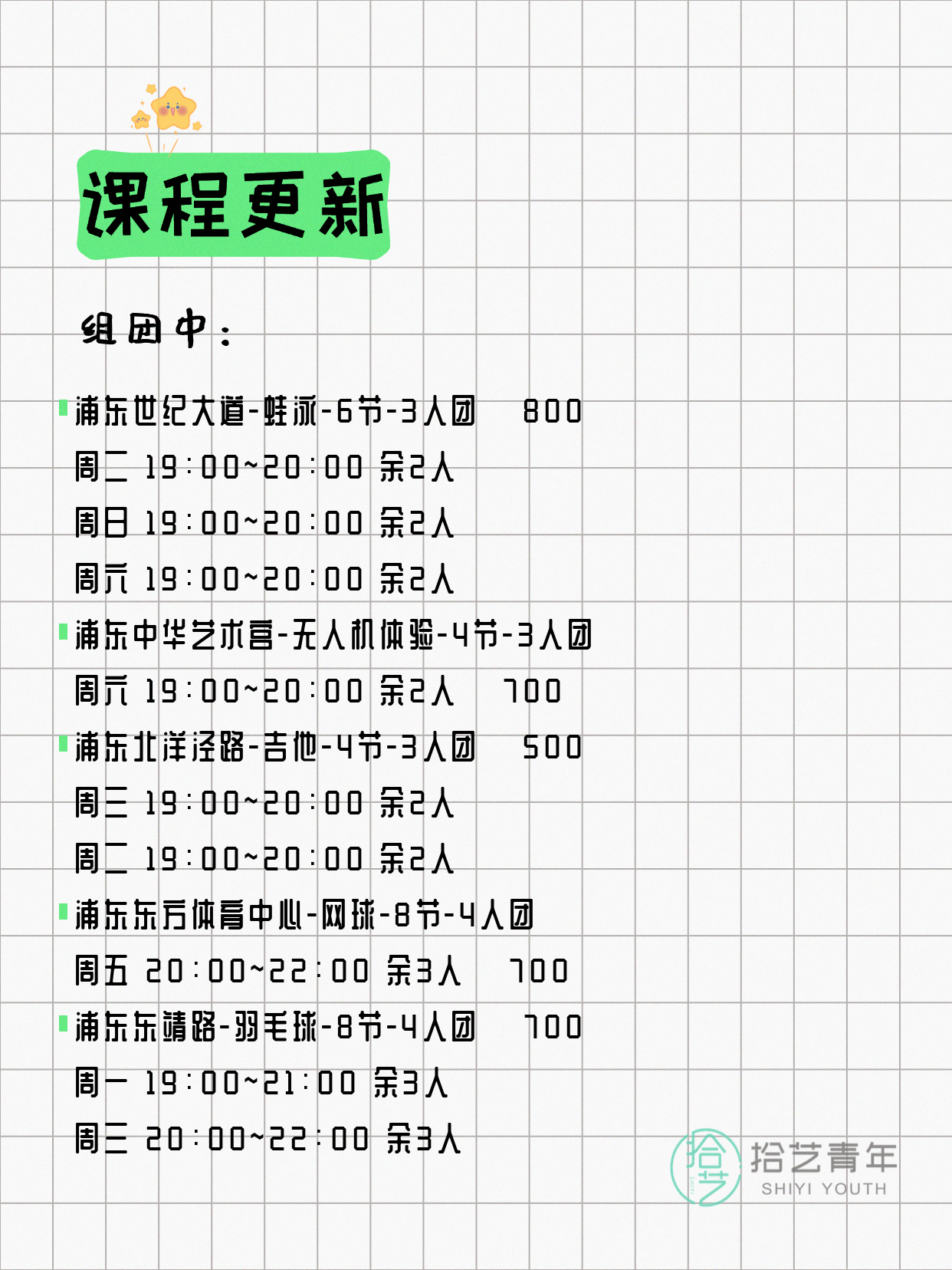 💡 提示:以上课程信息来自拾艺青年小程序,课程可能随报名动态变化,具体以小程序实时信息为准。