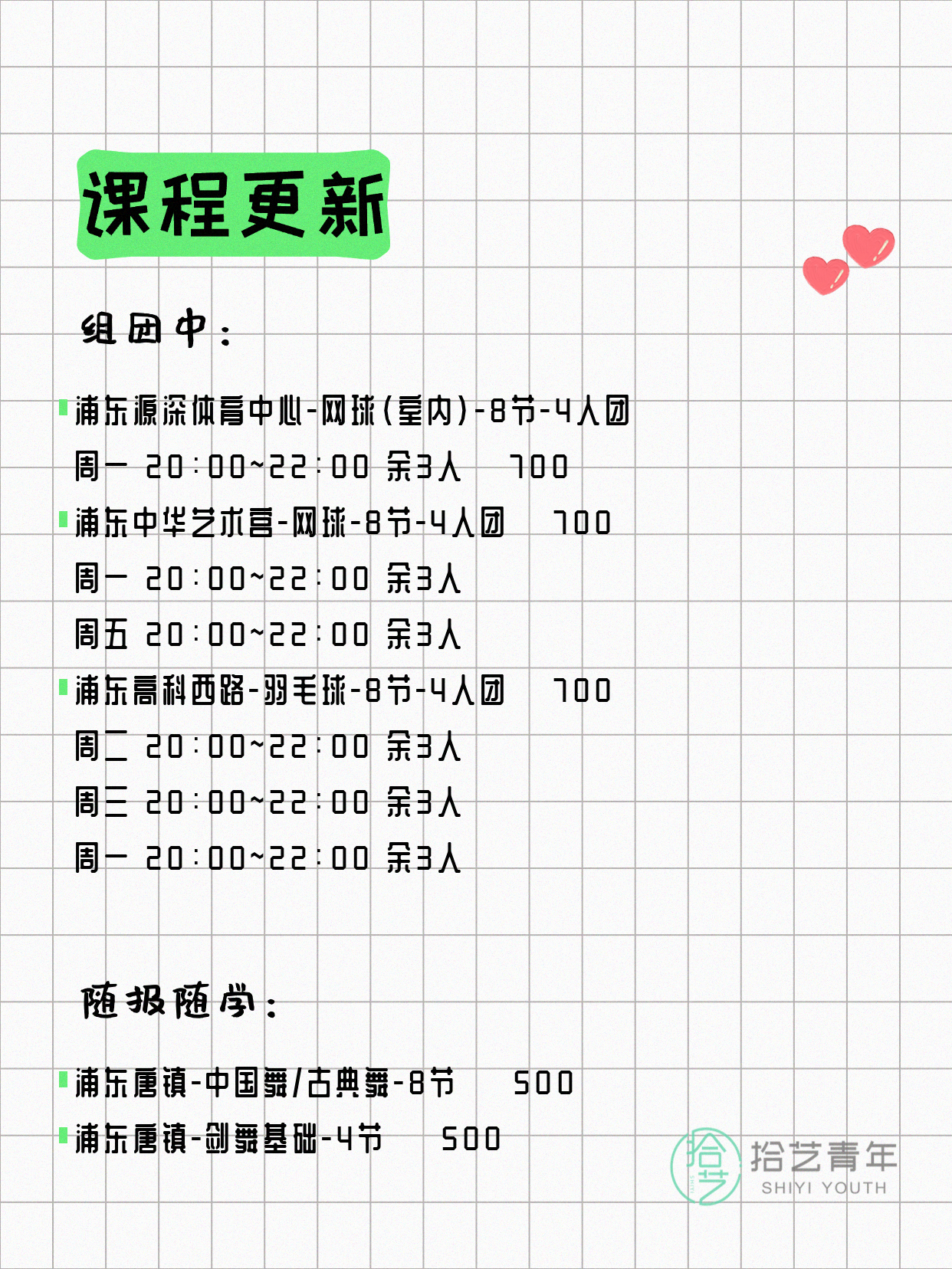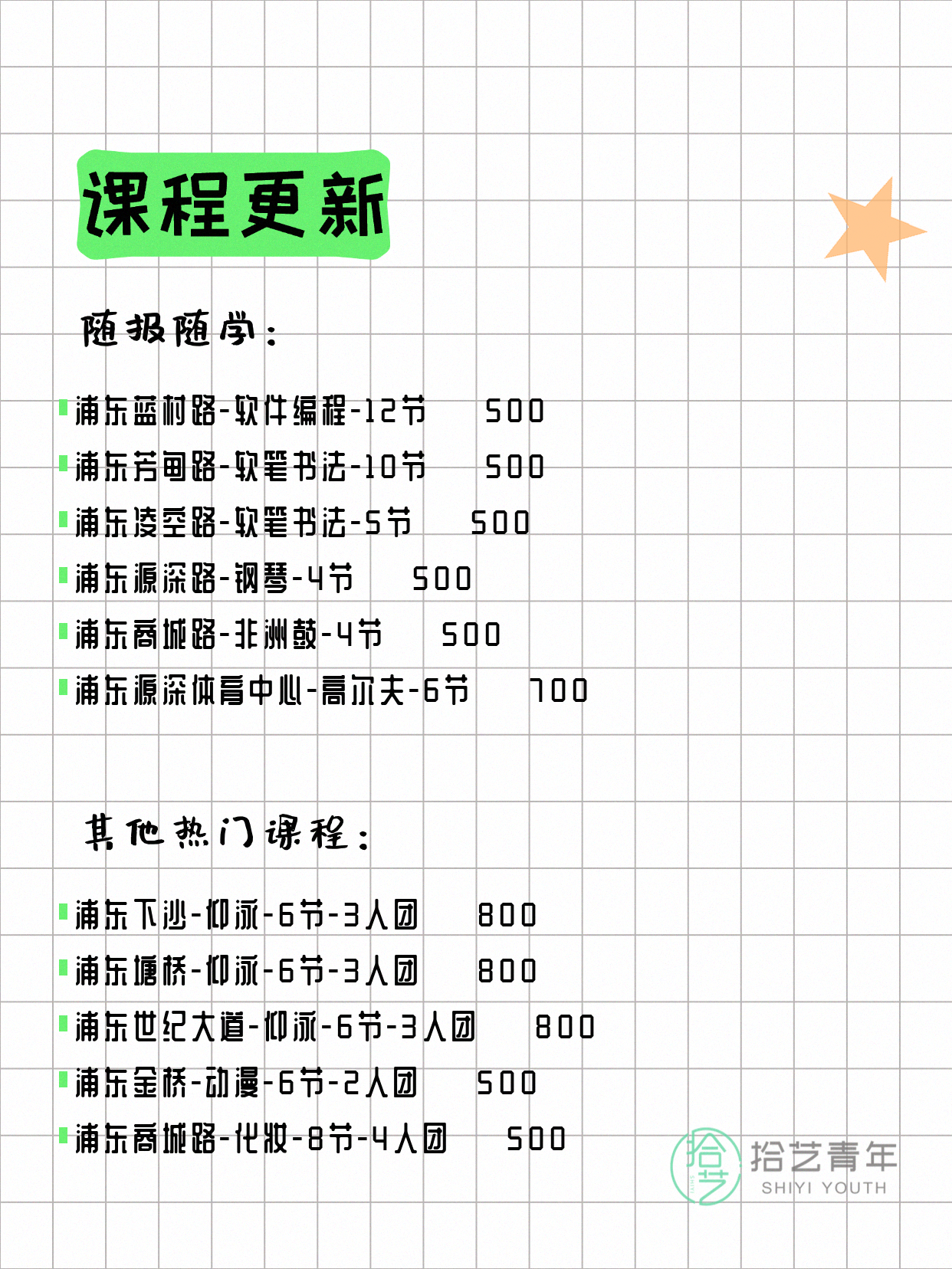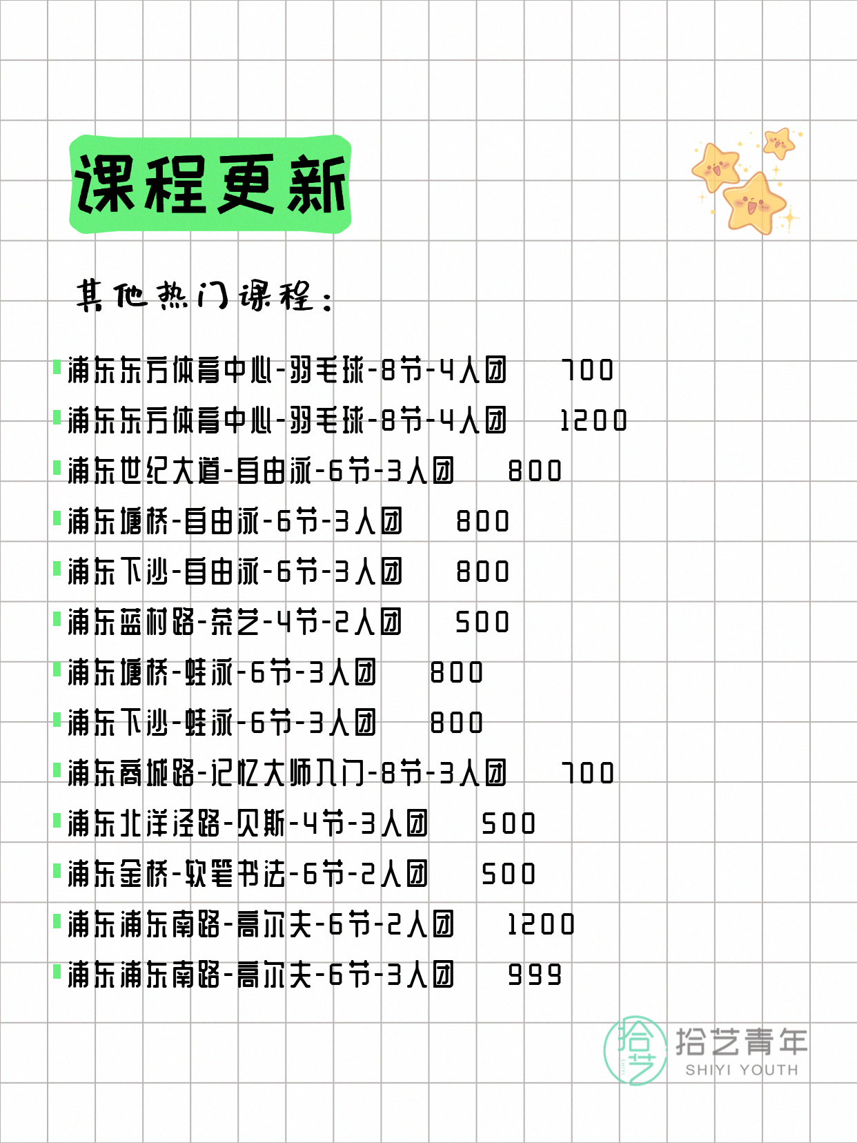 💡 提示:以上课程信息来自拾艺青年小程序,课程可能随报名动态变化,具体以小程序实时信息为准。
