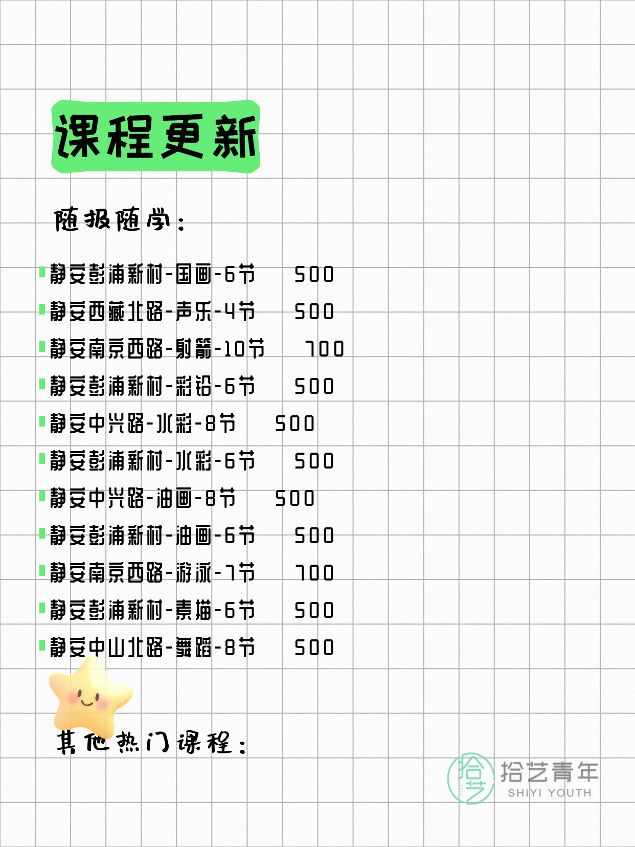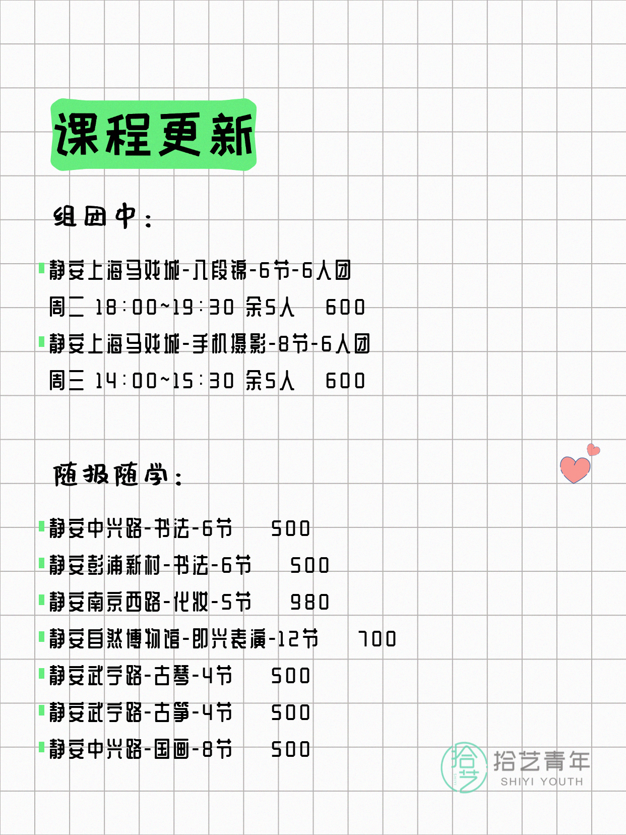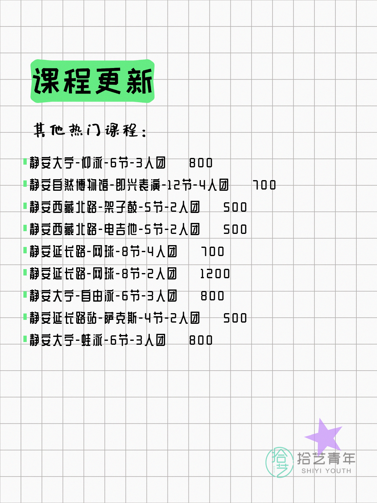 💡 提示:以上课程信息来自拾艺青年小程序,课程可能随报名动态变化,具体以小程序实时信息为准。