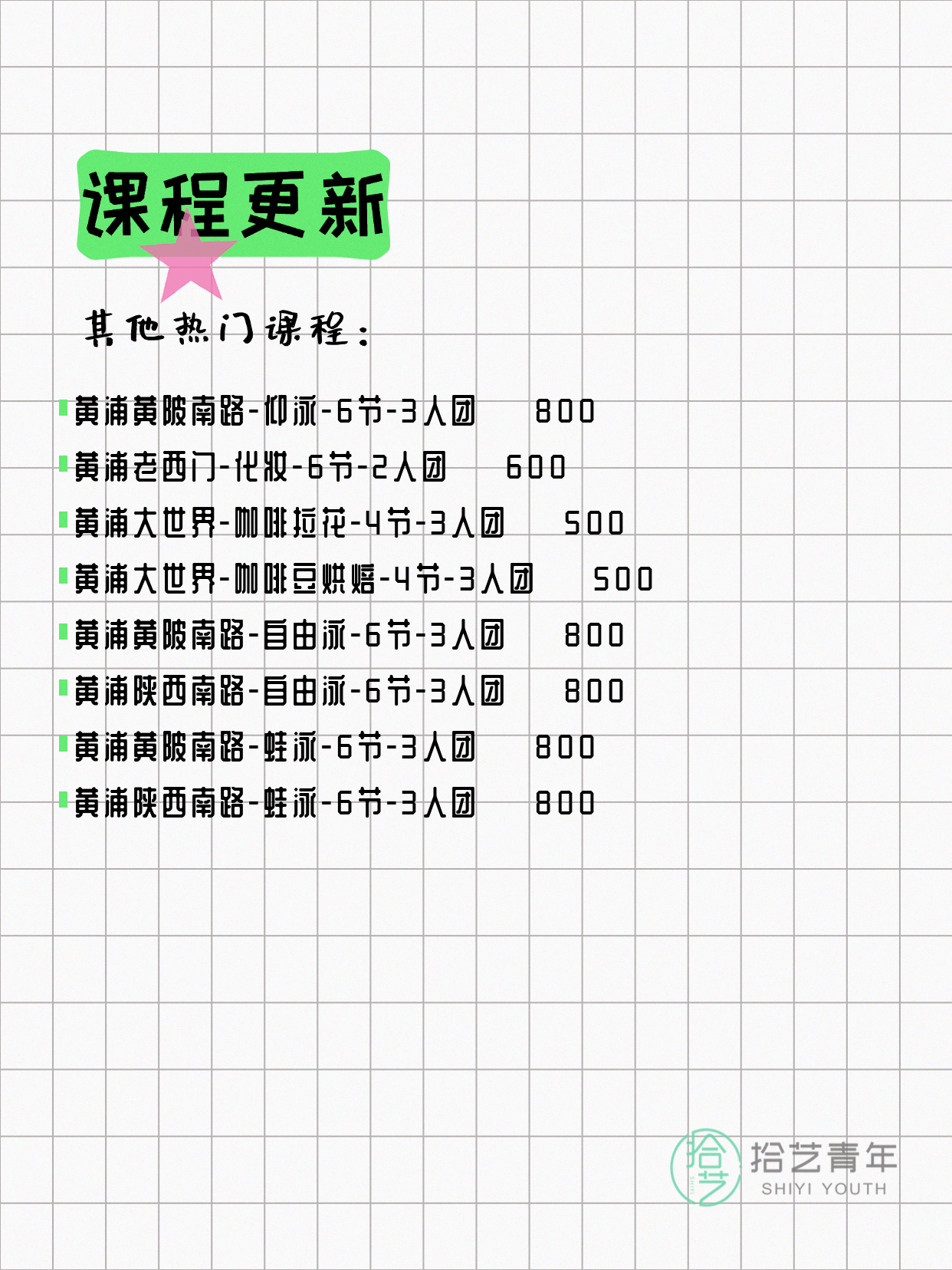 💡 提示:以上课程信息来自拾艺青年小程序,课程可能随报名动态变化,具体以小程序实时信息为准。