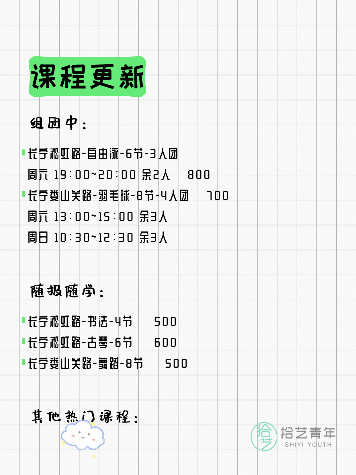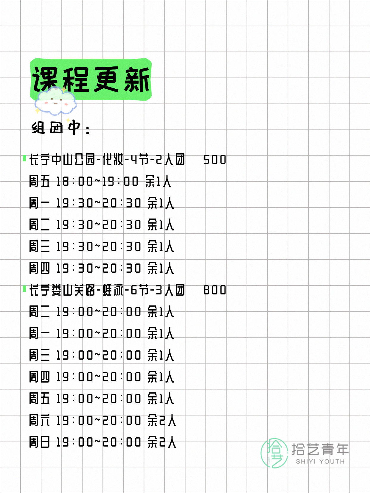 💡 提示:以上课程信息来自拾艺青年小程序,课程可能随报名动态变化,具体以小程序实时信息为准。