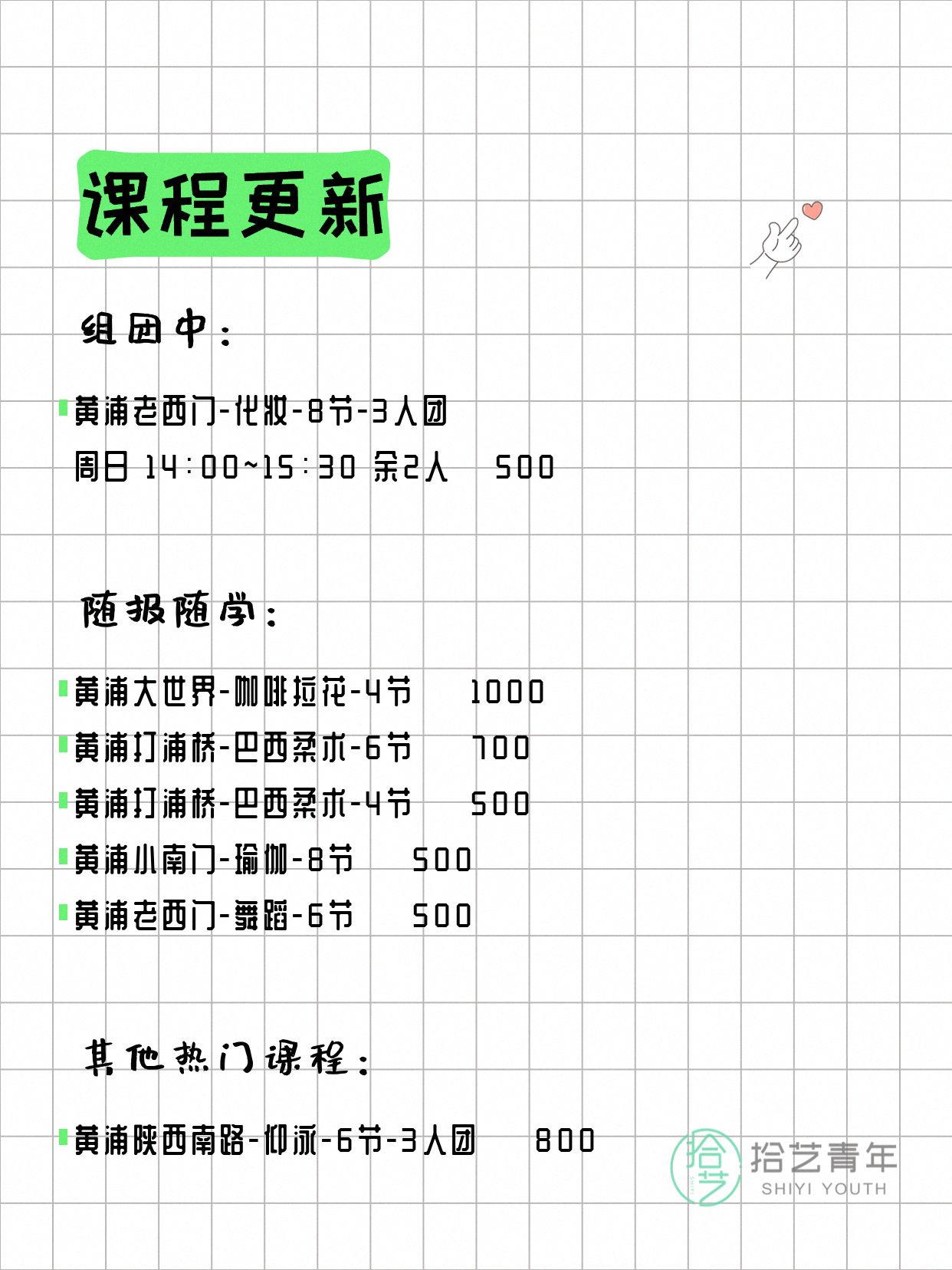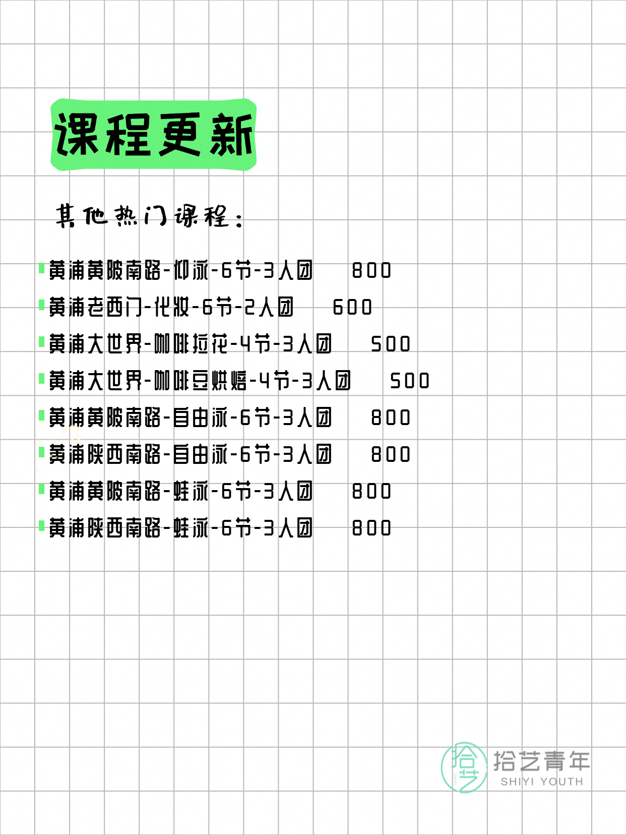 💡 提示:以上课程信息来自拾艺青年小程序,课程可能随报名动态变化,具体以小程序实时信息为准。