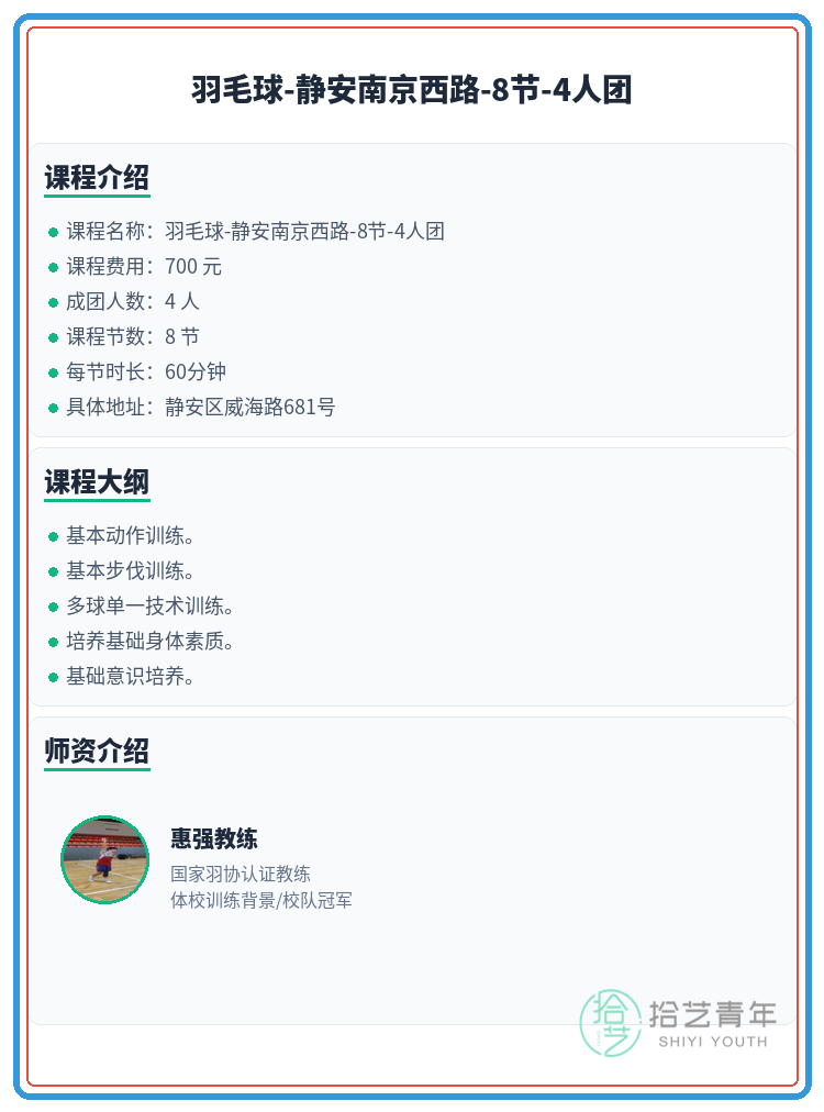 资讯>综合>正文静安南京西路羽毛球差1人 快来拾艺青年2026-03-051 / 2还差1人就开课啦!羽毛球的小伙伴们速来~🙋🏫 上课地点:静安区威海路681号📅 课程安排:共8节 | 周日 10:00-12:00📖 课程大纲:基本动作训练。基本步伐训练。多球单一技术训练。培养基础身体素质。基础意识培养。👥 4人团 | 已报3人 | 还差1人开课#上海夜校 #静安夜校 #羽毛球课程 #夜校拼团 #上海线下课相关标签#上海夜校#静安夜校#羽毛球课程#夜校拼团#上海线下课