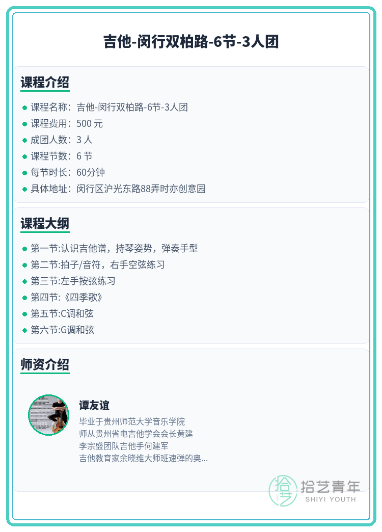 资讯>综合>正文闵行吉他|双柏路附近 缺1人拾艺青年2026-03-051 / 2还差1人就开课啦!吉他的小伙伴们速来~🙋🏫 上课地点:闵行区沪光东路88弄时亦创意园📅 课程安排:共6节 | 周五 19:00-20:00📖 课程大纲:第一节:认识吉他谱,持琴姿势,弹奏手型第二节:拍子/音符,右手空弦练习第三节:左手按弦练习第四节:《四季歌》第五节:C调和弦第六节:G调和弦👥 3人团 | 已报2人 | 还差1人开课#上海夜校 #闵行夜校 #吉他课程 #夜校拼团 #上海线下课相关标签#上海夜校#闵行夜校#吉他课程#夜校拼团#上海线下课