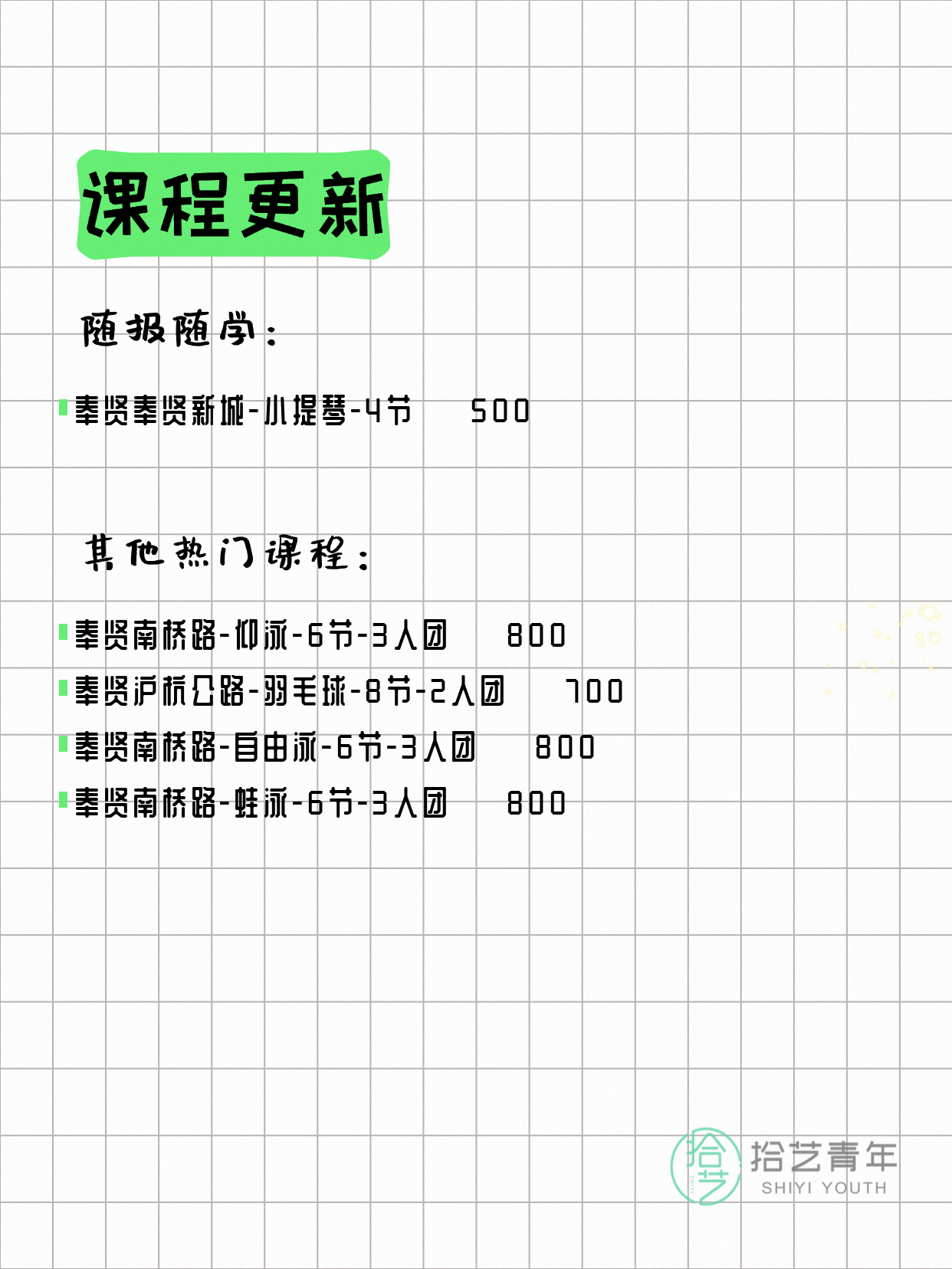 💡 提示:以上课程信息来自拾艺青年小程序,课程可能随报名动态变化,具体以小程序实时信息为准。
