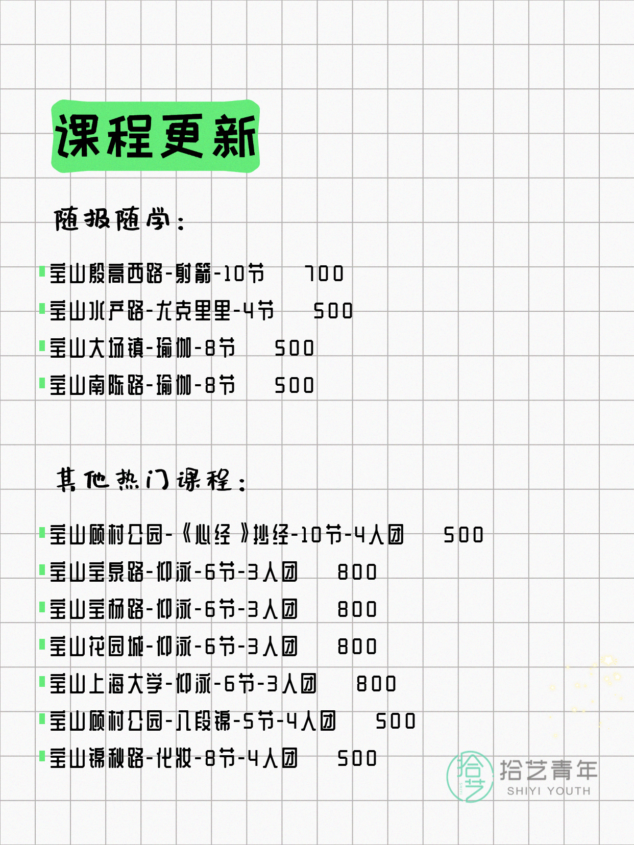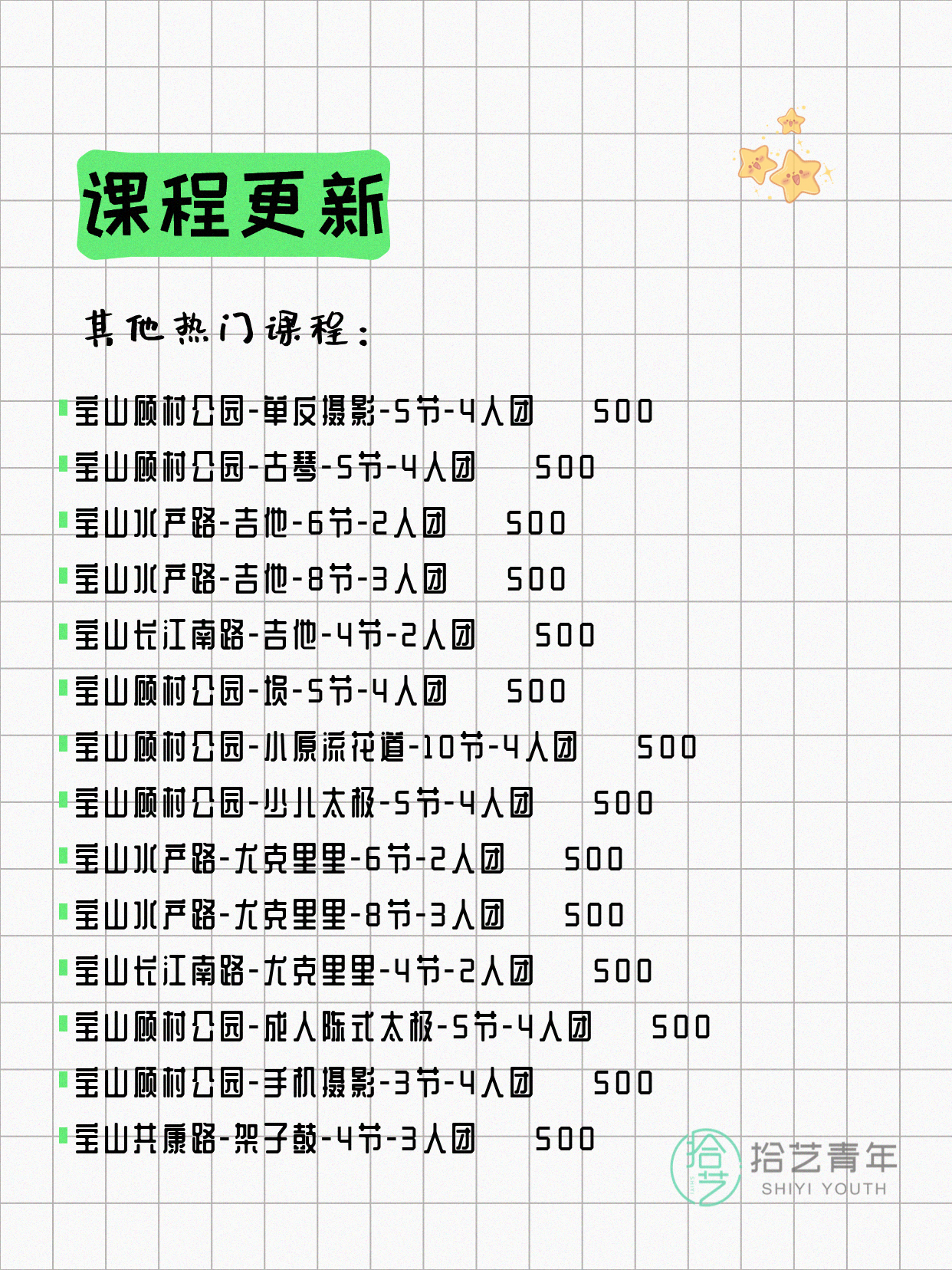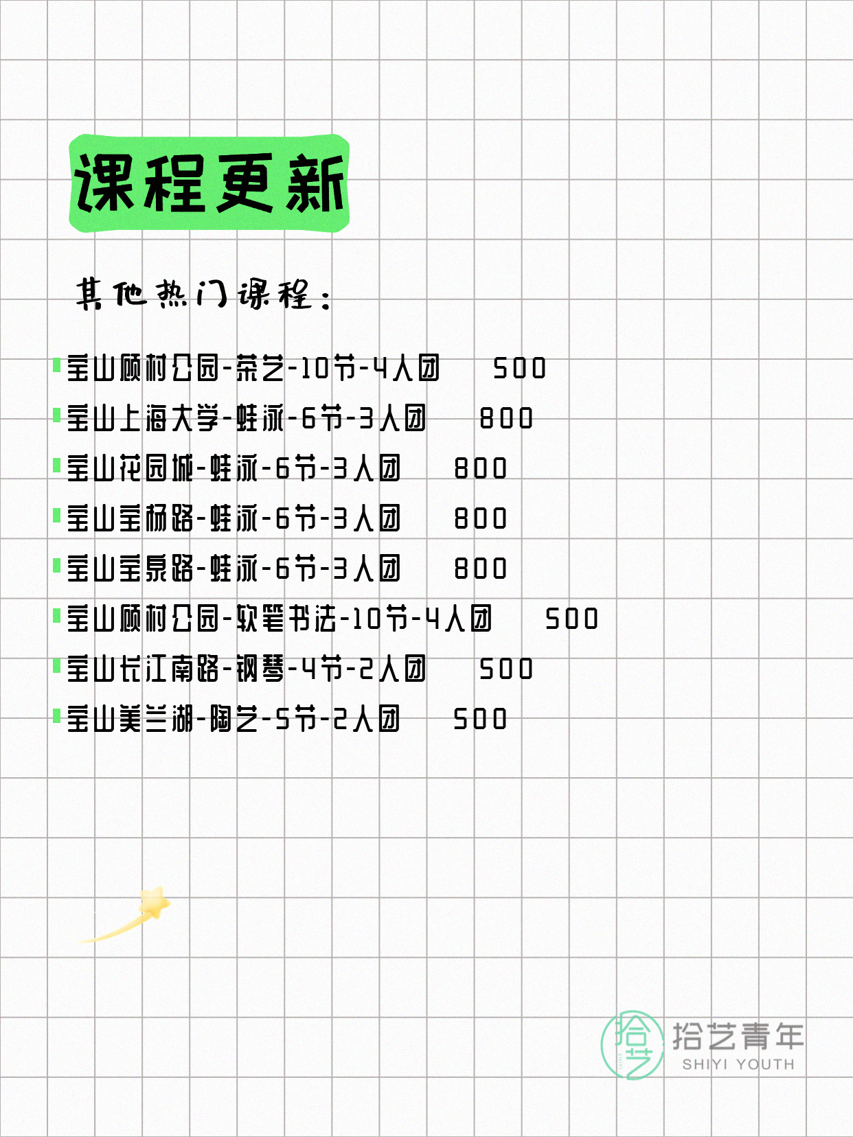 💡 提示:以上课程信息来自拾艺青年小程序,课程可能随报名动态变化,具体以小程序实时信息为准。