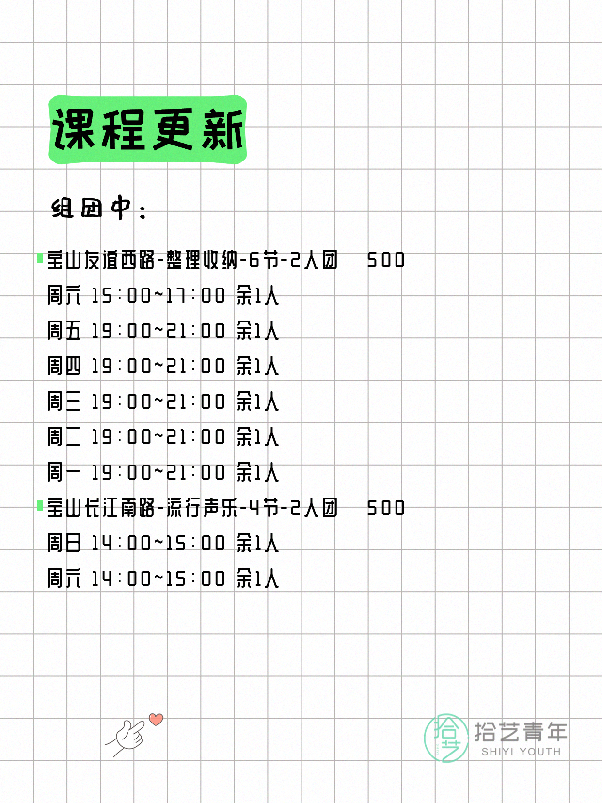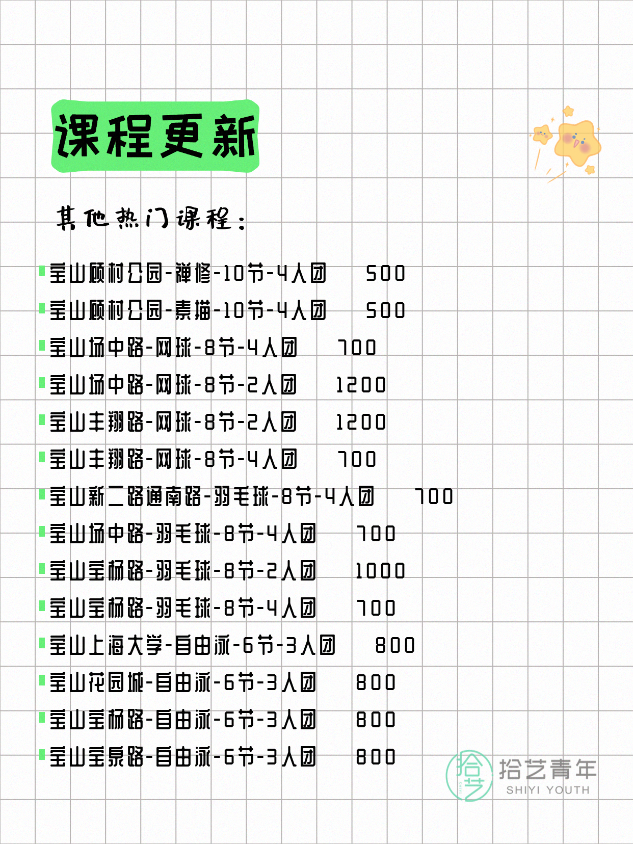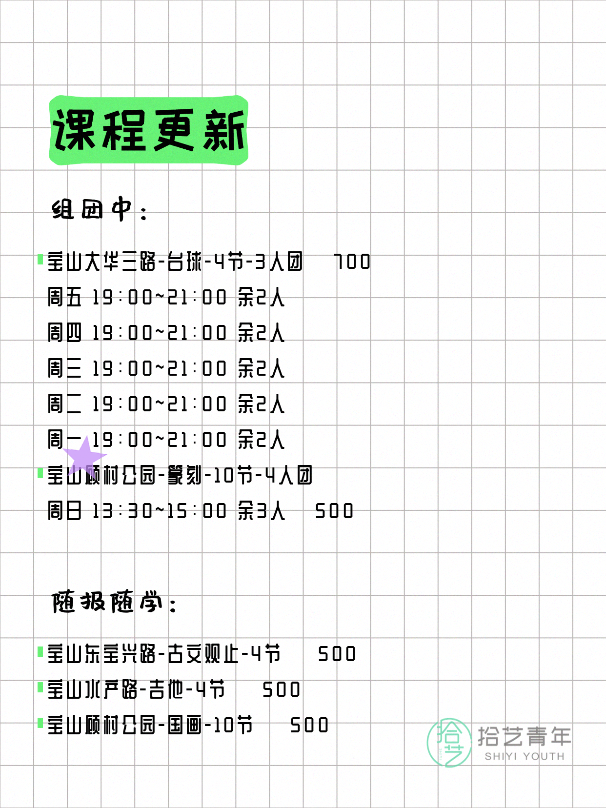 💡 提示:以上课程信息来自拾艺青年小程序,课程可能随报名动态变化,具体以小程序实时信息为准。
