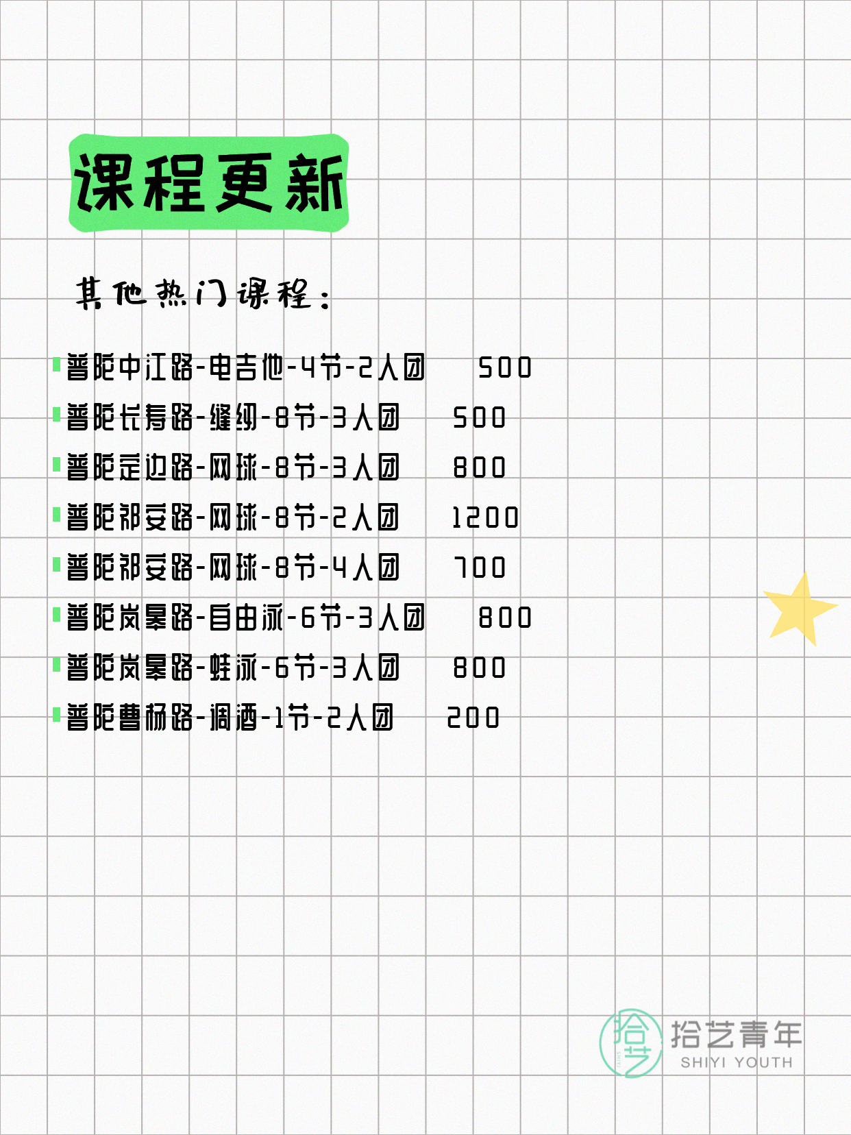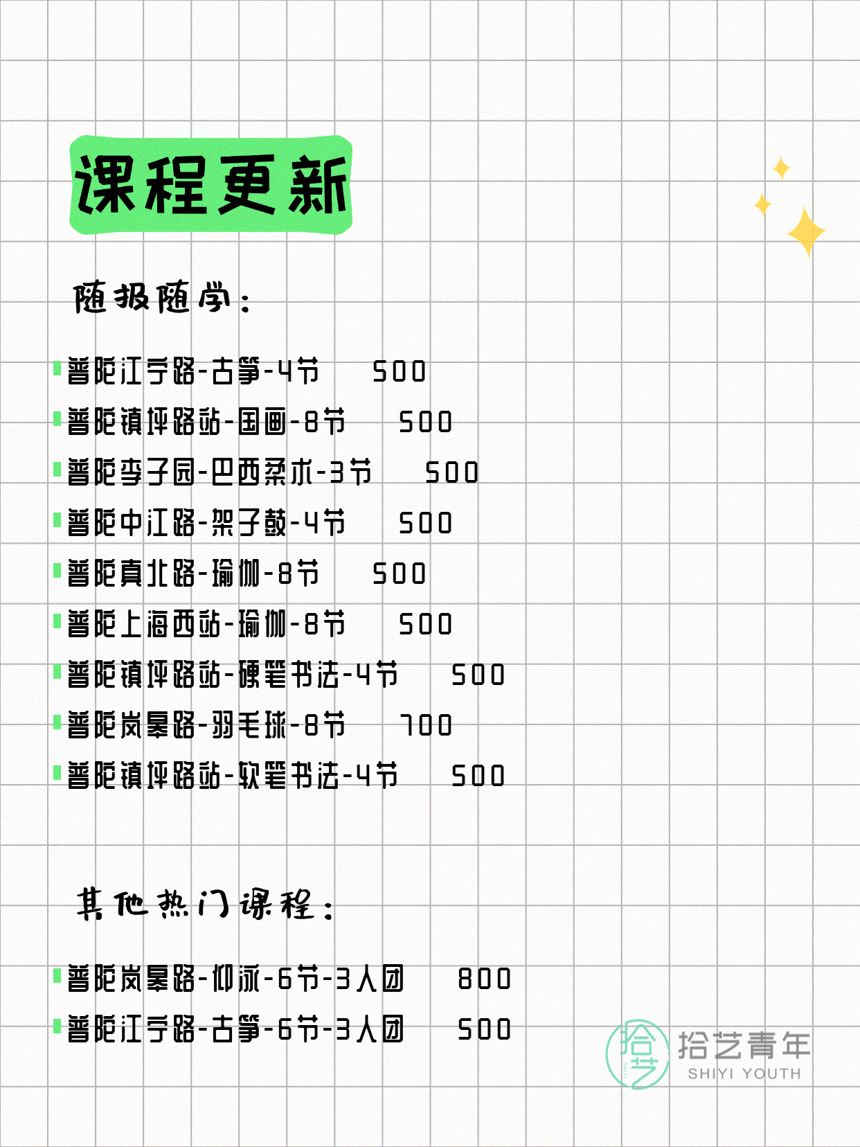💡 提示:以上课程信息来自拾艺青年小程序,课程可能随报名动态变化,具体以小程序实时信息为准。