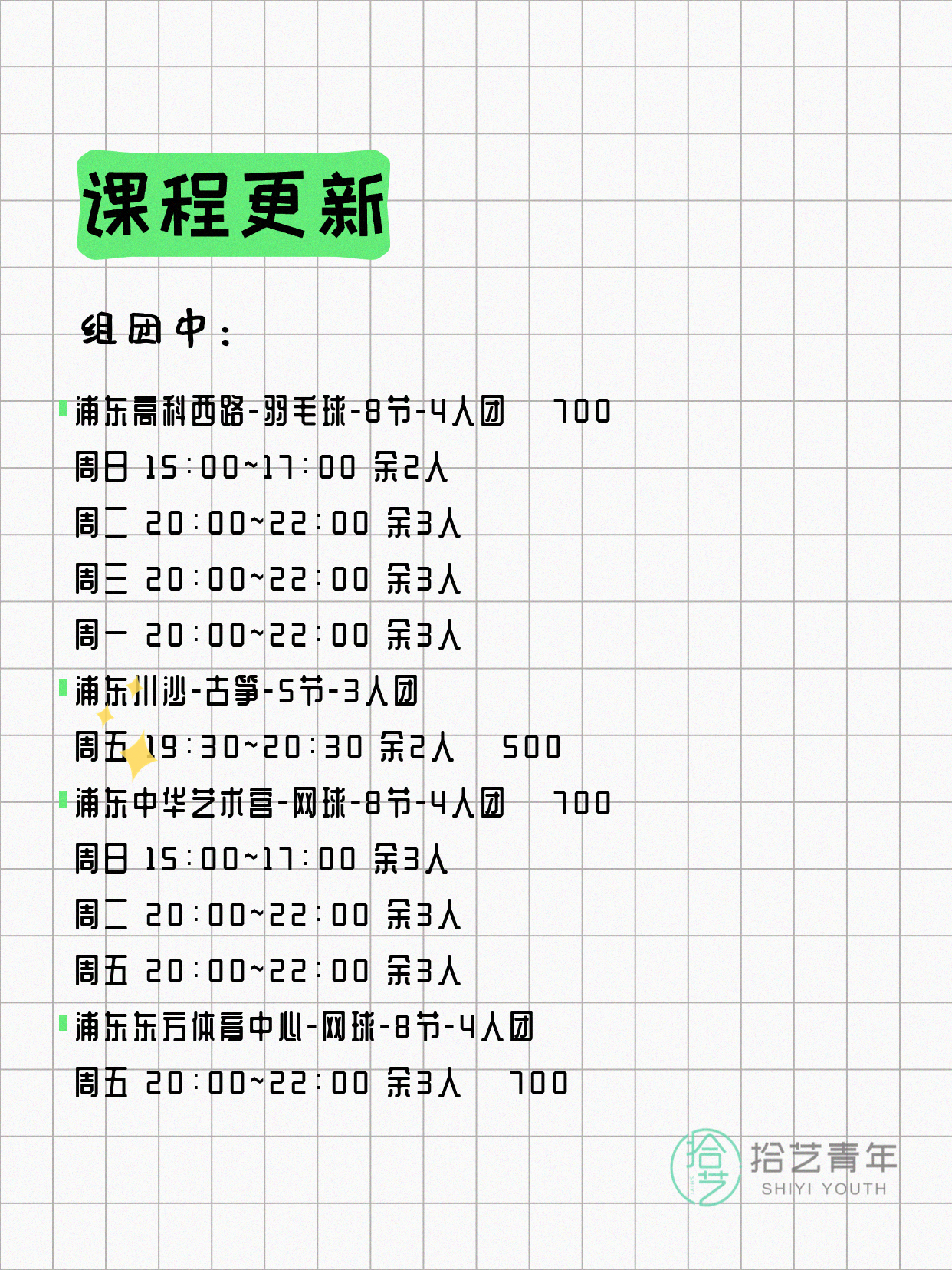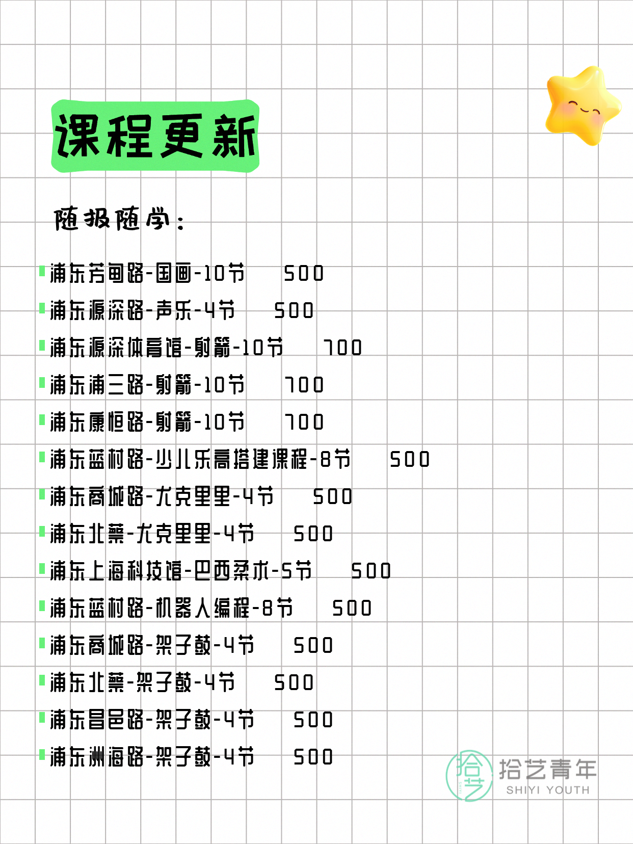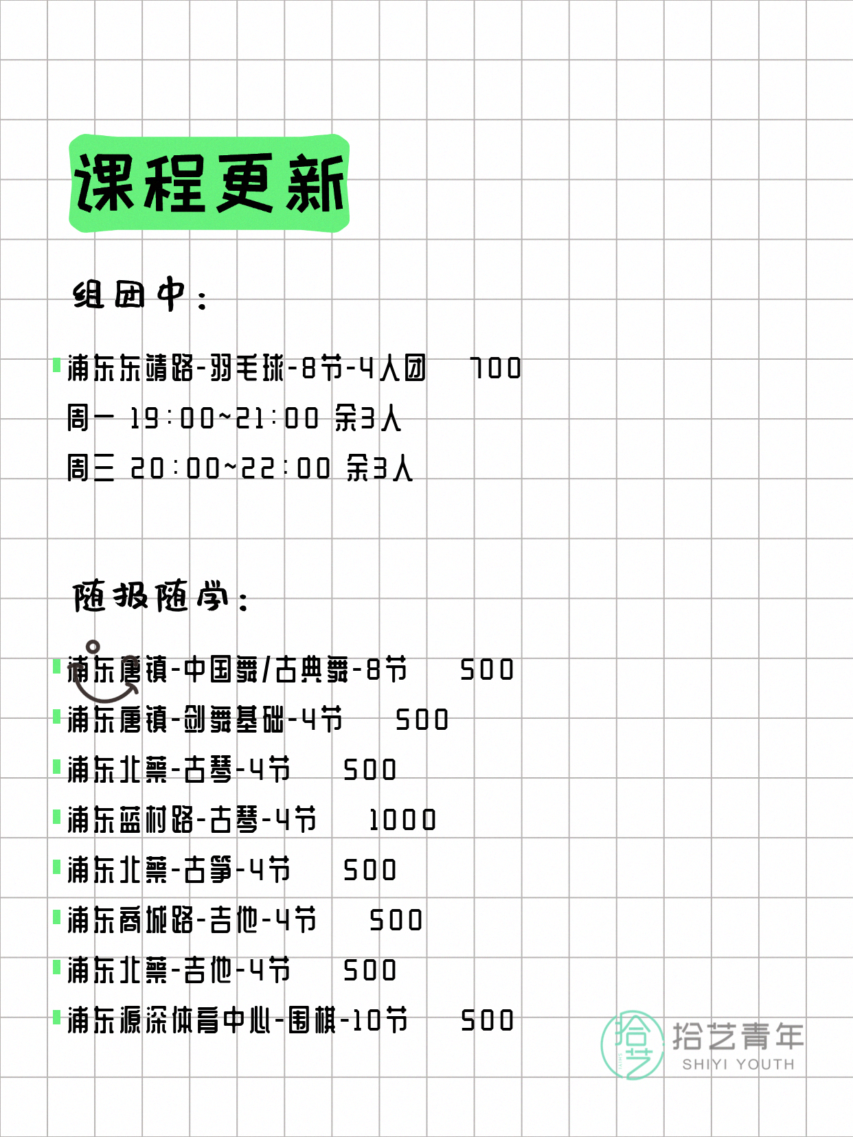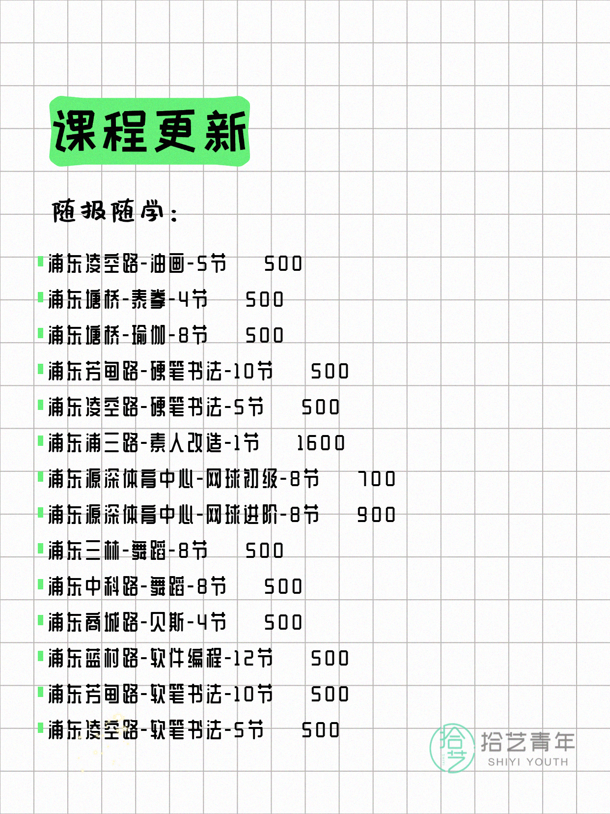 💡 提示:以上课程信息来自拾艺青年小程序,课程可能随报名动态变化,具体以小程序实时信息为准。