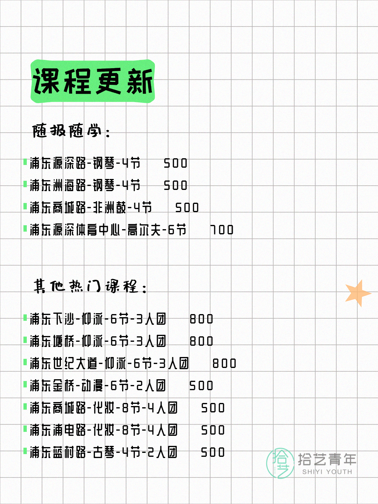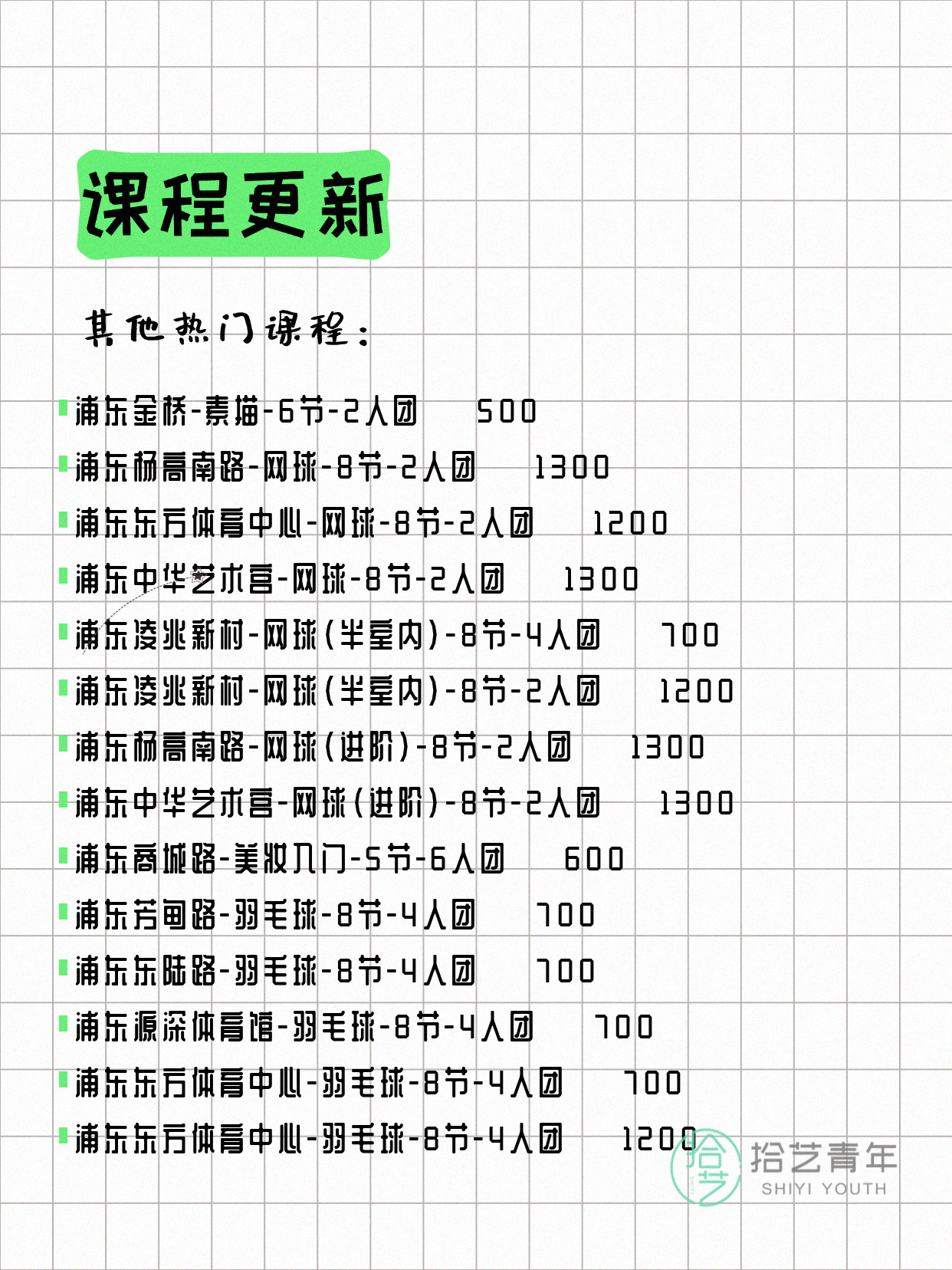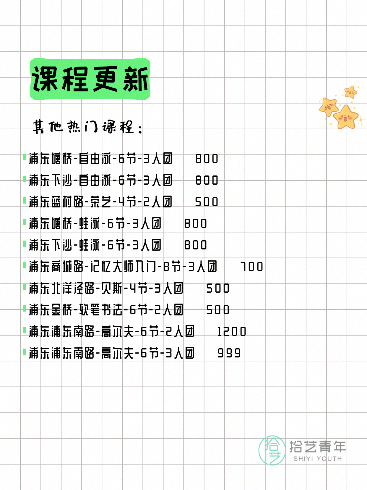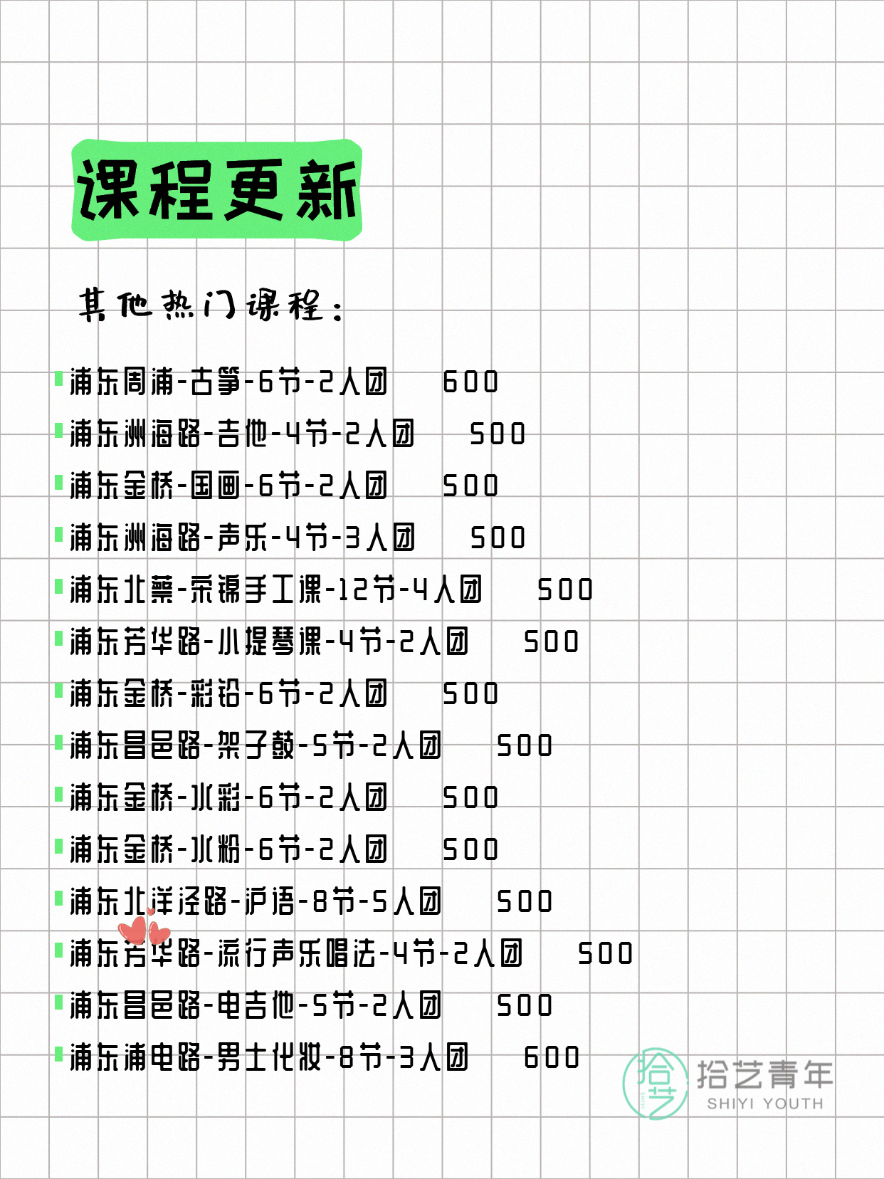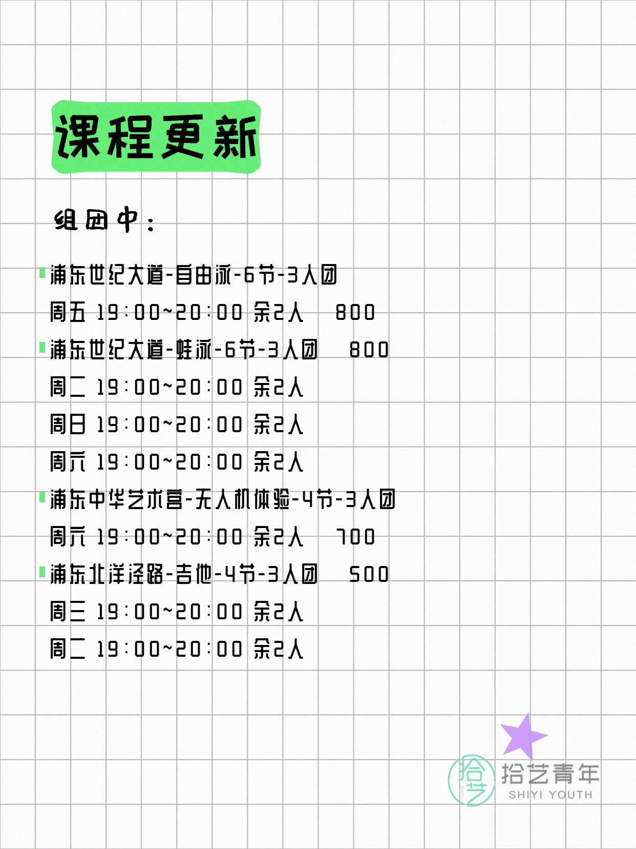 💡 提示:以上课程信息来自拾艺青年小程序,课程可能随报名动态变化,具体以小程序实时信息为准。
