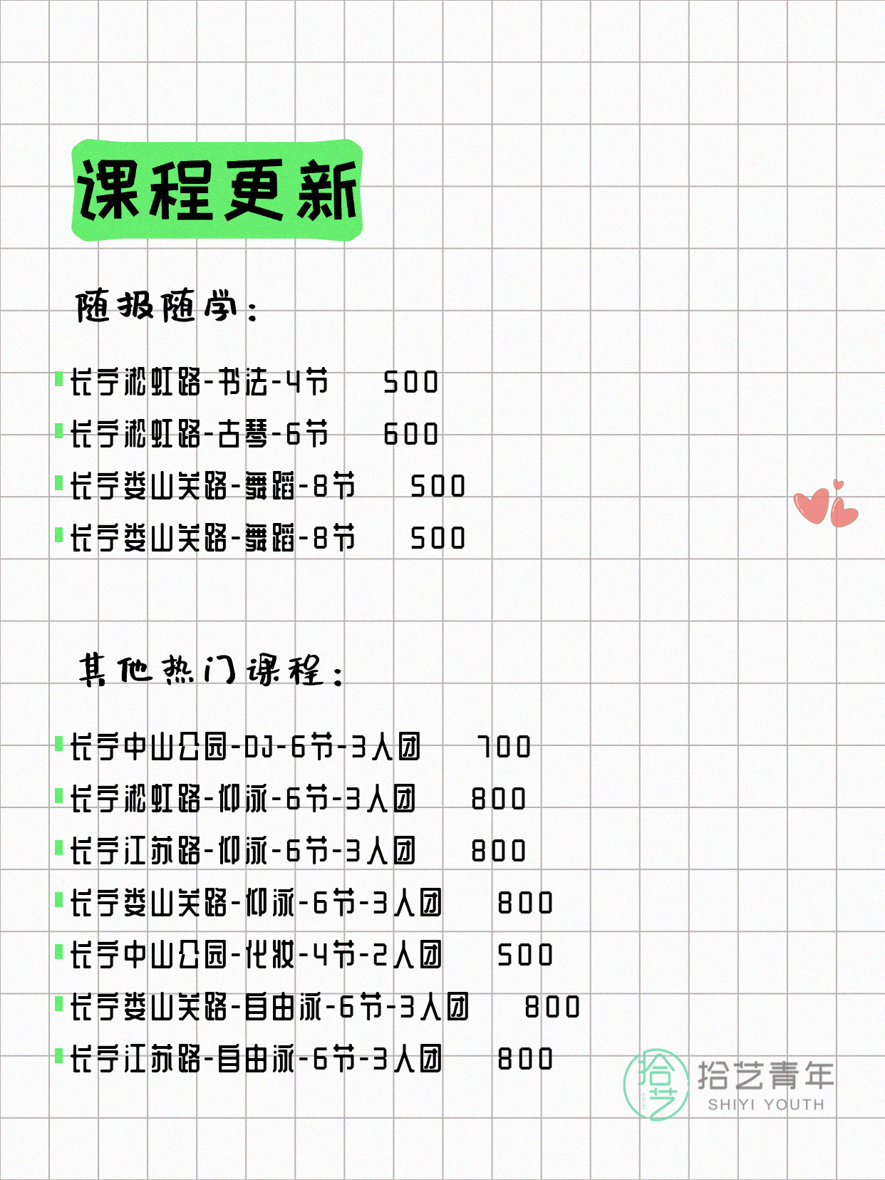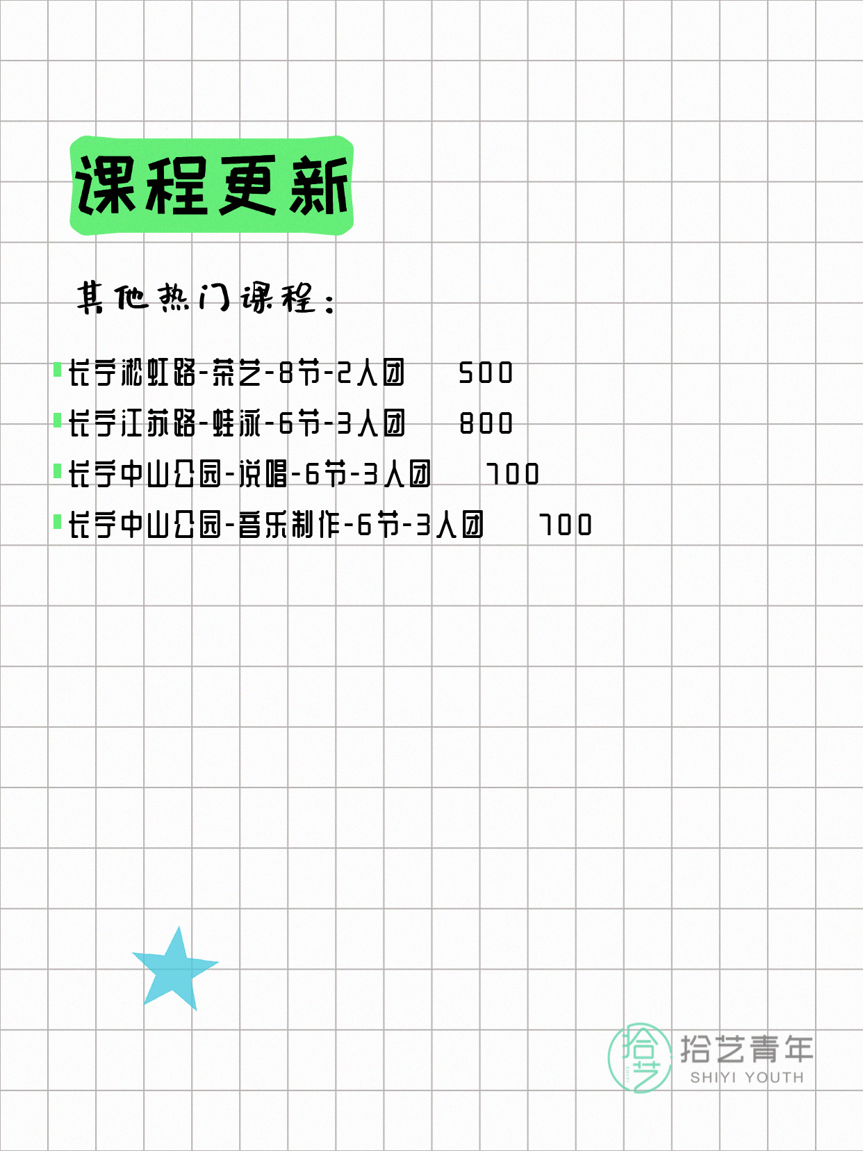 💡 提示:以上课程信息来自拾艺青年小程序,课程可能随报名动态变化,具体以小程序实时信息为准。