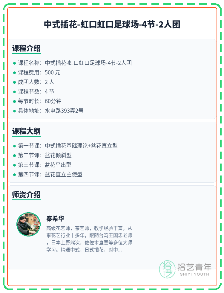 资讯>综合>正文虹口中式插花|虹口足球场附近 缺1人拾艺青年2026-03-051 / 2还差1人就开课啦!中式插花的小伙伴们速来~🙋🏫 上课地点:水电路393弄2号📅 课程安排:共4节 | 周二 19:00-20:00📖 课程大纲:第一节课:中式插花基础理论+盆花直立型第二节课:盆花倾斜型第三节课: 盆花平出型第四节课:盆花直立主使型👥 2人团 | 已报1人 | 还差1人开课#上海夜校 #虹口夜校 #中式插花课程 #夜校拼团 #上海线下课相关标签#上海夜校#虹口夜校#中式插花课程#夜校拼团#上海线下课