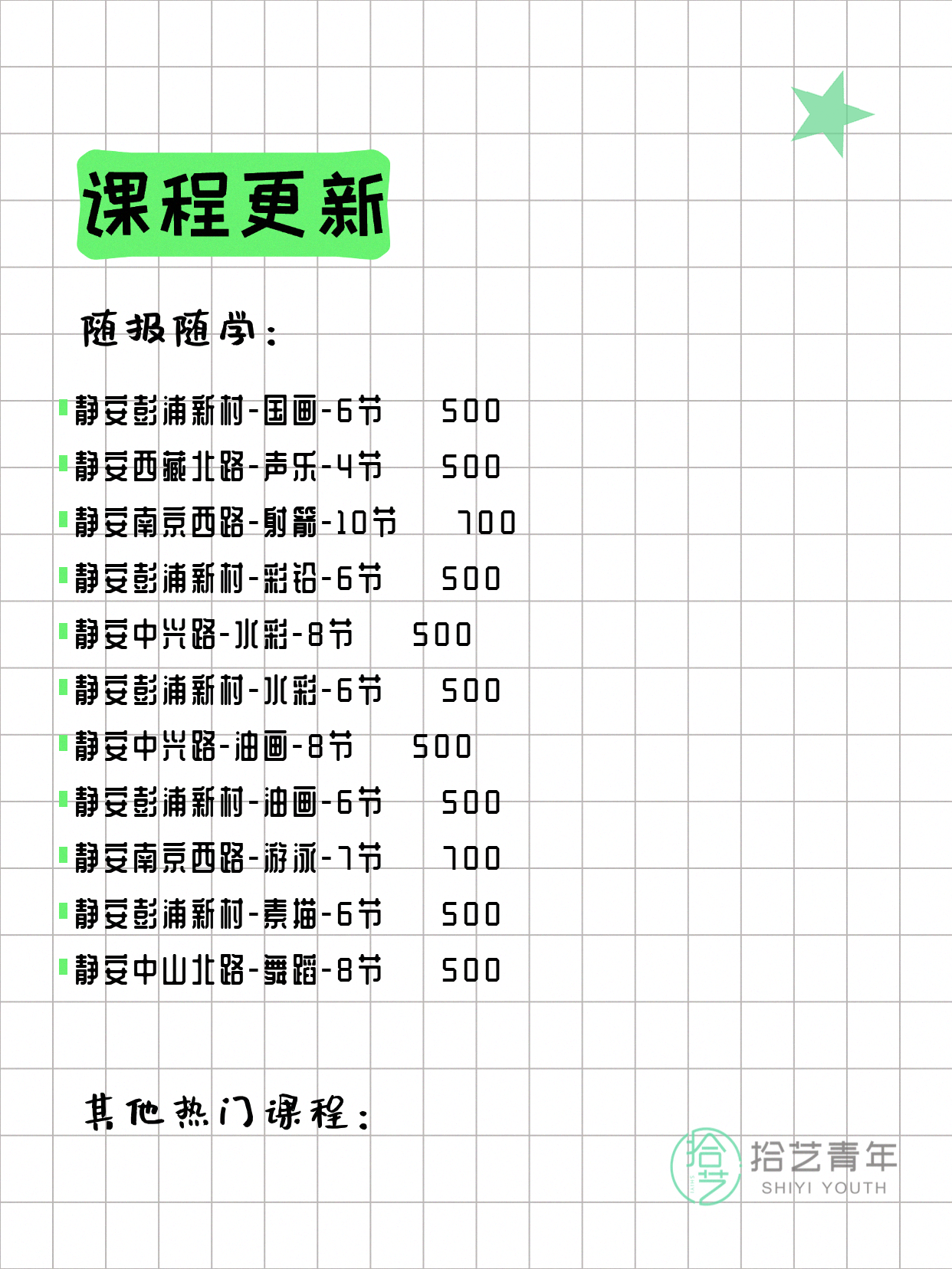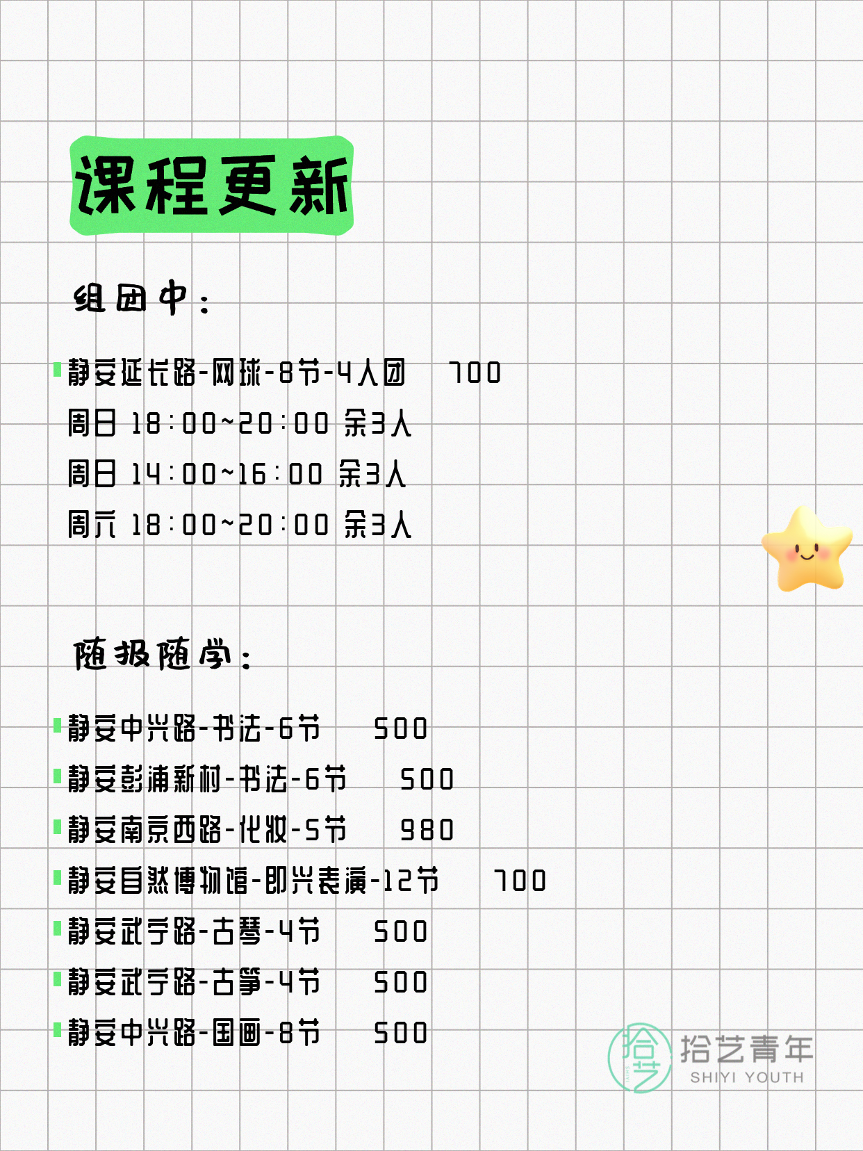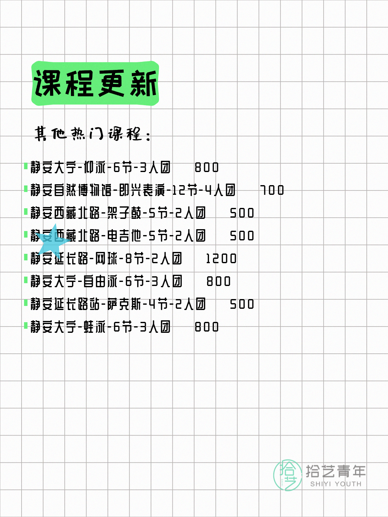 💡 提示:以上课程信息来自拾艺青年小程序,课程可能随报名动态变化,具体以小程序实时信息为准。