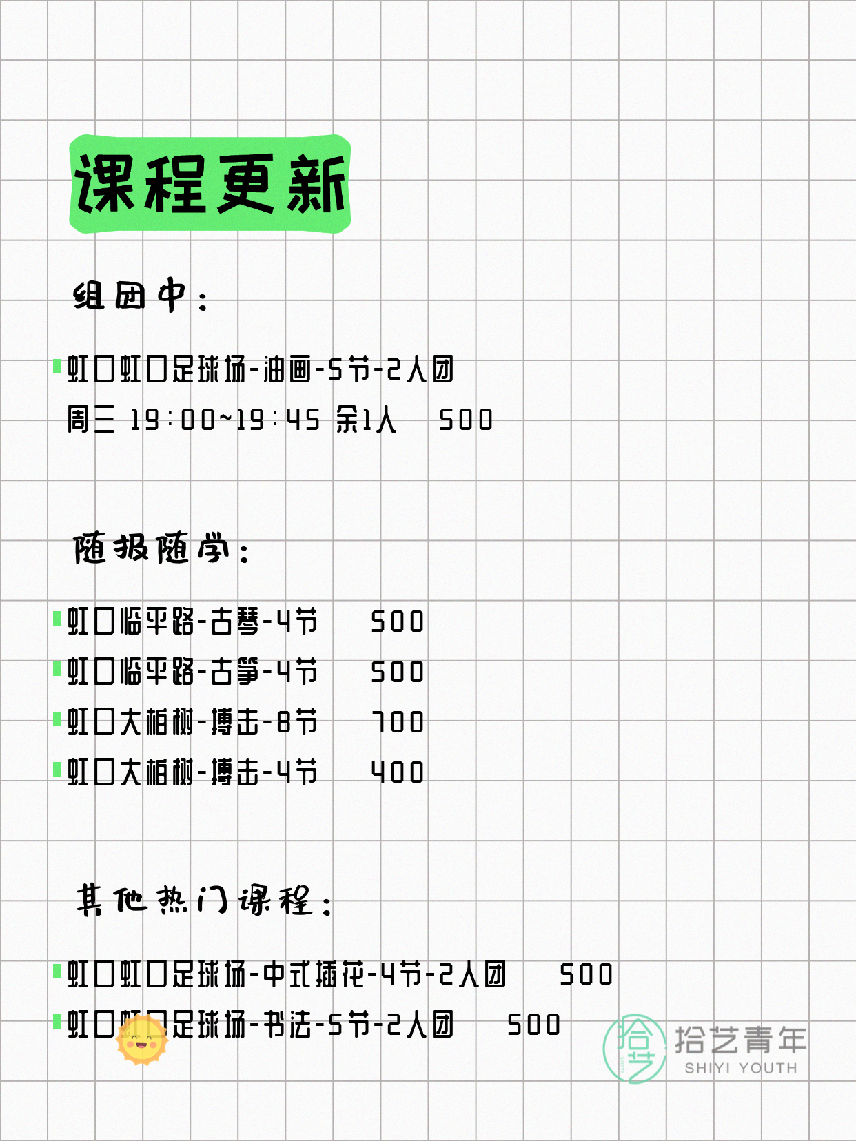 💡 提示:以上课程信息来自拾艺青年小程序,课程可能随报名动态变化,具体以小程序实时信息为准。