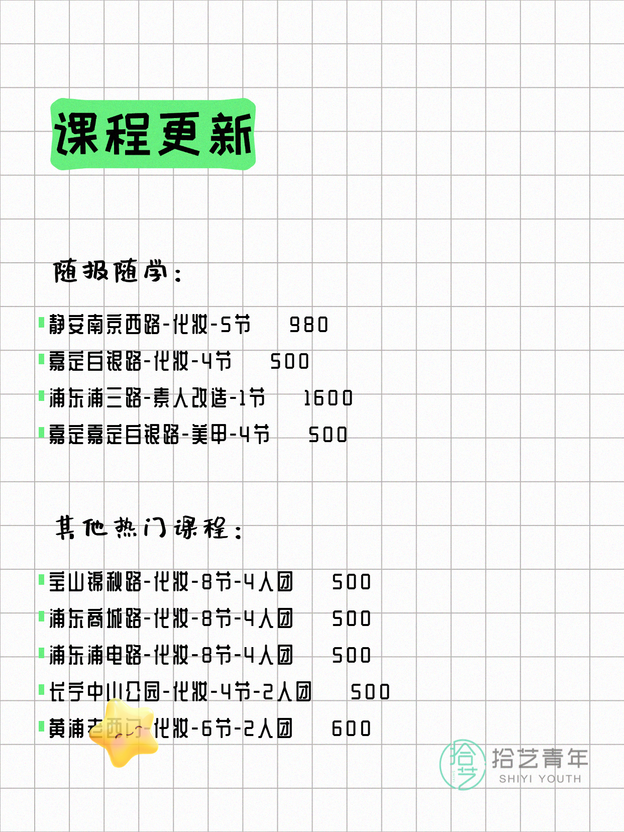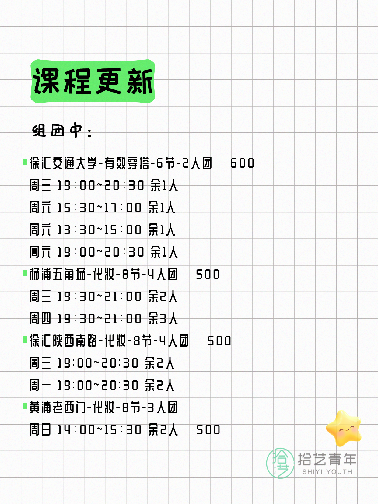 💡 提示:以上课程信息来自拾艺青年小程序,课程可能随报名动态变化,具体以小程序实时信息为准。