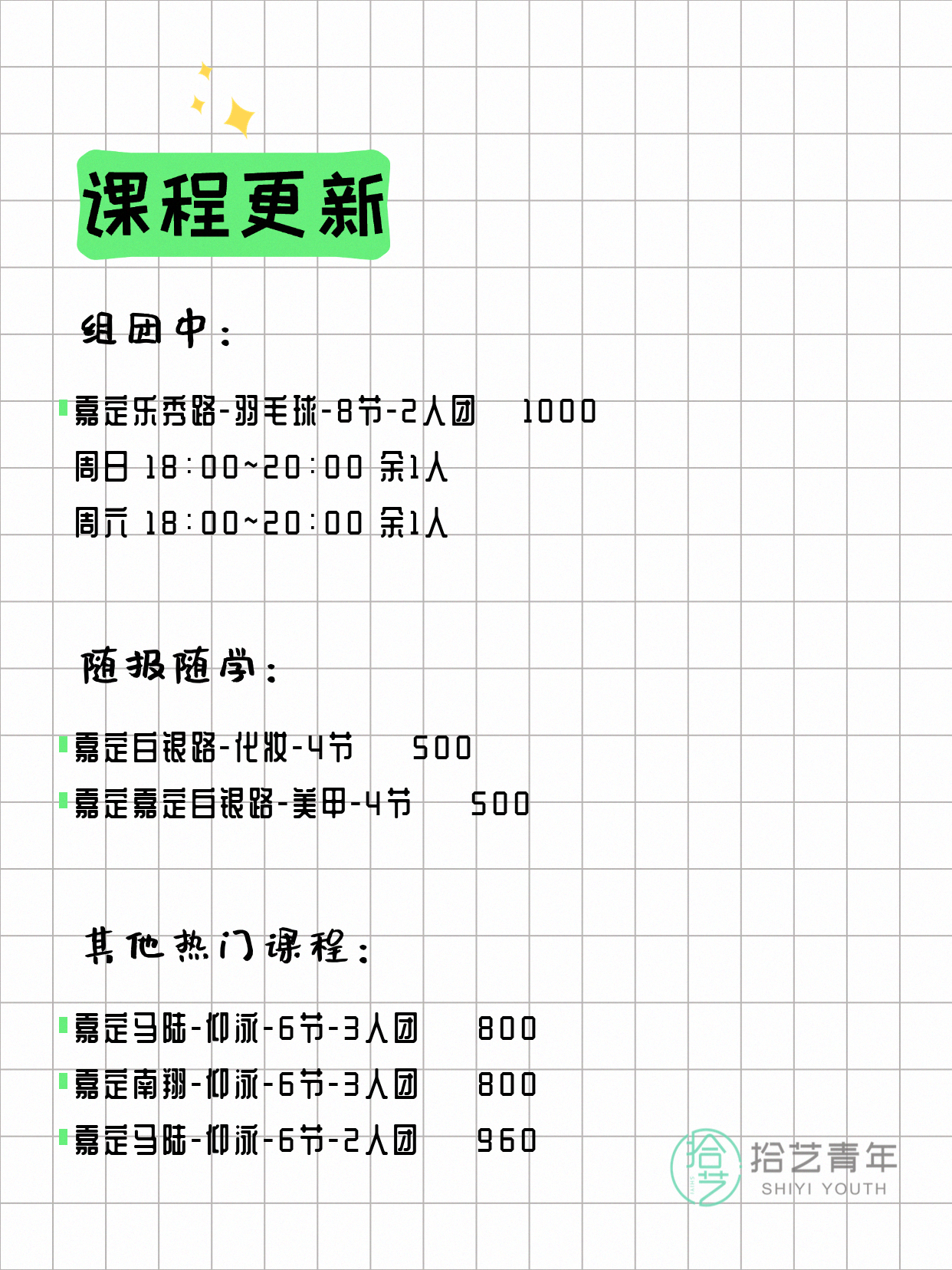 💡 提示:以上课程信息来自拾艺青年小程序,课程可能随报名动态变化,具体以小程序实时信息为准。