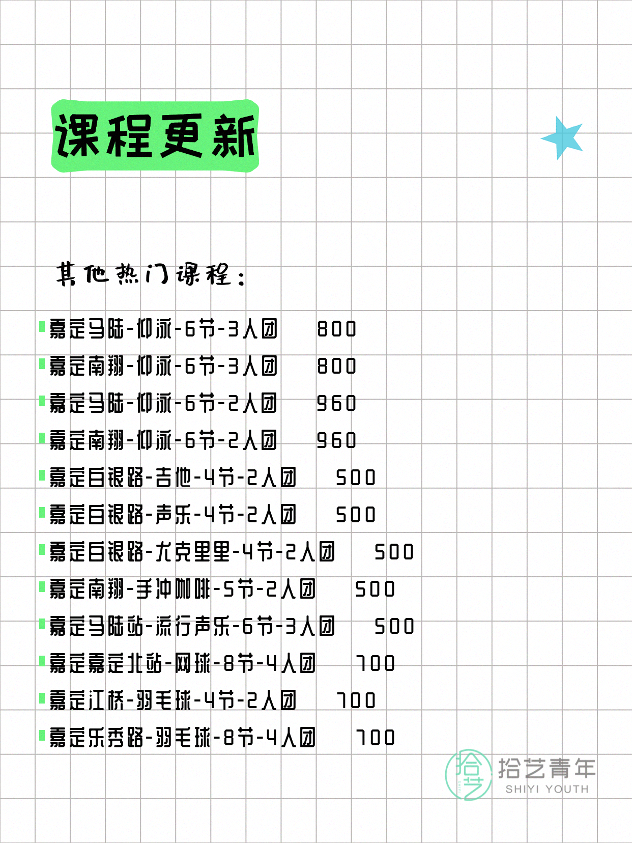 💡 提示:以上课程信息来自拾艺青年小程序,课程可能随报名动态变化,具体以小程序实时信息为准。