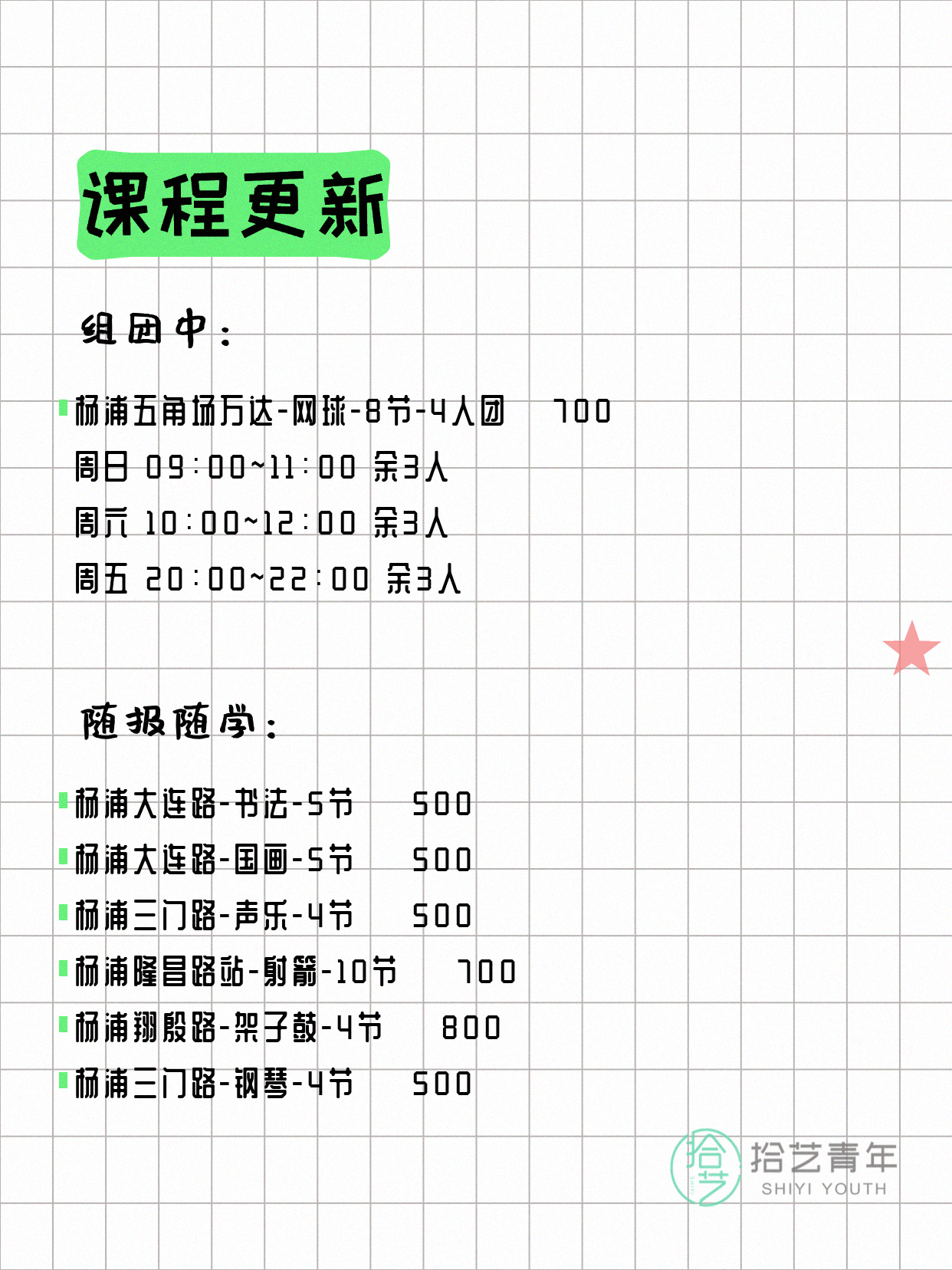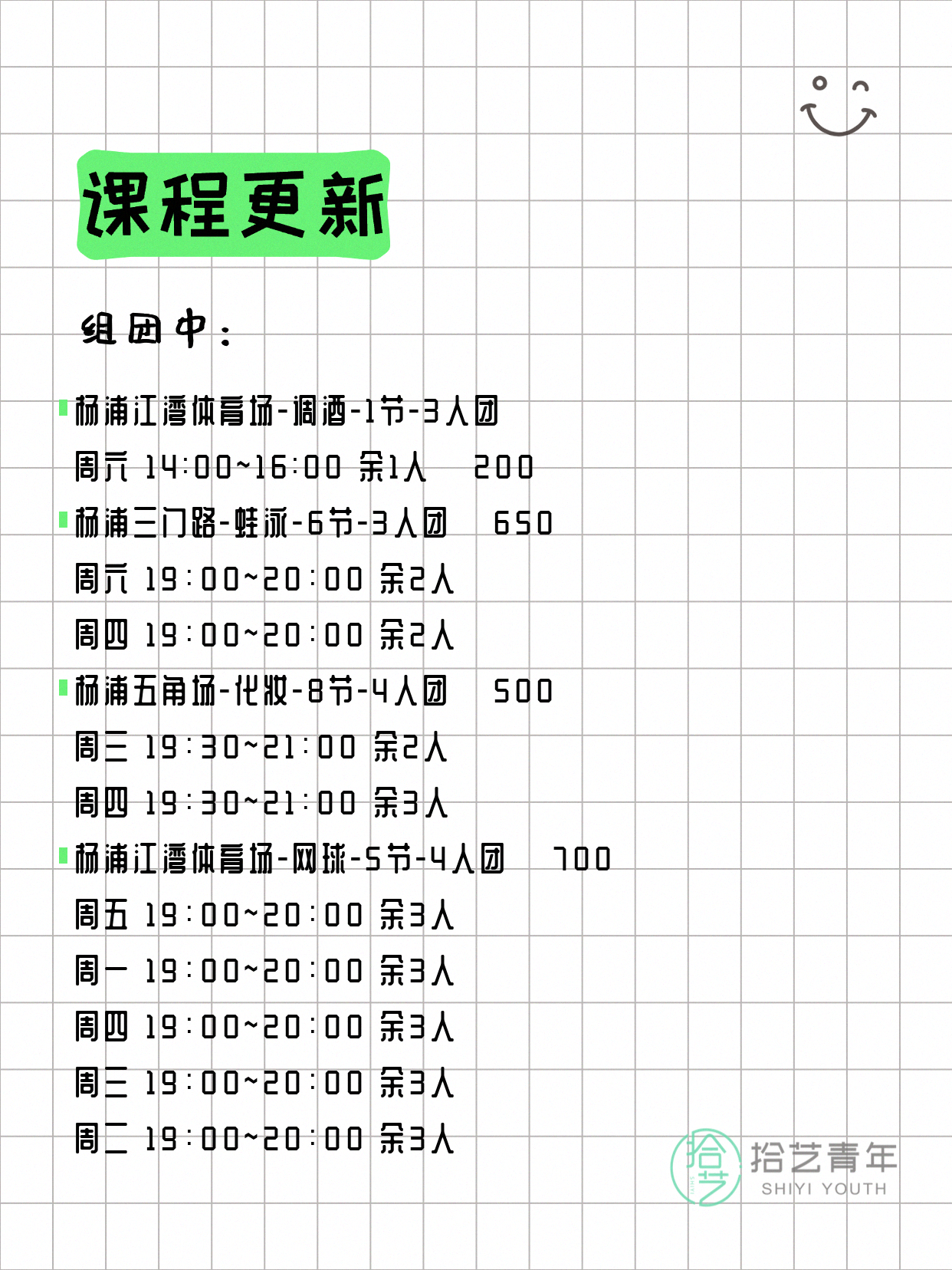 💡 提示:以上课程信息来自拾艺青年小程序,课程可能随报名动态变化,具体以小程序实时信息为准。