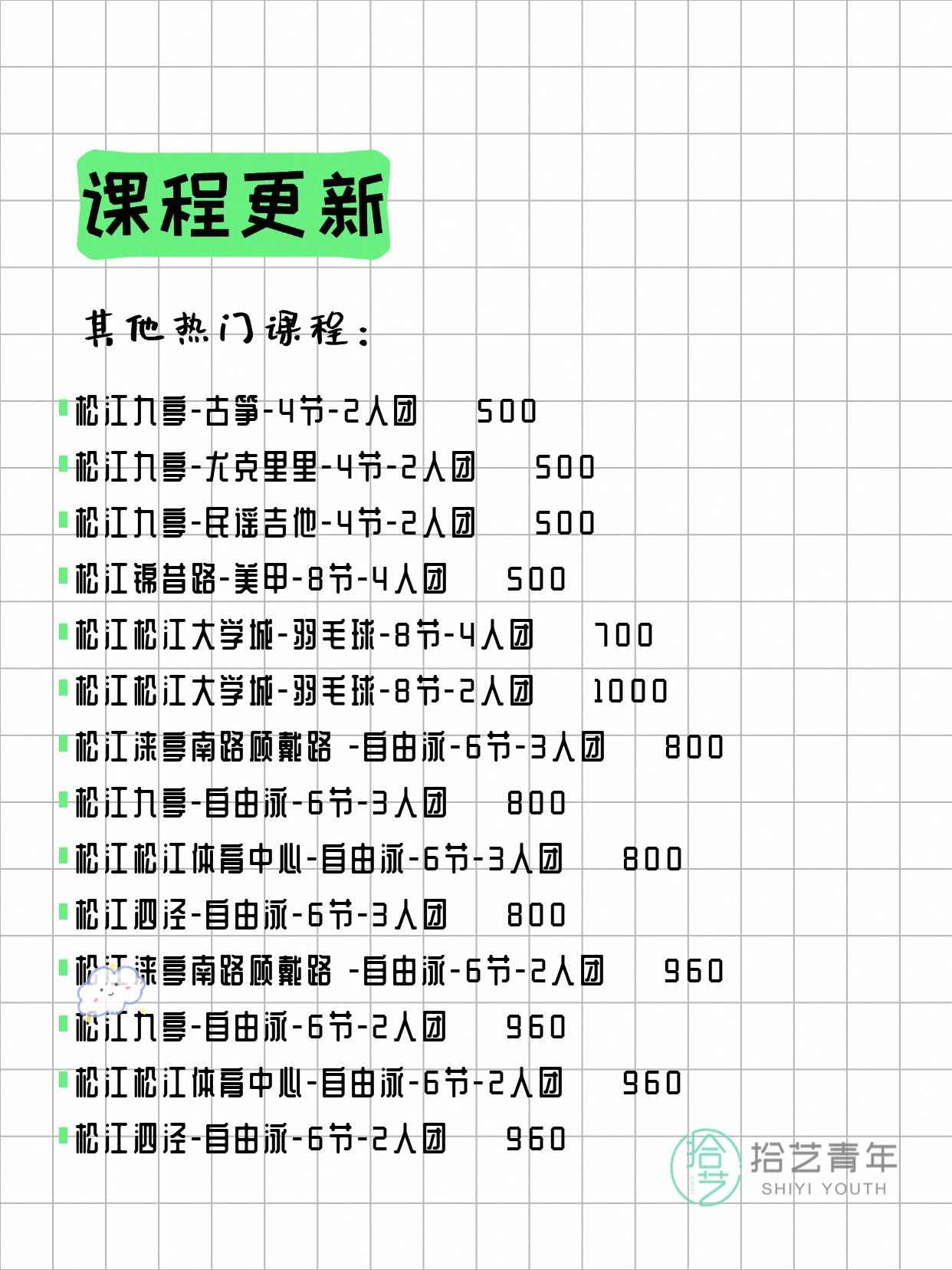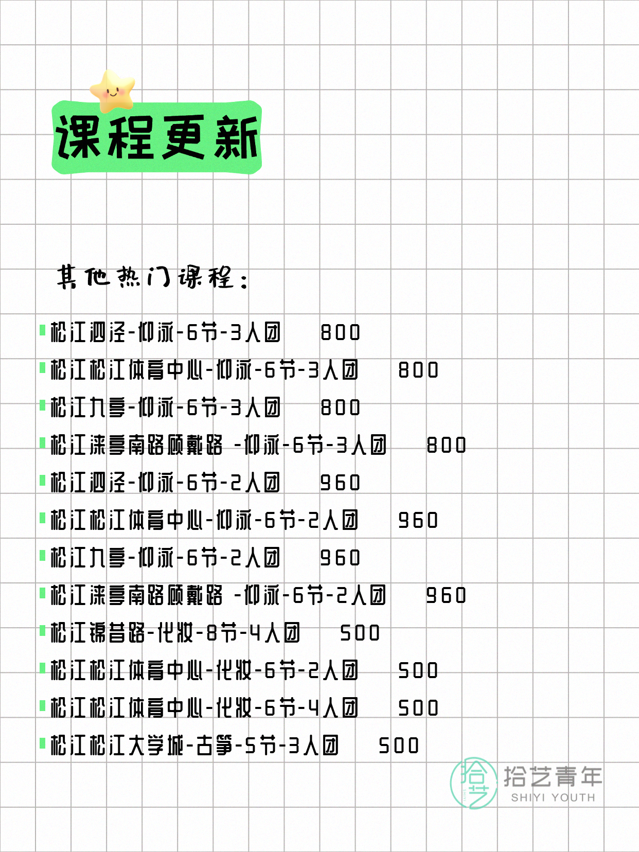 💡 提示:以上课程信息来自拾艺青年小程序,课程可能随报名动态变化,具体以小程序实时信息为准。