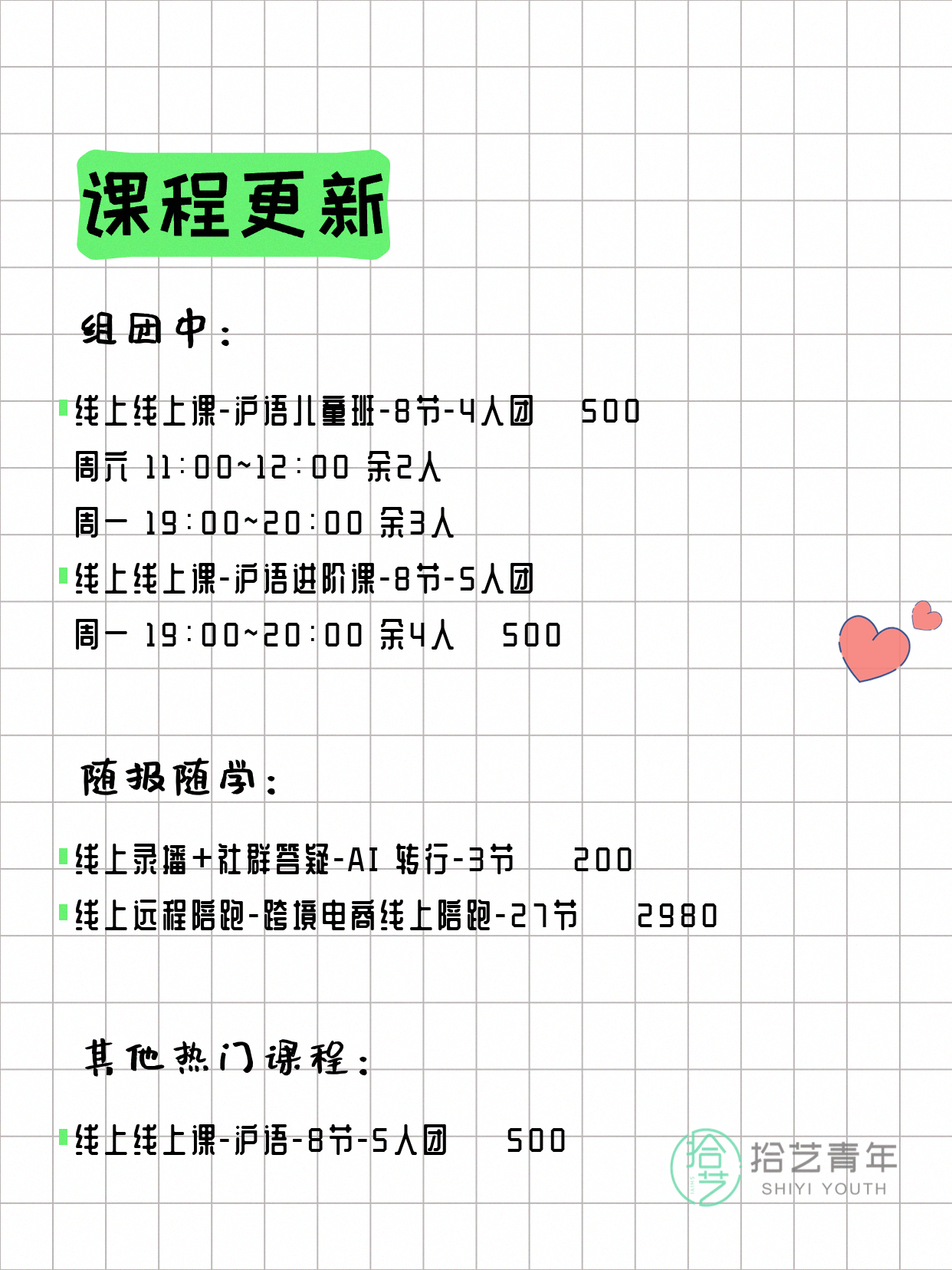💡 提示:以上课程信息来自拾艺青年小程序,课程可能随报名动态变化,具体以小程序实时信息为准。