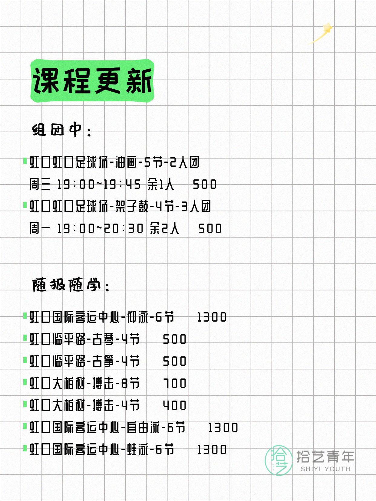 💡 提示:以上课程信息来自拾艺青年小程序,课程可能随报名动态变化,具体以小程序实时信息为准。