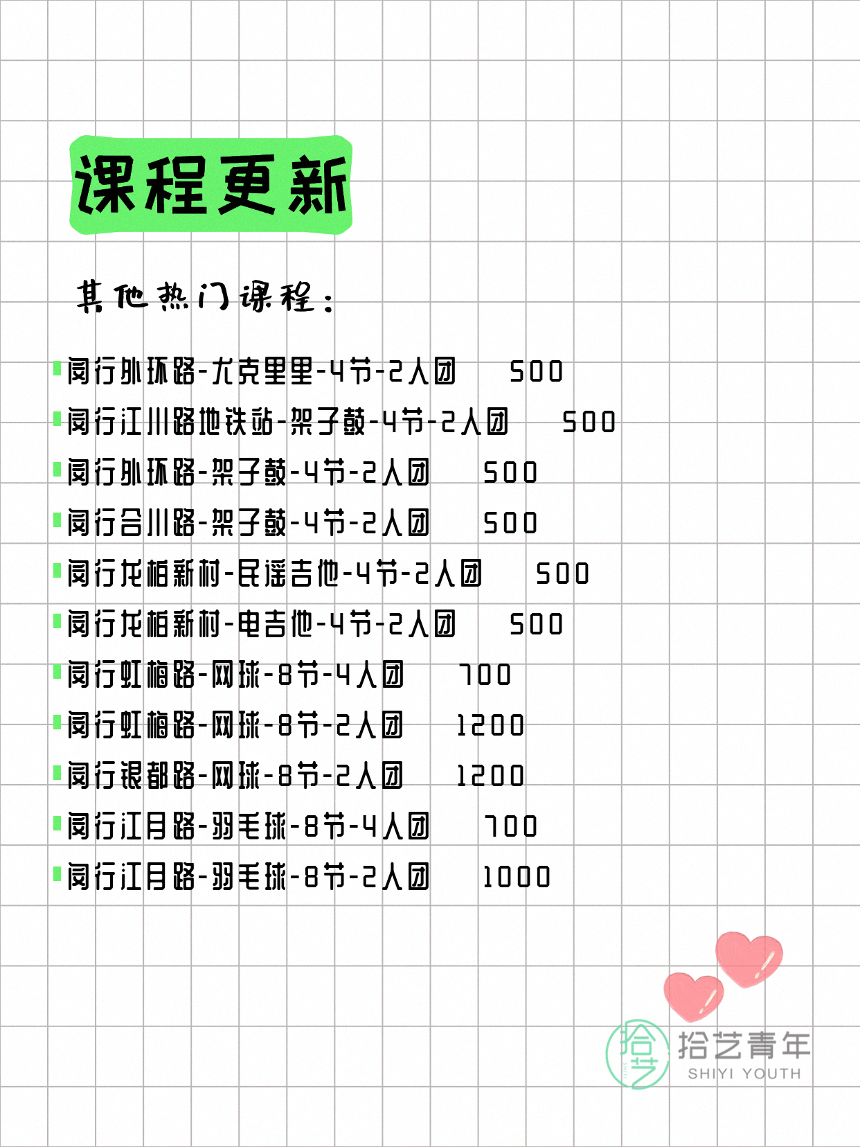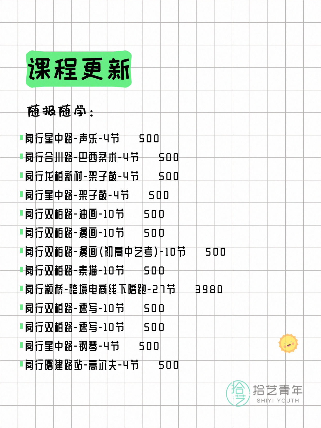 💡 提示:以上课程信息来自拾艺青年小程序,课程可能随报名动态变化,具体以小程序实时信息为准。