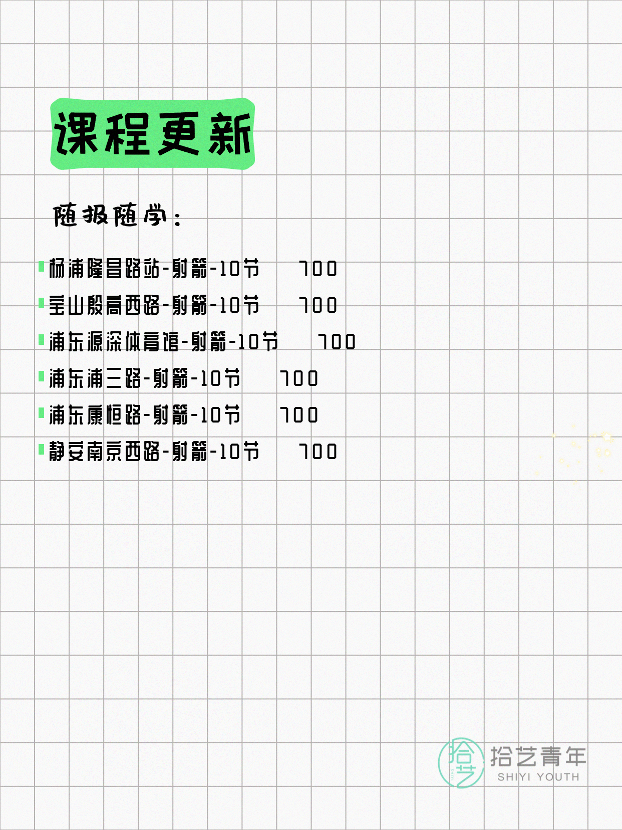 💡 提示:以上课程信息来自拾艺青年小程序,课程可能随报名动态变化,具体以小程序实时信息为准。