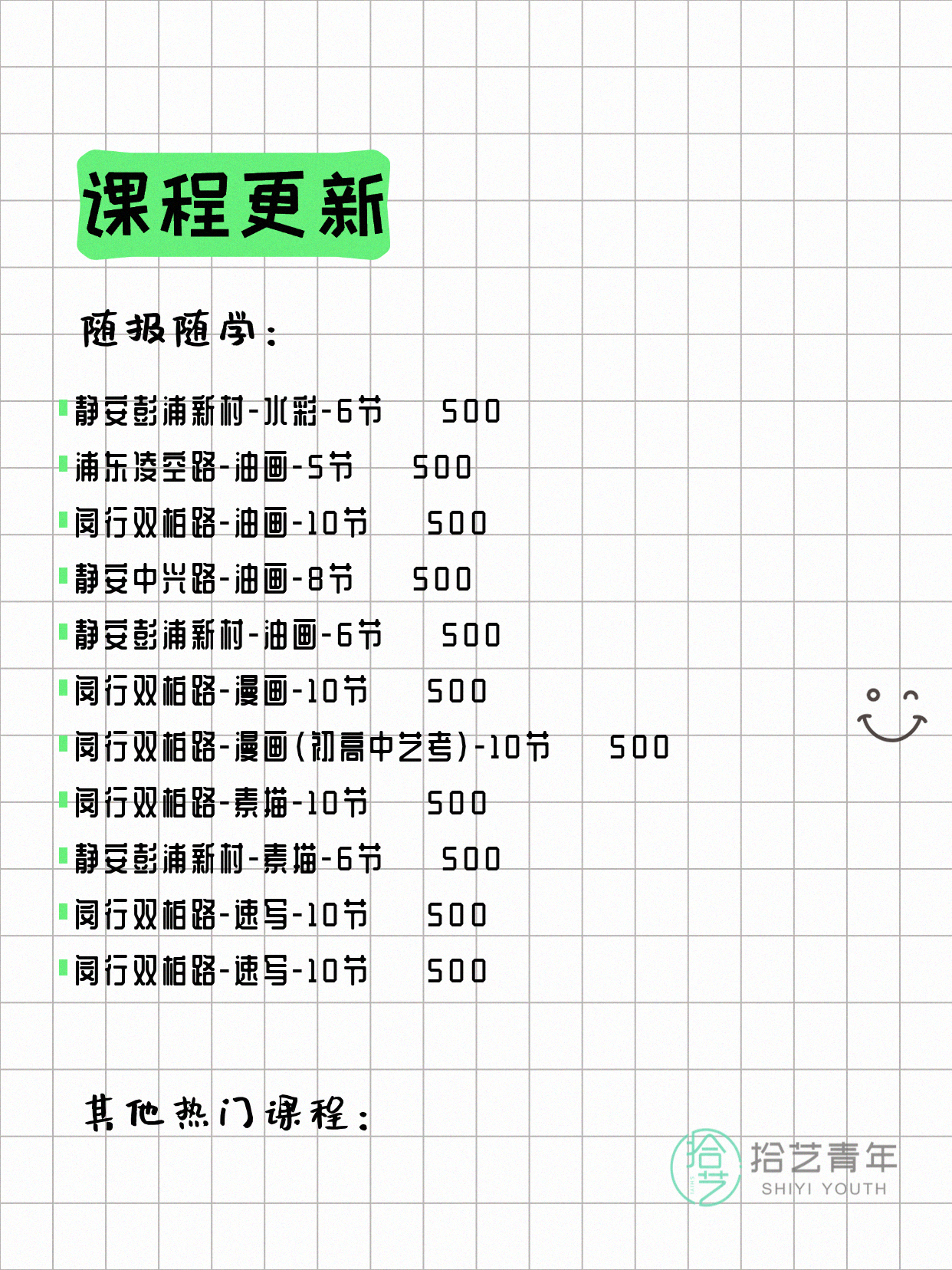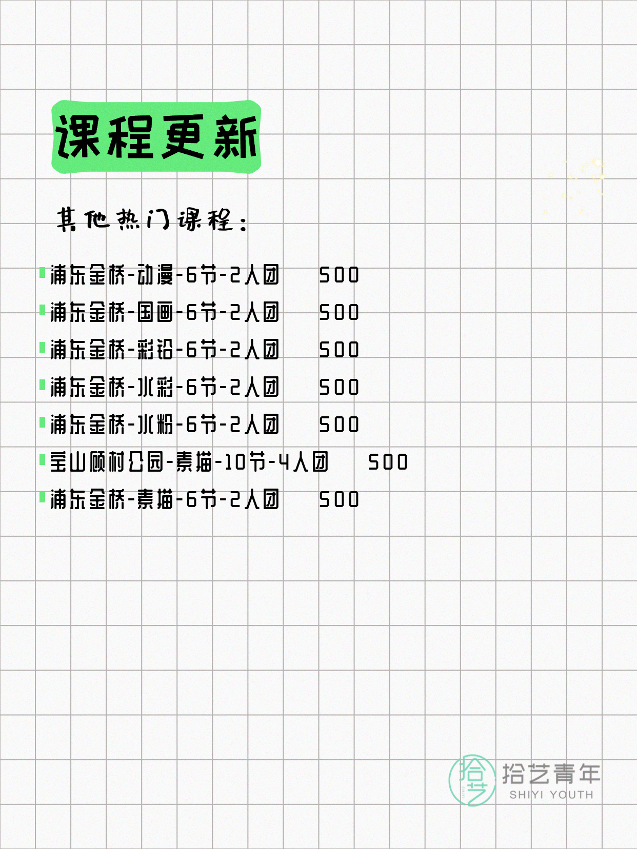 💡 提示:以上课程信息来自拾艺青年小程序,课程可能随报名动态变化,具体以小程序实时信息为准。