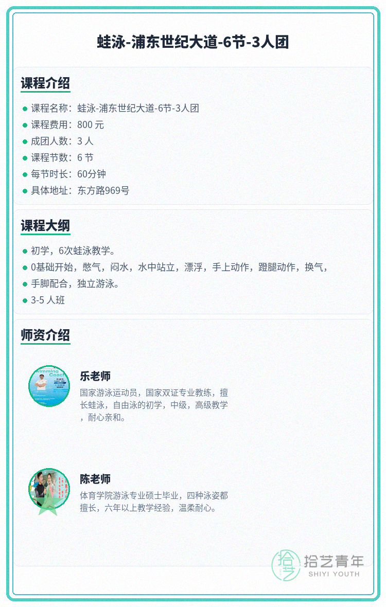 资讯>综合>正文世纪大道蛙泳课,差1人就开课拾艺青年2026-04-261 / 2想学蛙泳的浦东搭子看过来!差最后1位就能成团🏊🏫 上课地点:东方路969号📅 课程安排:共6节 | 周日 19:00-20:00📖 课程大纲:初学,6次蛙泳教学。0基础开始,憋气,闷水,水中站立,漂浮,手上动作,蹬腿动作,换气,手脚配合,独立游泳。3-5 人班👥 3人团 | 已报2人 | 还差1人开课#上海夜校 #浦东夜校 #蛙泳课程 #夜校拼团 #上海线下课相关标签#上海夜校#浦东夜校#蛙泳课程#夜校拼团#上海线下课