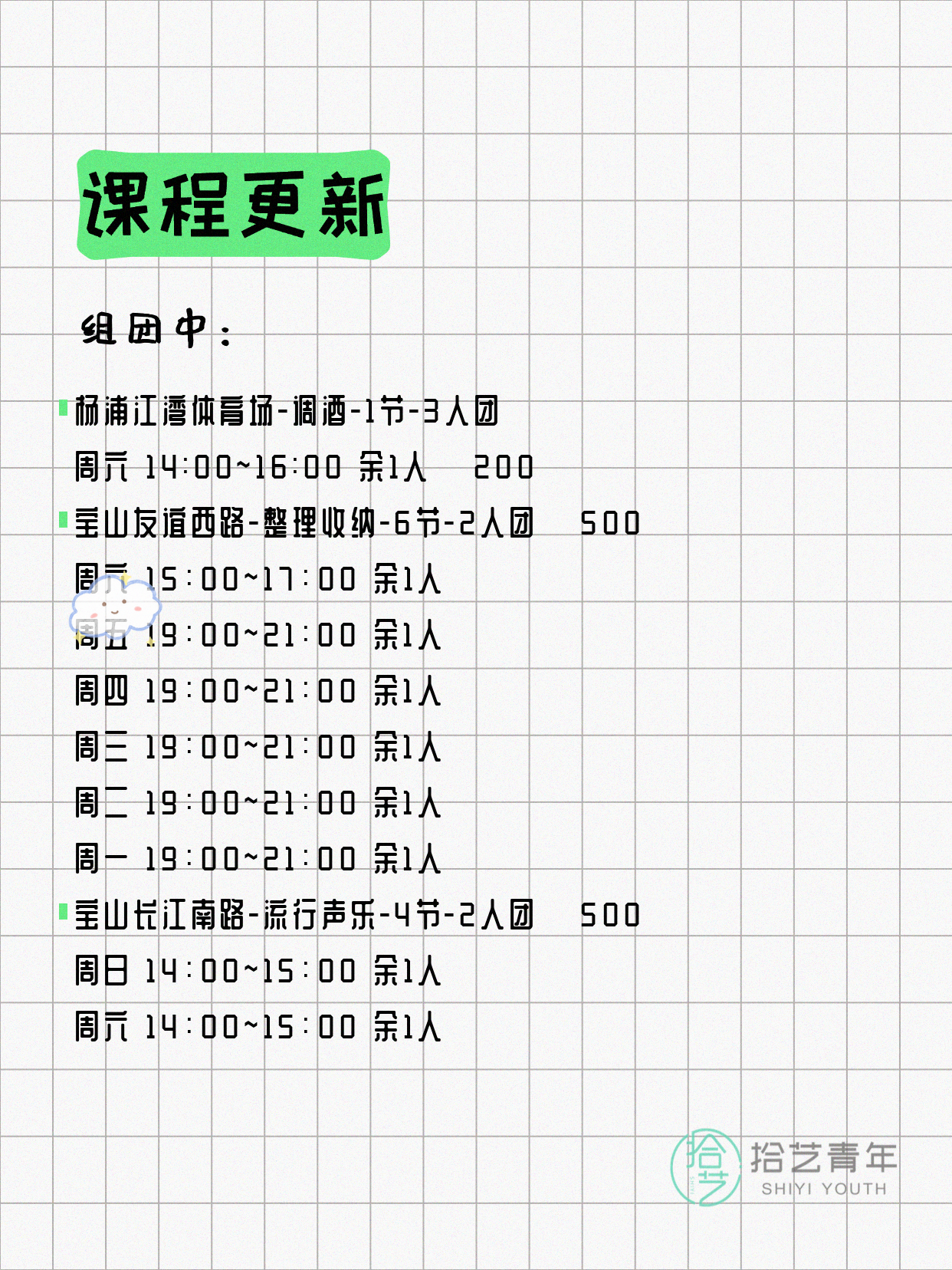 - 宝山友谊西路-整理收纳-6节-2人团 周四 19:00-21:00 余1人 💰 500