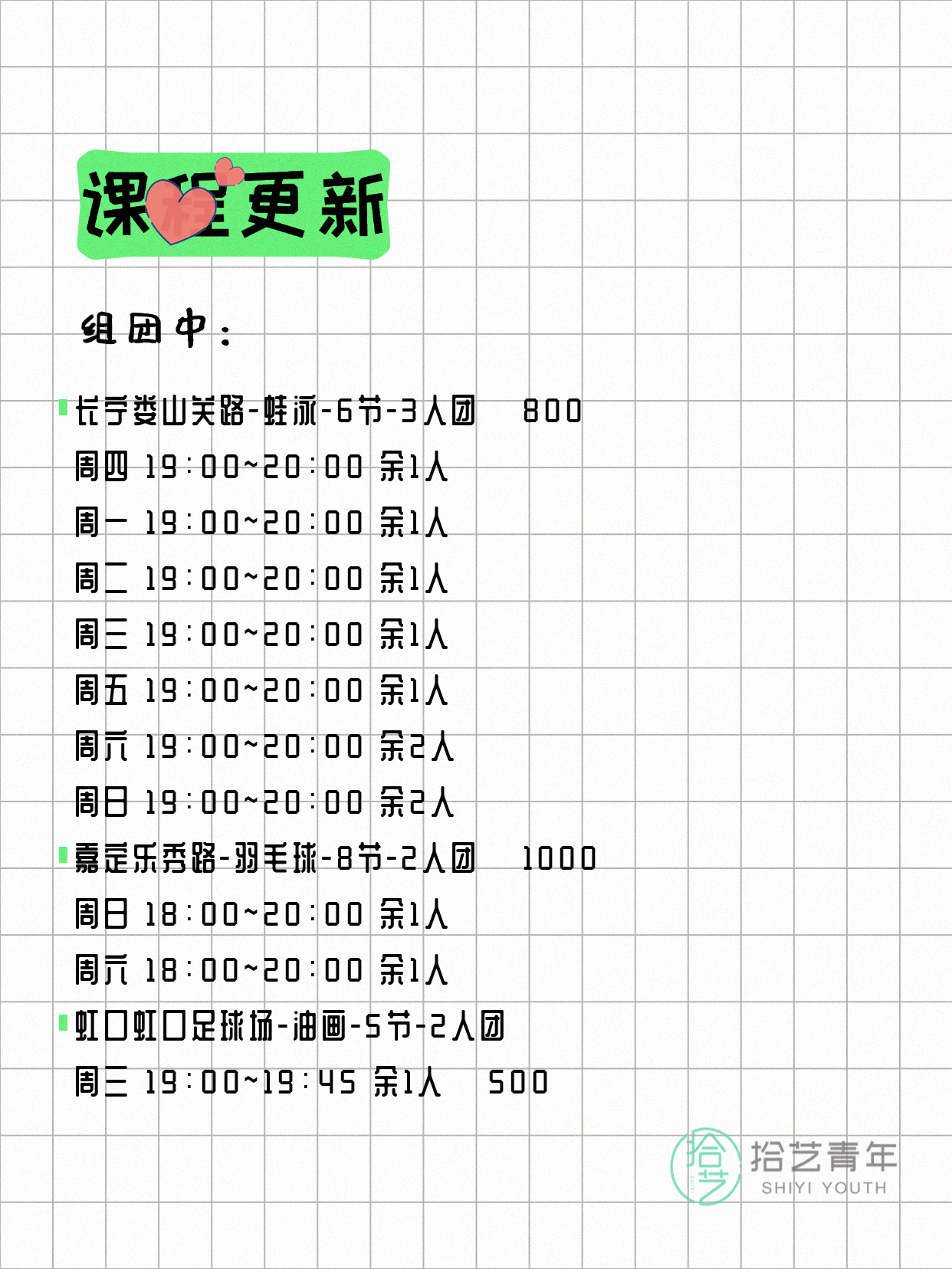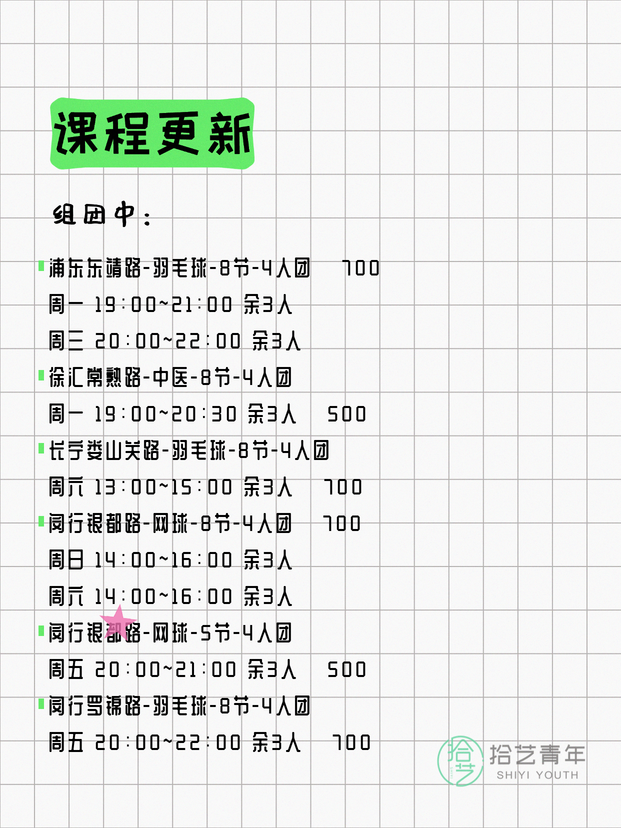 - 嘉定乐秀路-羽毛球-8节-2人团 周六 18:00-20:00 余1人 💰 1000