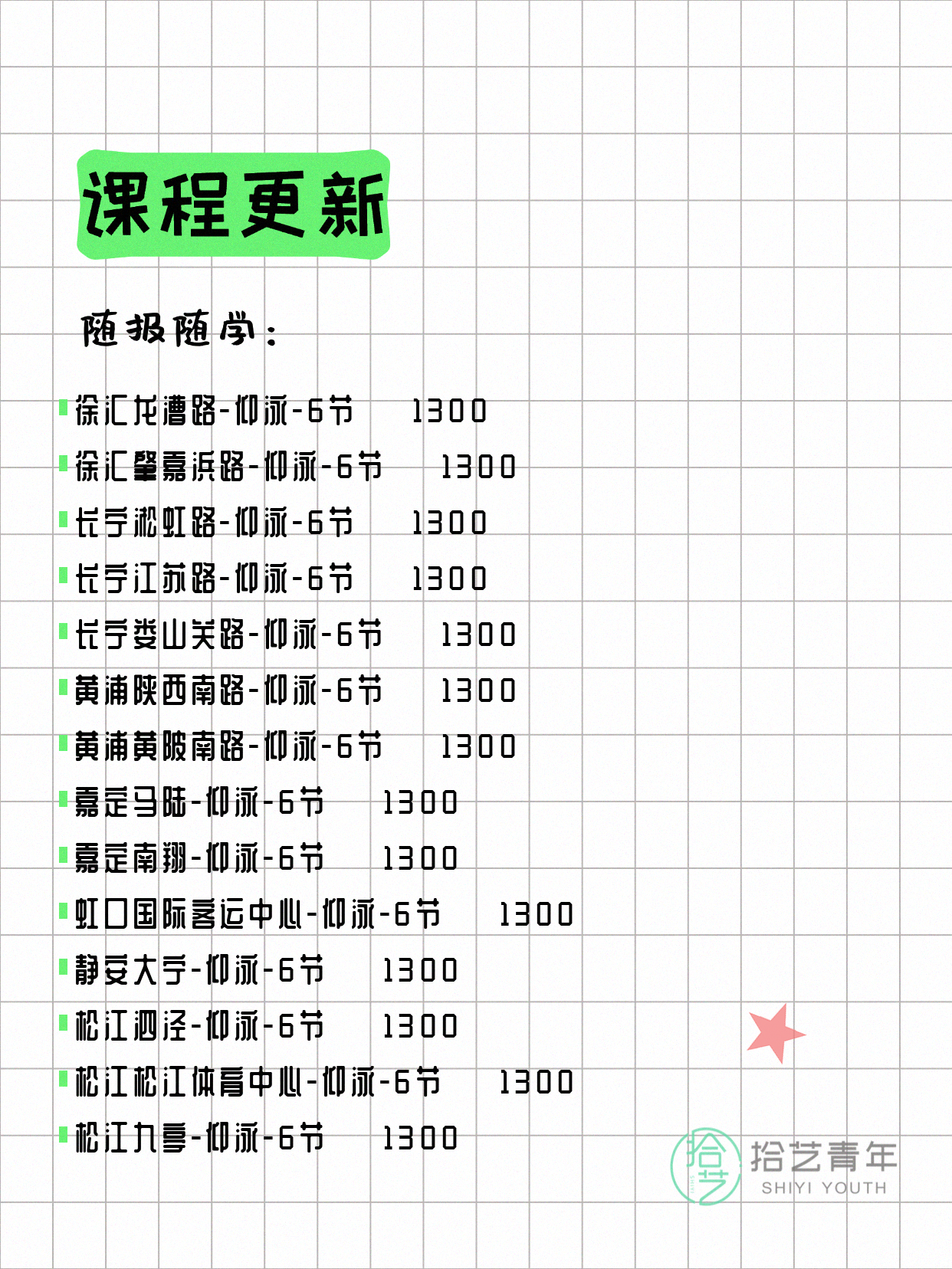 - 奉贤南桥路-仰泳-6节 💰 1300