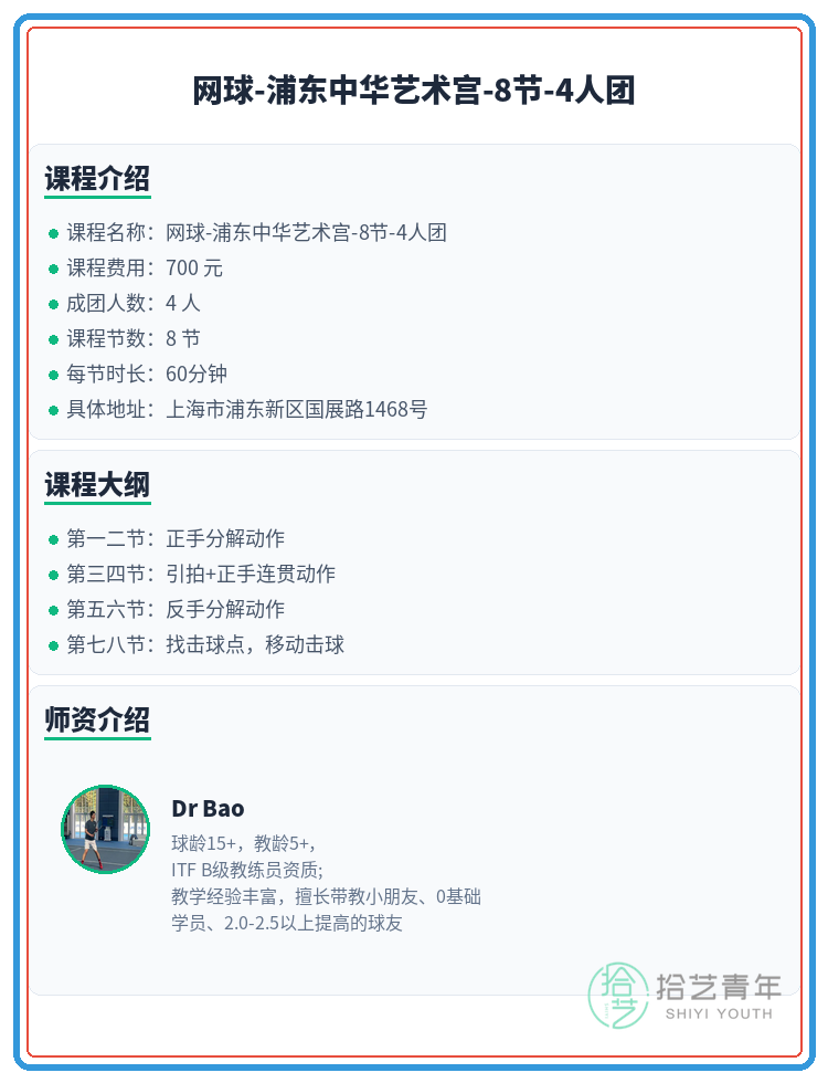 资讯>综合>正文浦东网球|就差你1个!中华艺术宫拾艺青年2026-03-061 / 2还差1人就开课啦!网球的小伙伴们速来~🙋🏫 上课地点:上海市浦东新区国展路1468号📅 课程安排:共8节 | 周日 15:00-17:00📖 课程大纲:第一二节:正手分解动作第三四节:引拍+正手连贯动作第五六节:反手分解动作第七八节:找击球点,移动击球👥 4人团 | 已报3人 | 还差1人开课#上海夜校 #浦东夜校 #网球课程 #夜校拼团 #上海线下课相关标签#上海夜校#浦东夜校#网球课程#夜校拼团#上海线下课