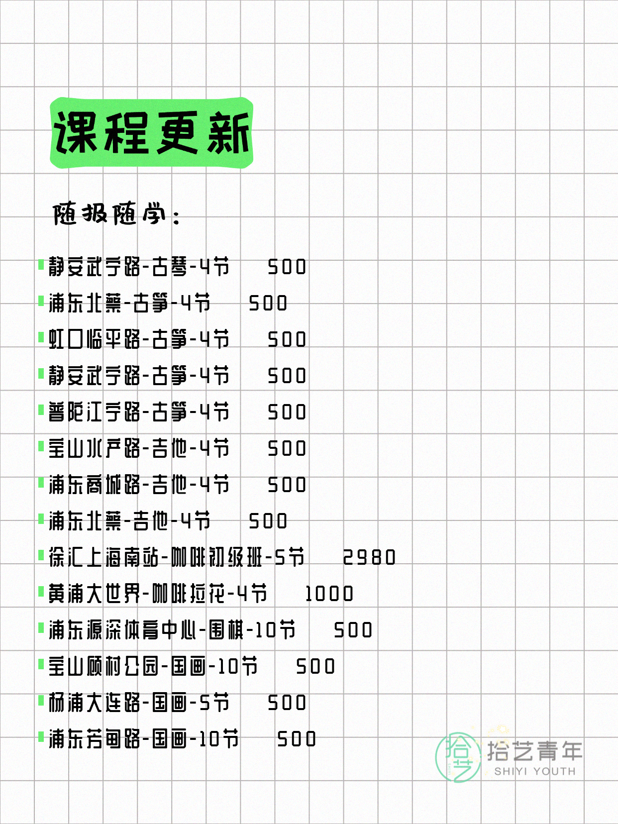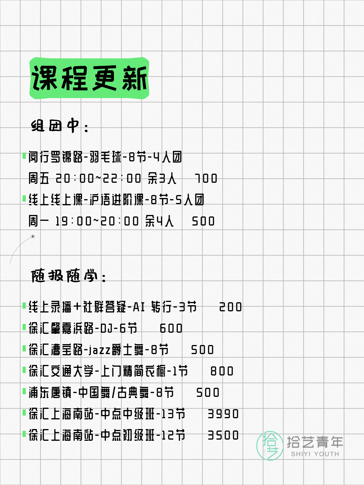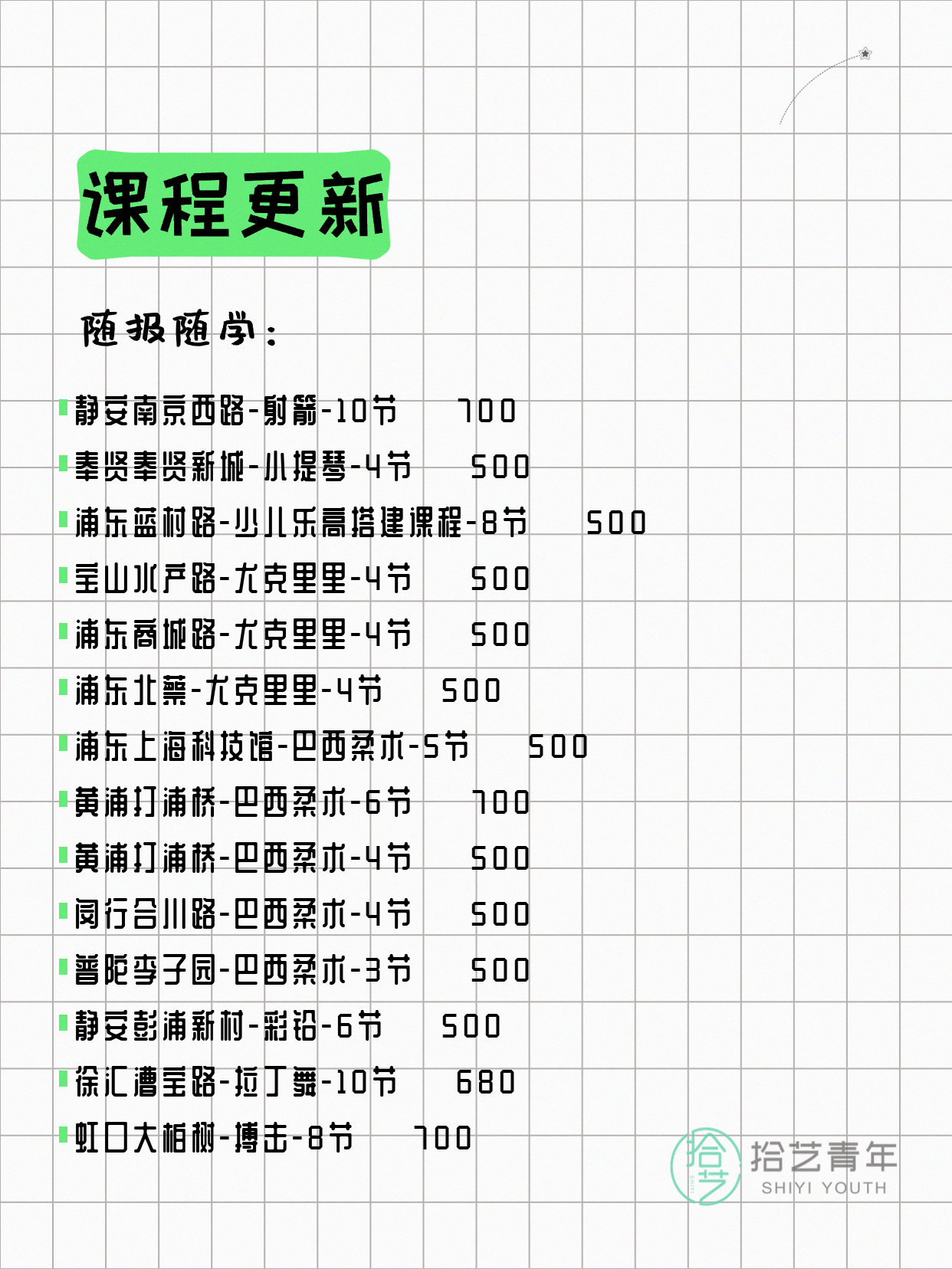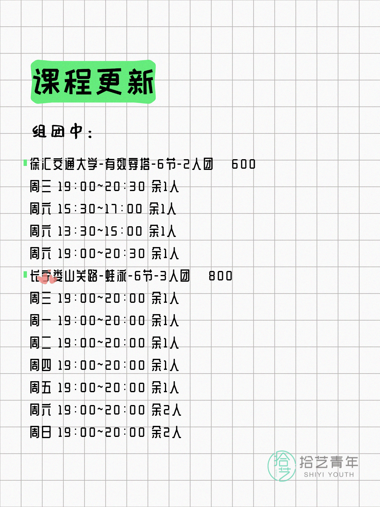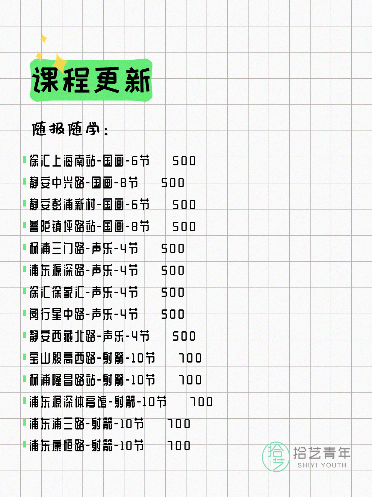 💡 提示:以上课程信息来自拾艺青年小程序,课程可能随报名动态变化,具体以小程序实时信息为准。