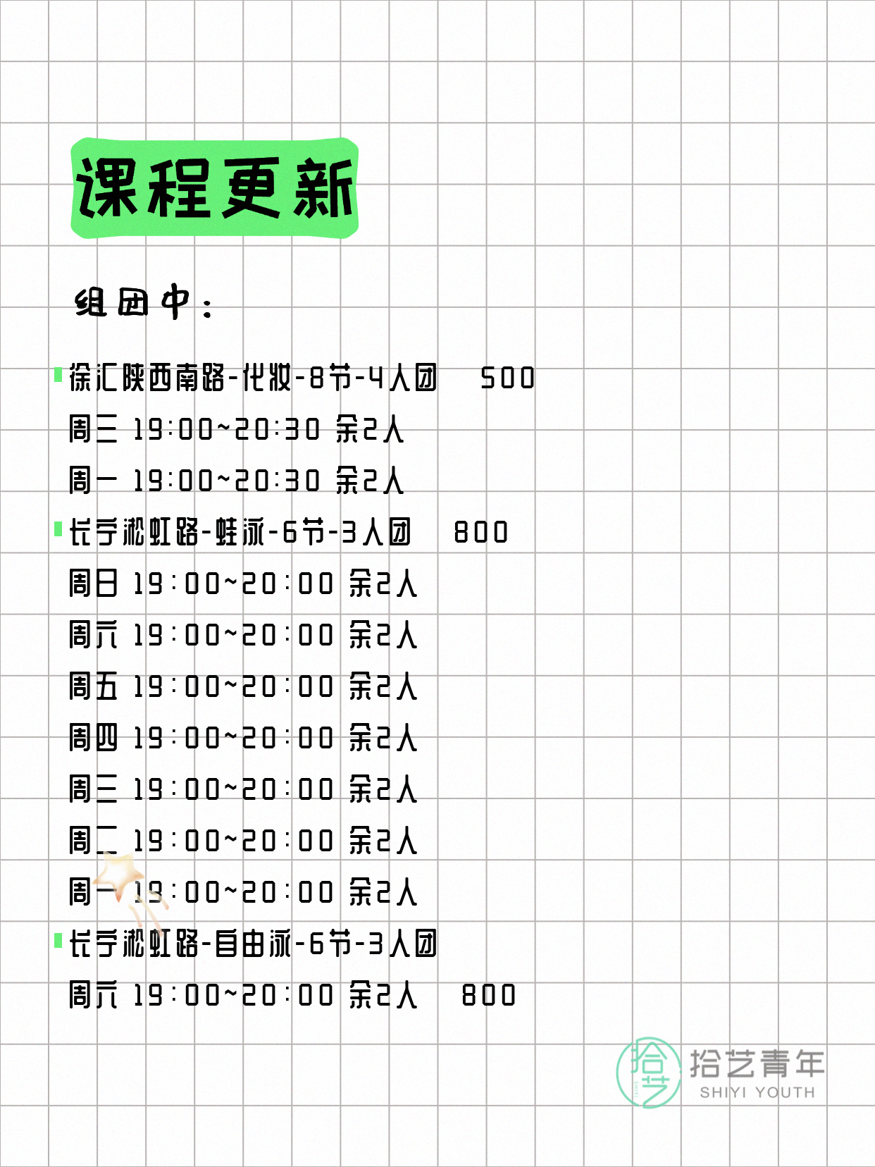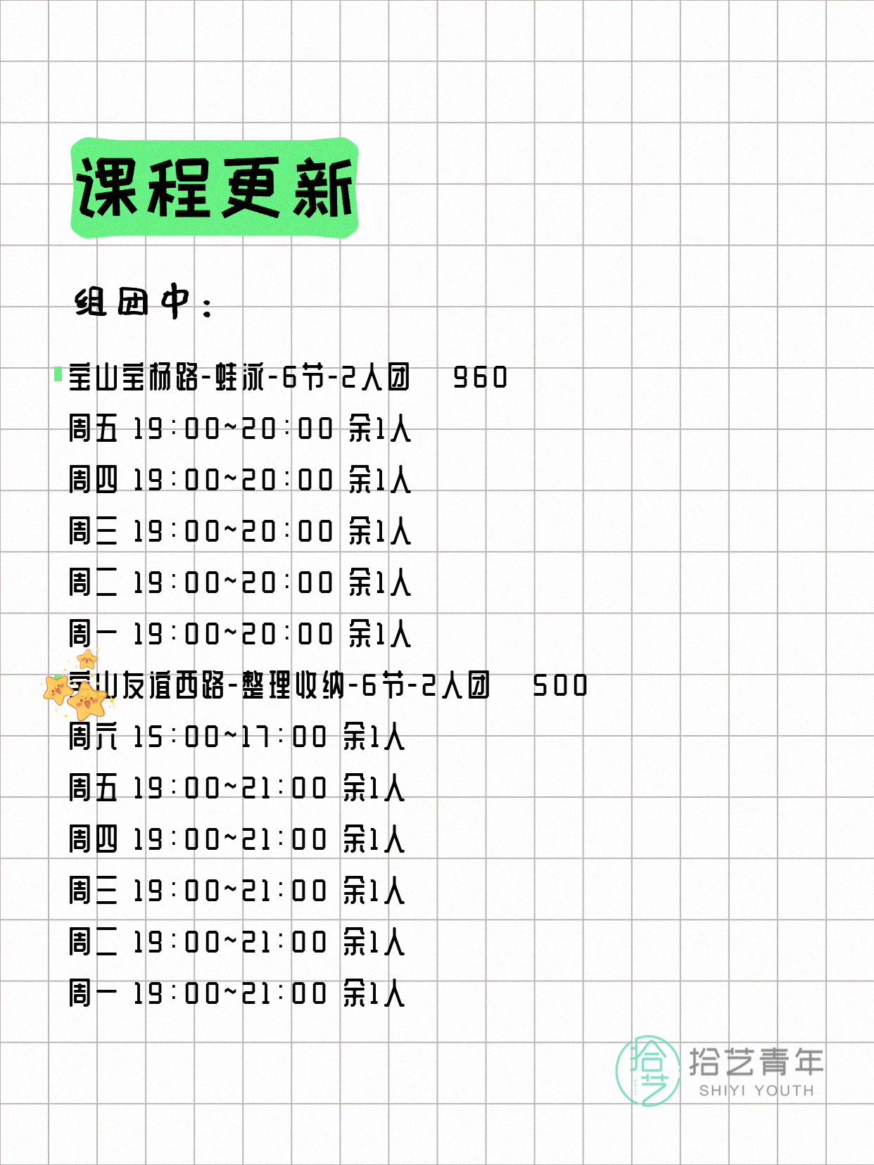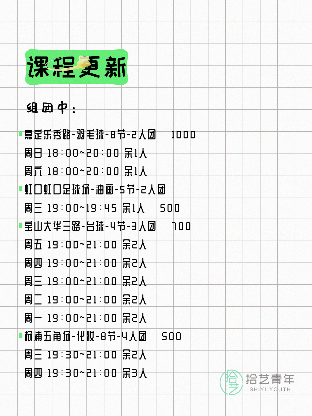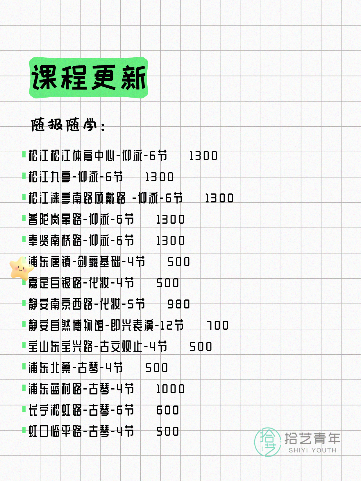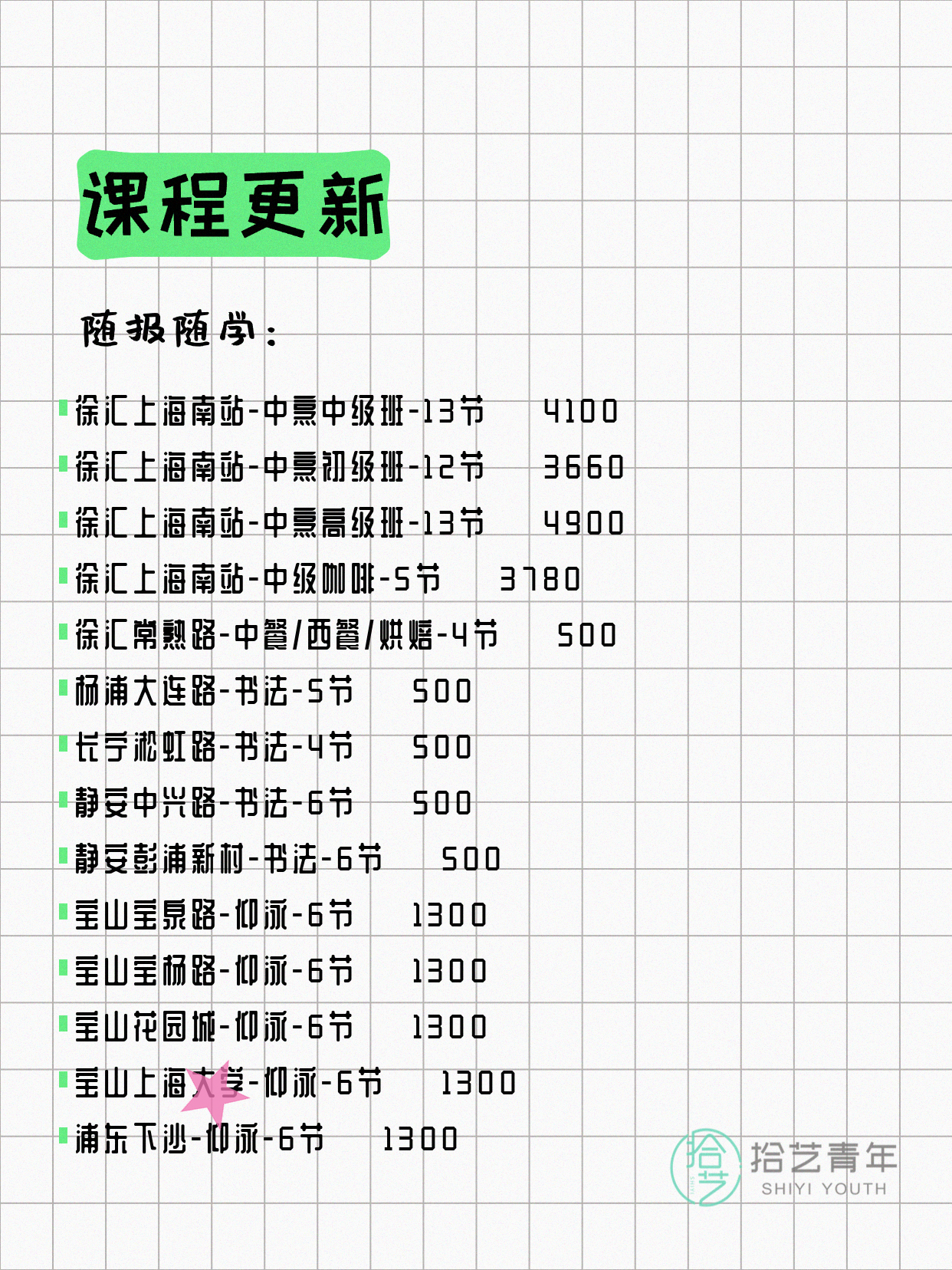 💡 提示:以上课程信息来自拾艺青年小程序,课程可能随报名动态变化,具体以小程序实时信息为准。