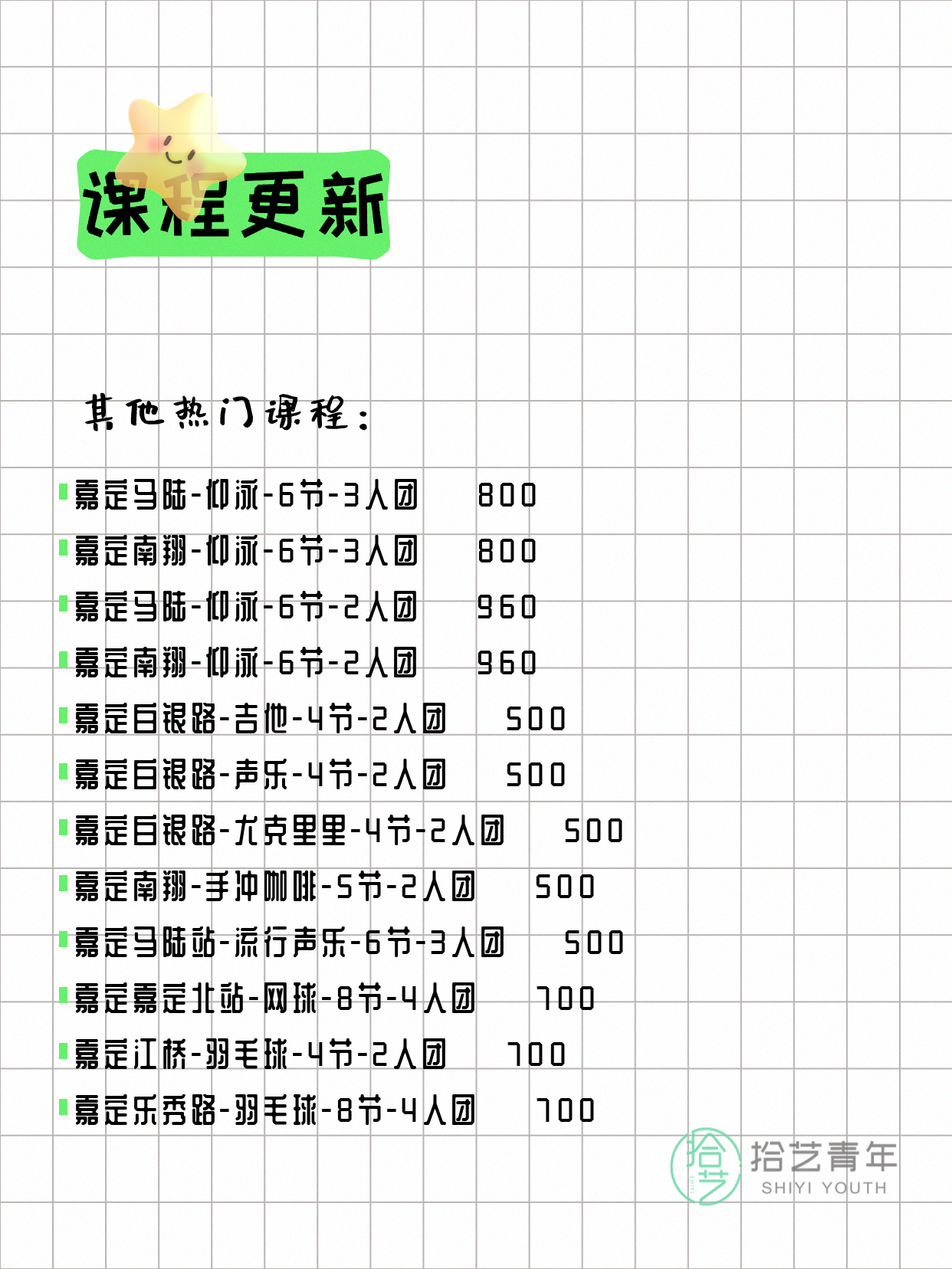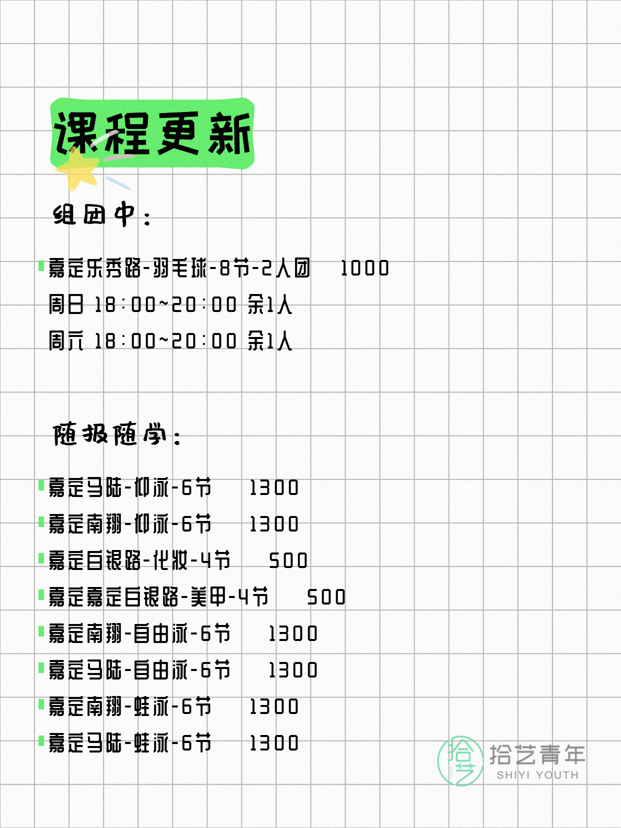 💡 提示:以上课程信息来自拾艺青年小程序,课程可能随报名动态变化,具体以小程序实时信息为准。