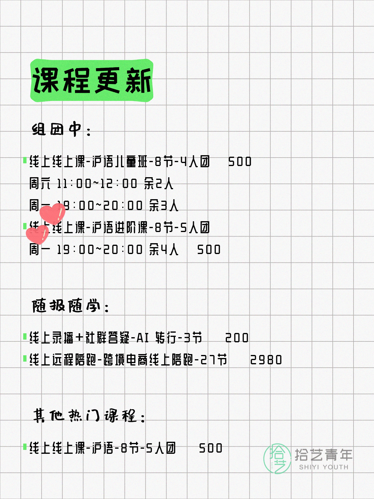 💡 提示:以上课程信息来自拾艺青年小程序,课程可能随报名动态变化,具体以小程序实时信息为准。