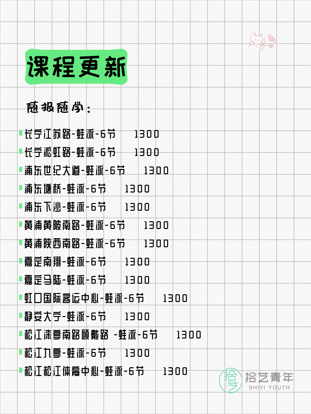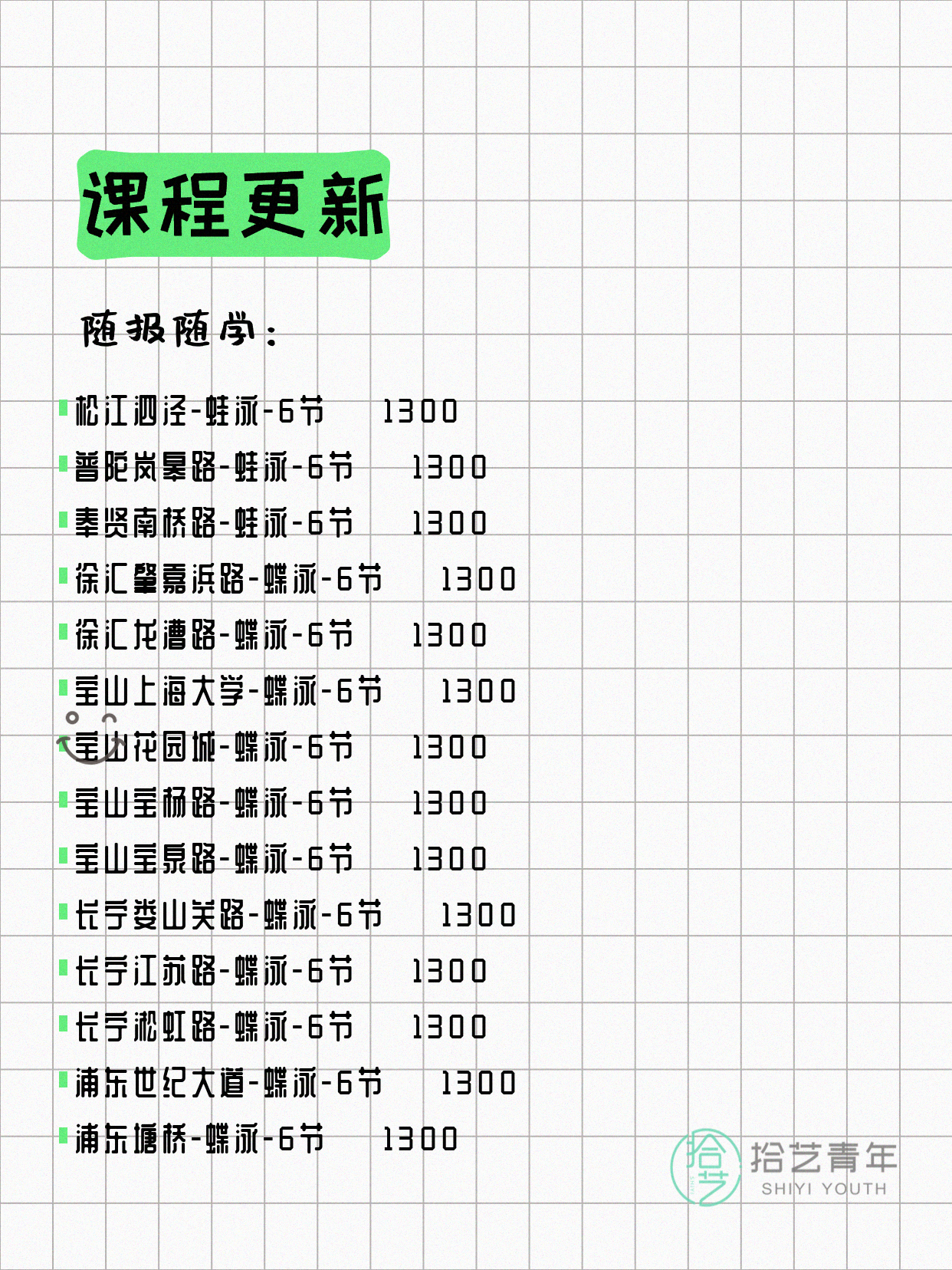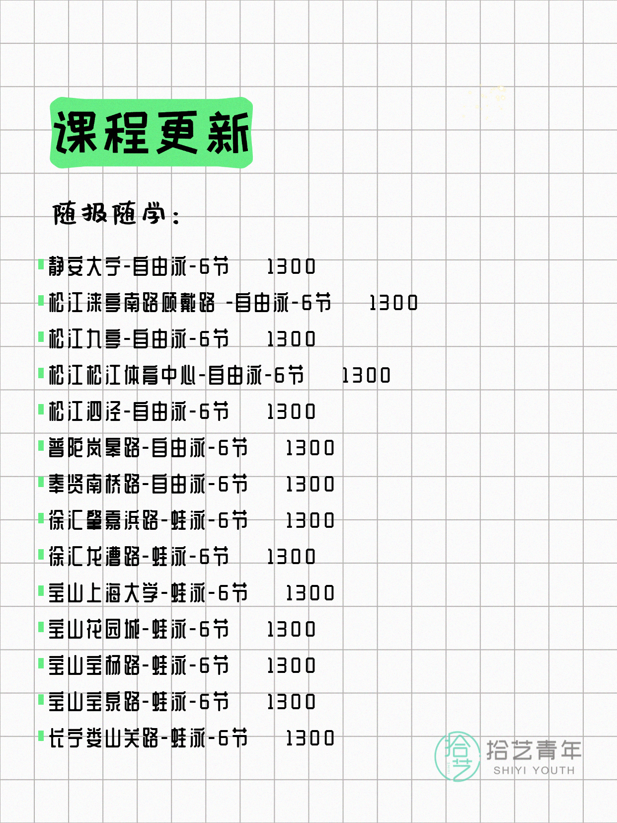 💡 提示:以上课程信息来自拾艺青年小程序,课程可能随报名动态变化,具体以小程序实时信息为准。