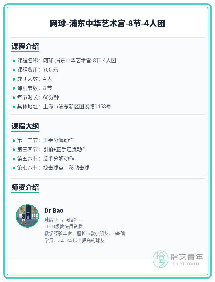 资讯>综合>正文浦东网球|就差你1个!中华艺术宫拾艺青年2026-03-061 / 2还差1人就开课啦!网球的小伙伴们速来~🙋🏫 上课地点:上海市浦东新区国展路1468号📅 课程安排:共8节 | 周日 15:00-17:00📖 课程大纲:第一二节:正手分解动作第三四节:引拍+正手连贯动作第五六节:反手分解动作第七八节:找击球点,移动击球👥 4人团 | 已报3人 | 还差1人开课#上海夜校 #浦东夜校 #网球课程 #夜校拼团 #上海线下课相关标签#上海夜校#浦东夜校#网球课程#夜校拼团#上海线下课