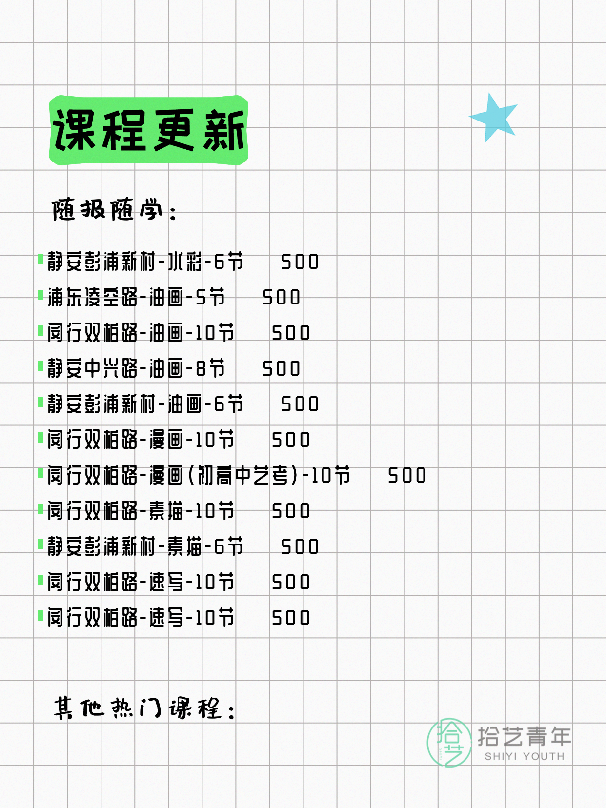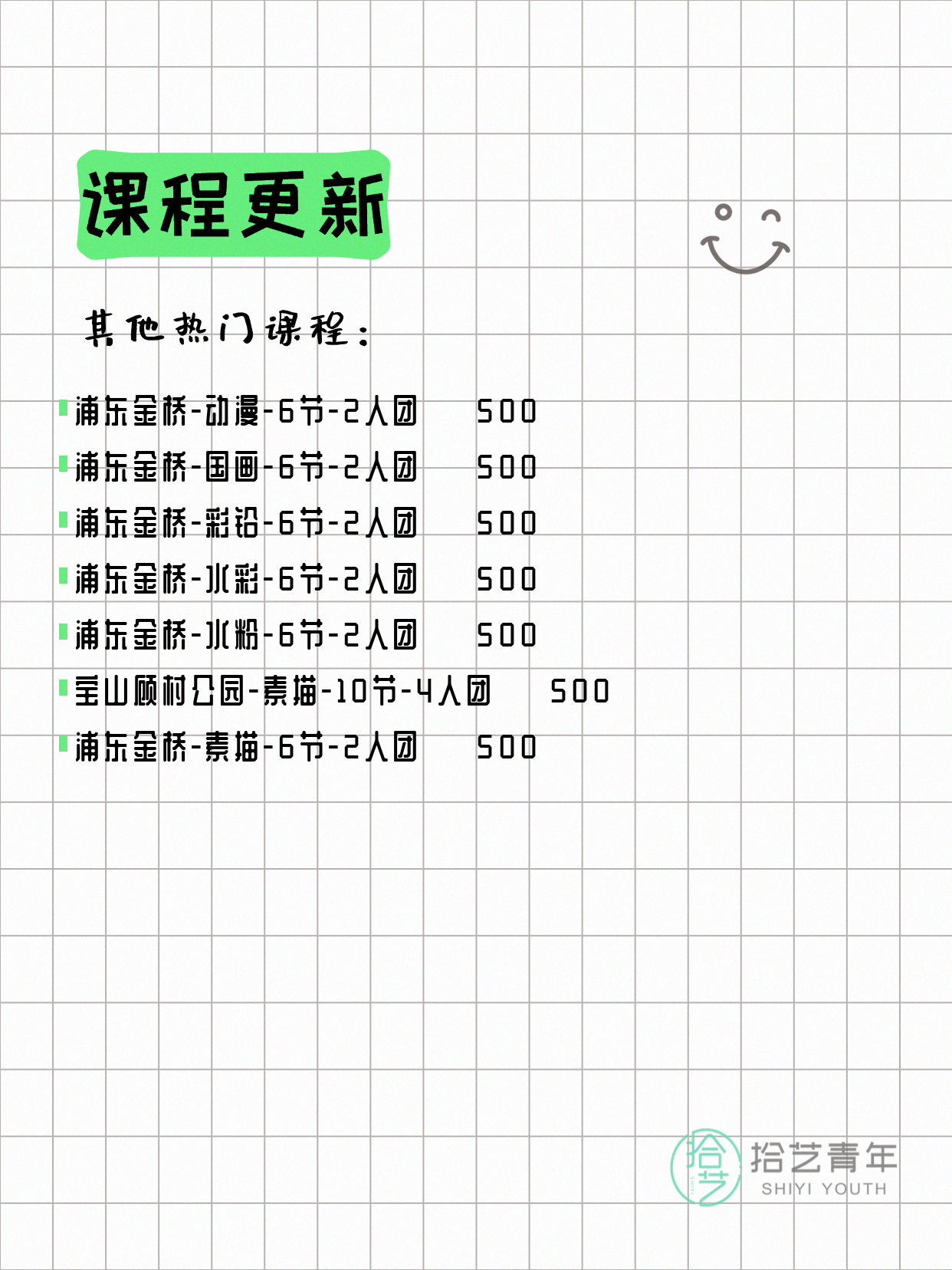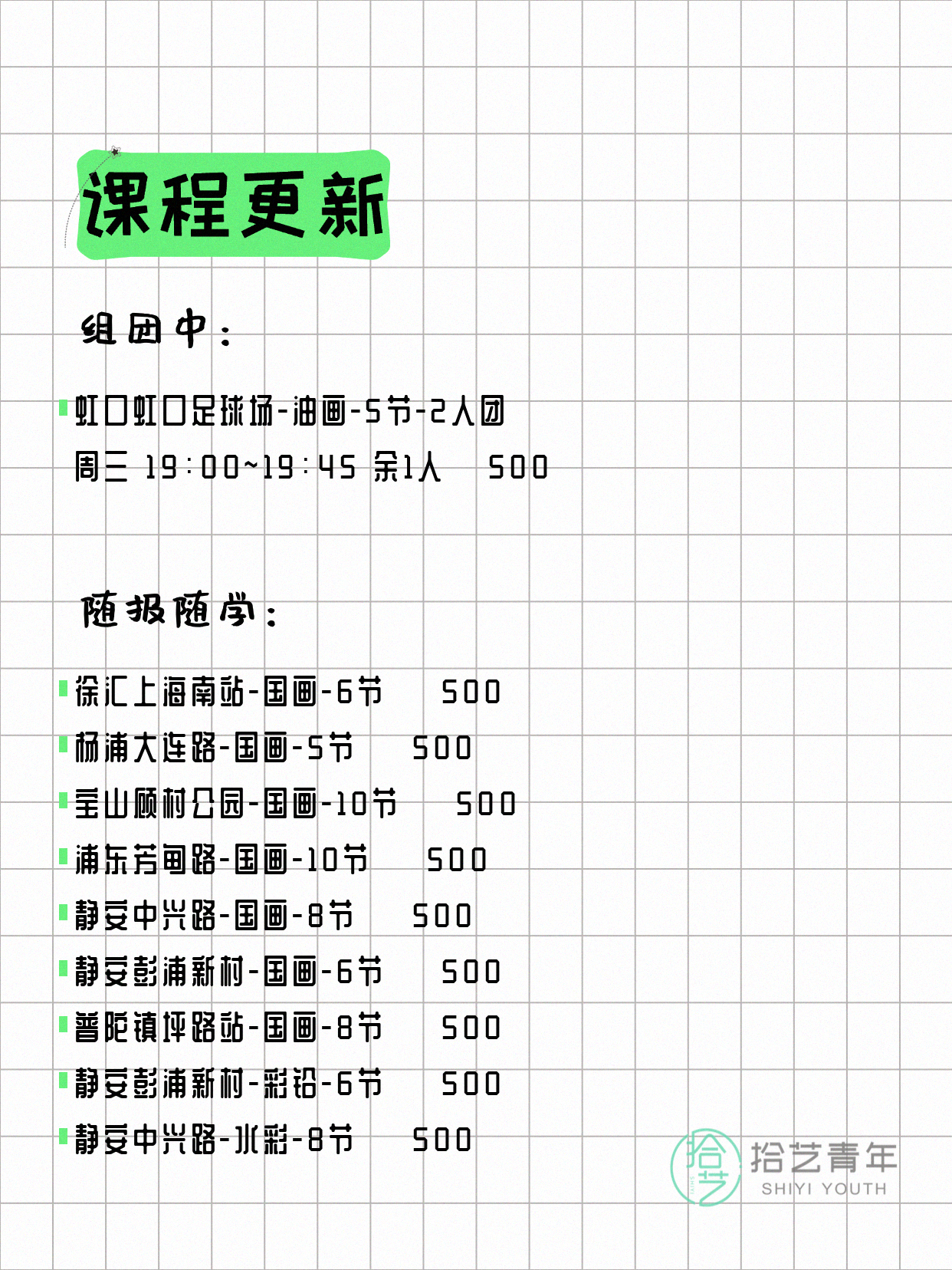 💡 提示:以上课程信息来自拾艺青年小程序,课程可能随报名动态变化,具体以小程序实时信息为准。