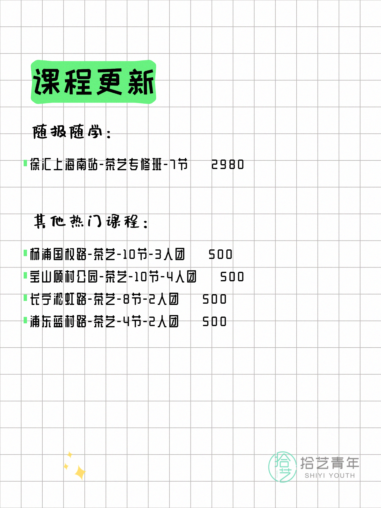 💡 提示:以上课程信息来自拾艺青年小程序,课程可能随报名动态变化,具体以小程序实时信息为准。