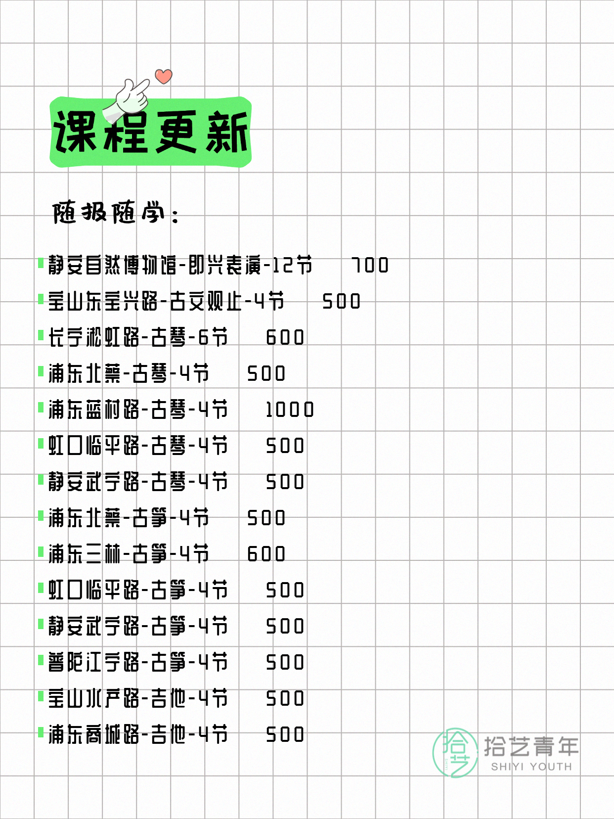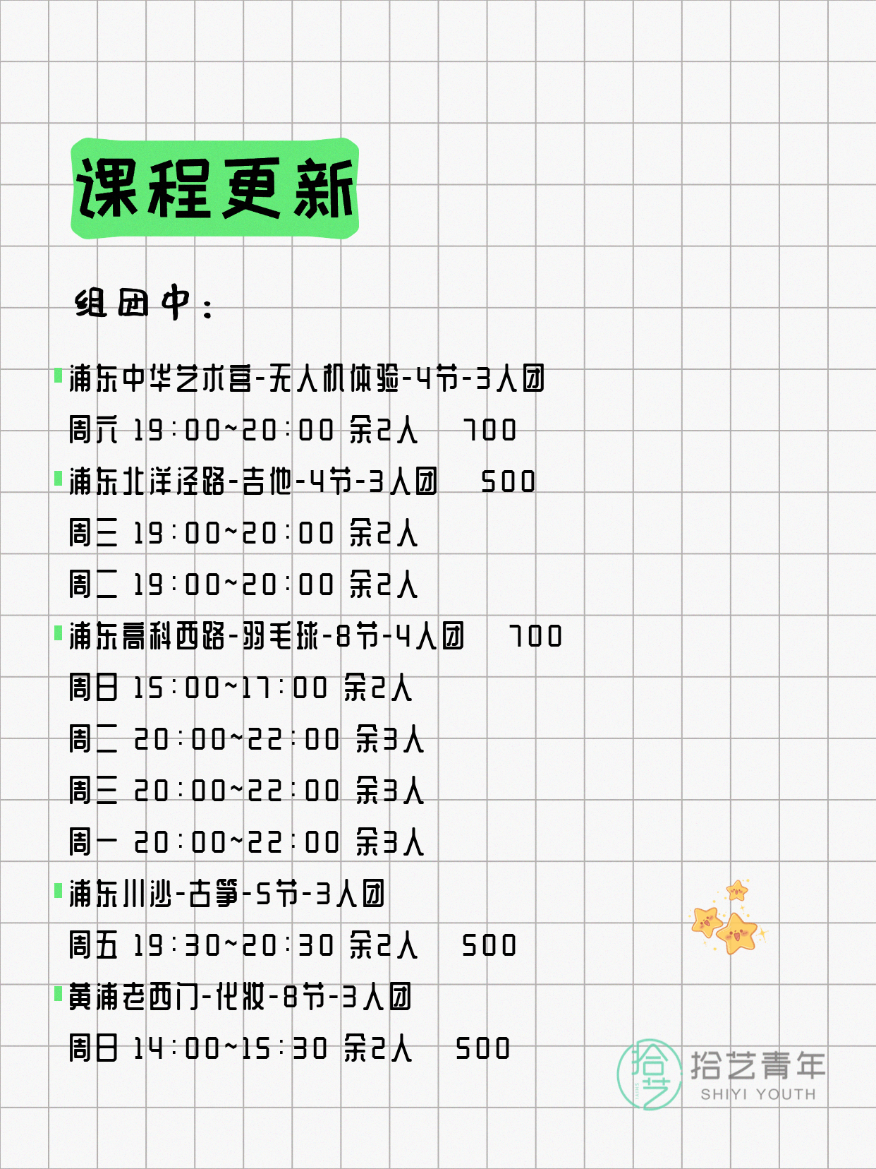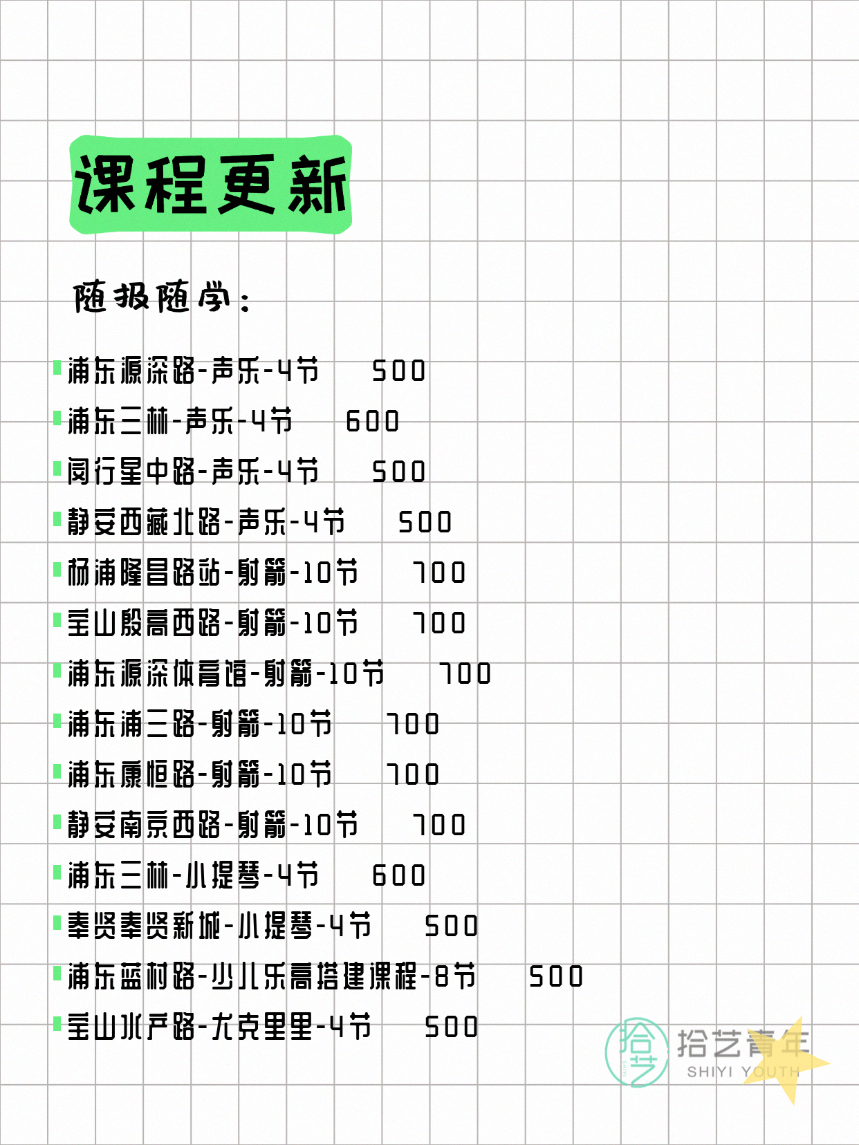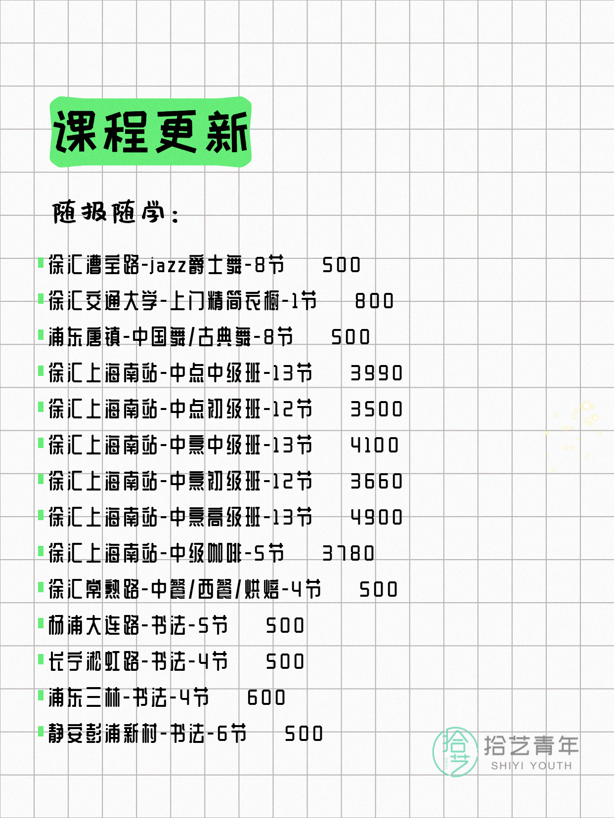资讯>综合>正文4月29日上海夜校课程合集拾艺青年2026-04-291 / 17📊 本期课程概况• 总课程数:664门• 组团中课程:71门• 覆盖区域:15个区详见图片,欢迎报名咨询。💡 提示:以上课程信息来自拾艺青年小程序,课程可能随报名动态变化,具体以小程序实时信息为准。👉 微信小程序链接:#小程序://拾艺青年/WmfwH22mnQUxZwb